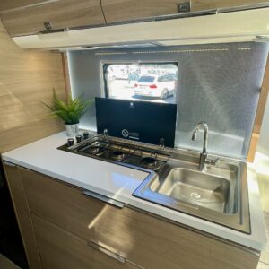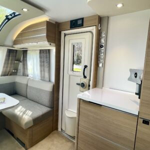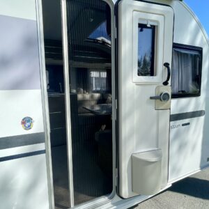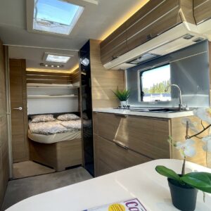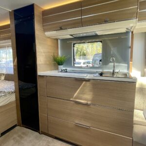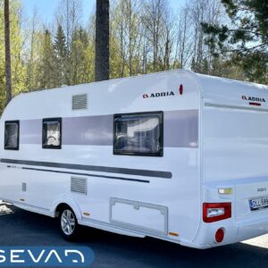 Tule avaamaan Adrian ovi ja ihastu! Värimaailma ei sisustassa riitele, vaunu on visuaalisesti todella tyylikäs. Etuosassa on mukavat sohvat ja tilaa helposti neljälle. Keittiö on tyylikäs ja toimiva kokonaisuus. Adrialla yleensä mietitään keittiöiden visuaalista puolta ja tämäkin hivelee silmää. Kaappitilaa on reilusti ja vedettävät alakaapit käytössä ihan ehdottomat. Pitkä jääkaappi palvelee varmasti kaikkia vaunun nälkäisiä asukkeja. Vaunun takaosasta löytyy parisänky sekä WC/suihkutila. Vaunua lämmittää tottakai nestekiertoinen Alde. Iso panoraamaikkuna on kauniiden kesäaamujen ilo.