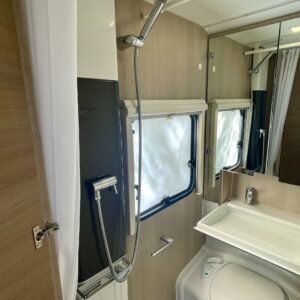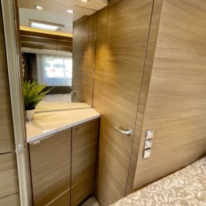 Pyöräteline, Pitkittäinen parivuode, Alde- nestekiertoinen keskuslämmitys, Sähköpatruuna, Suihku, Lattialämmitys (sähkö), Kasettiverhot, Kasetti WC, Liesi, liesituuletin, Jääkaappi, Pakastelokero, Parivuode, Tukijalat, Pesuallas, Markiisi