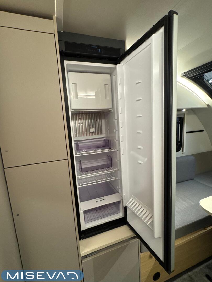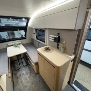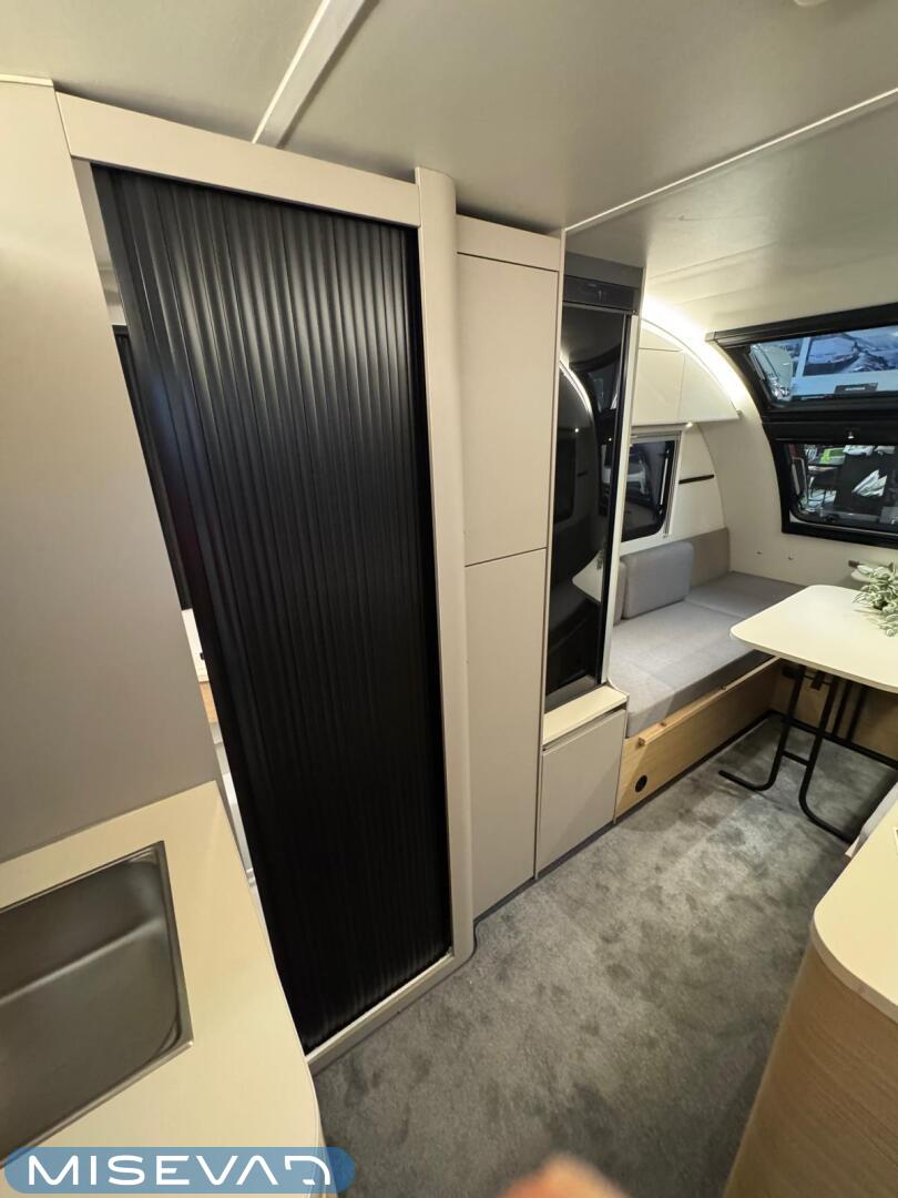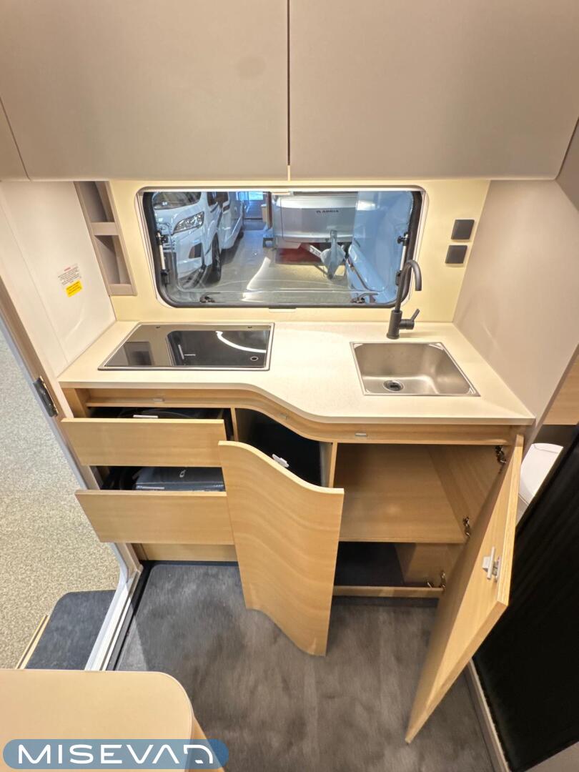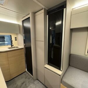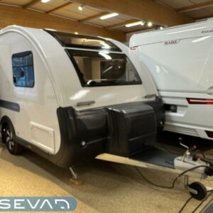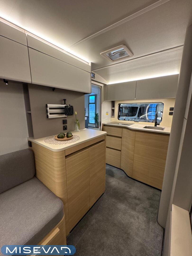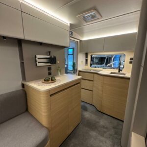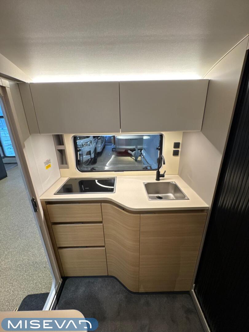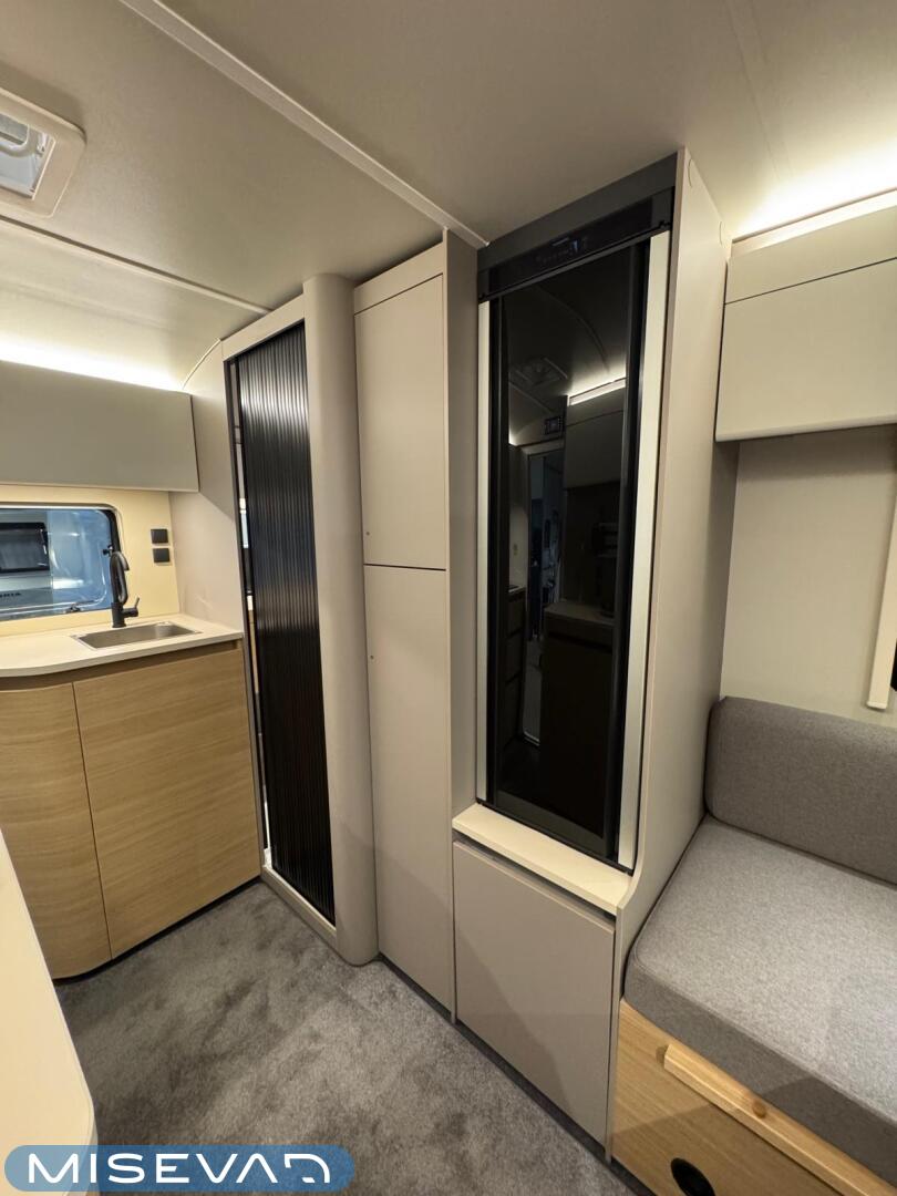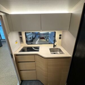 Peräpäästä löytyy WC- tilat ja keittiösaareke. Kompakteista ulkomitoista huolimatta vaunuun on saatu mahtumaan 133- litrainen jääkaappi ja sopivasti erimuotoista säilytystilaa.