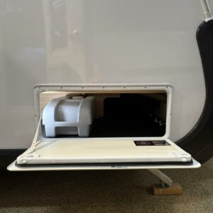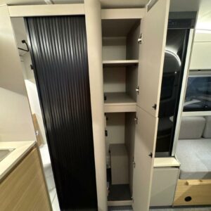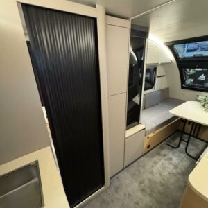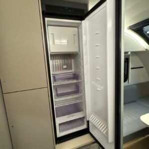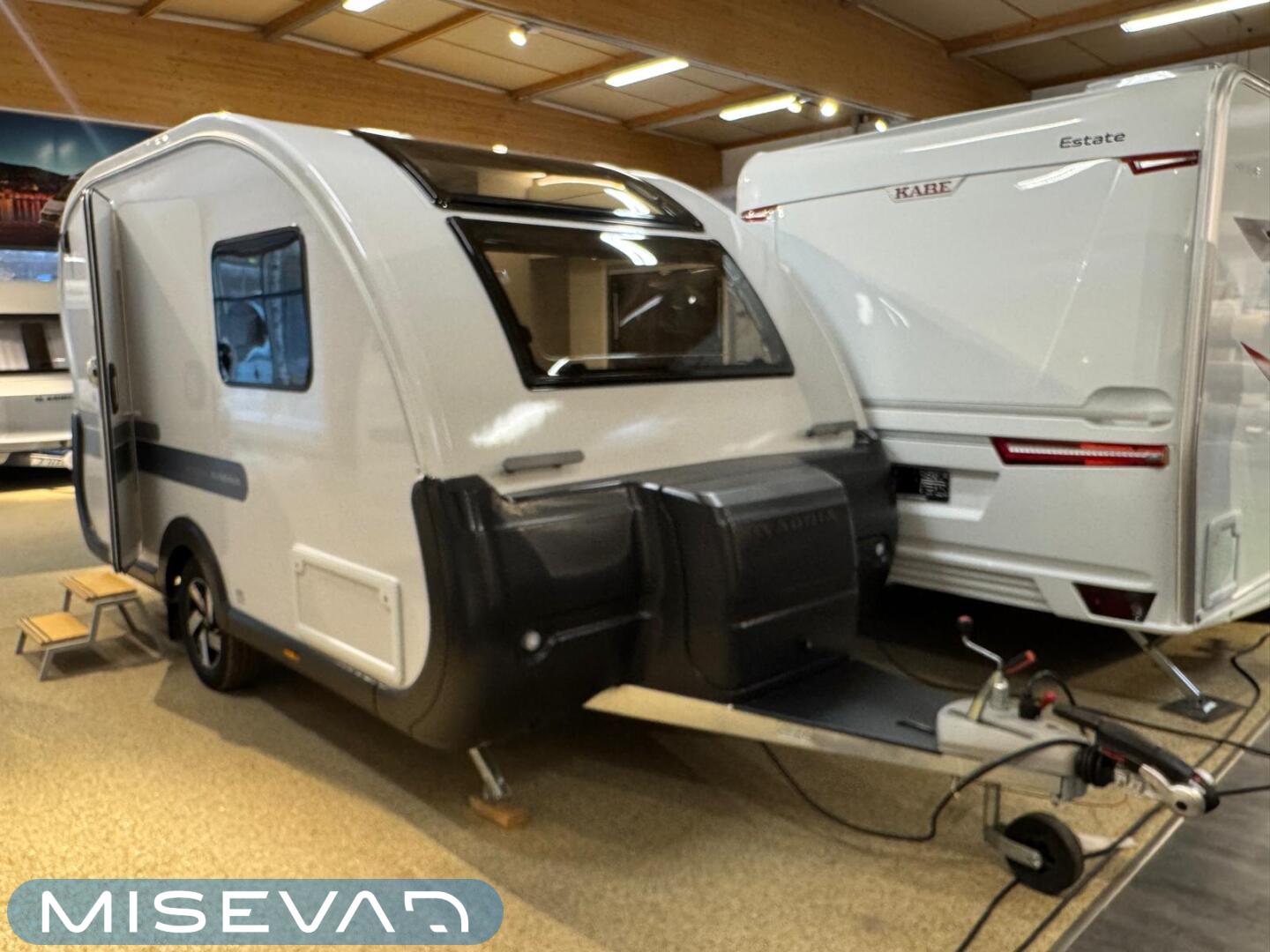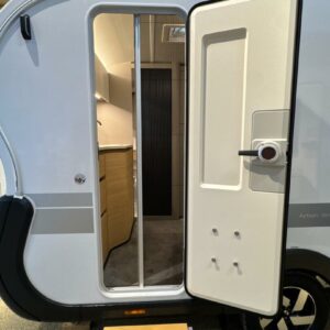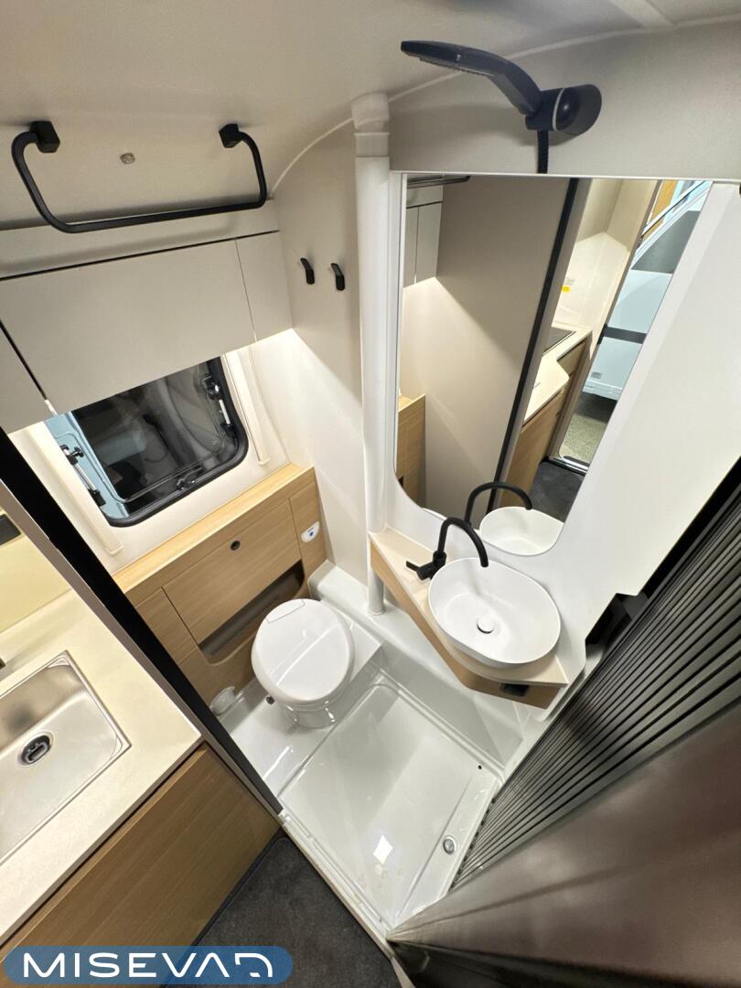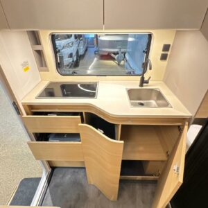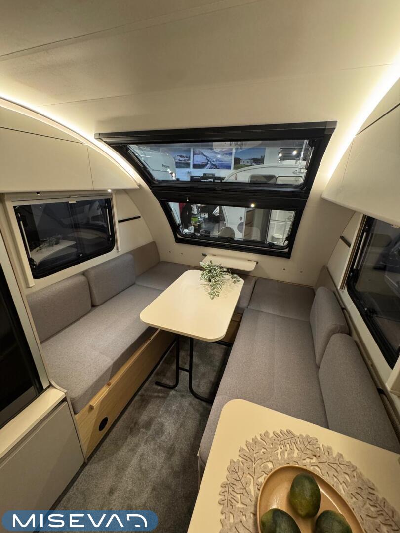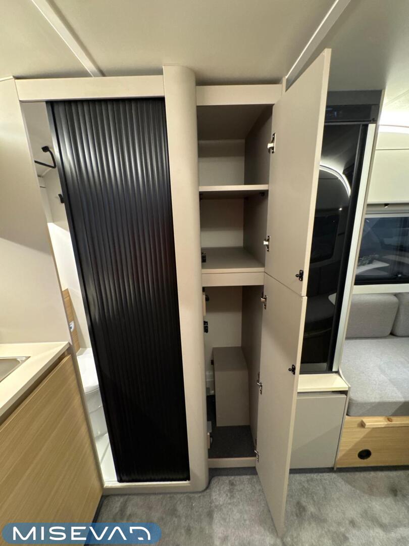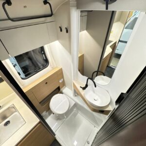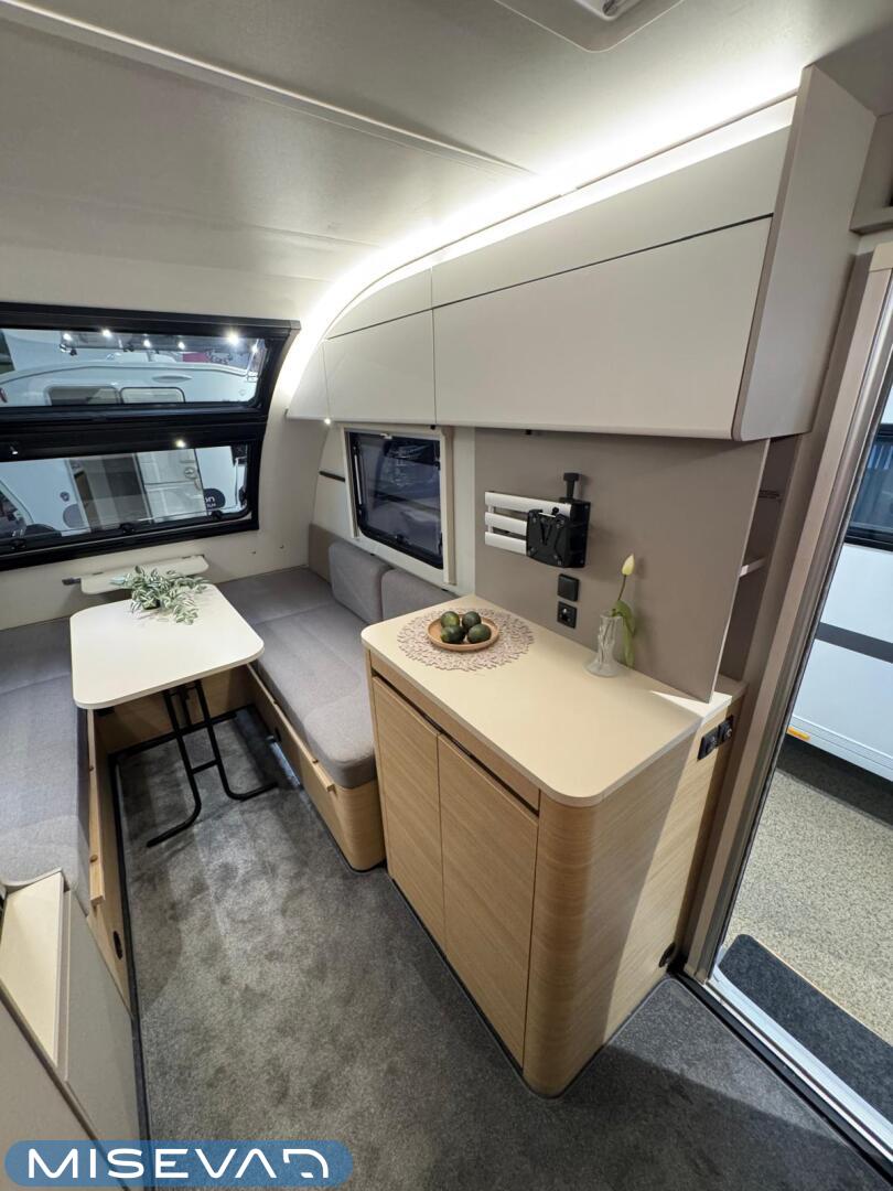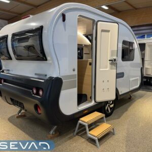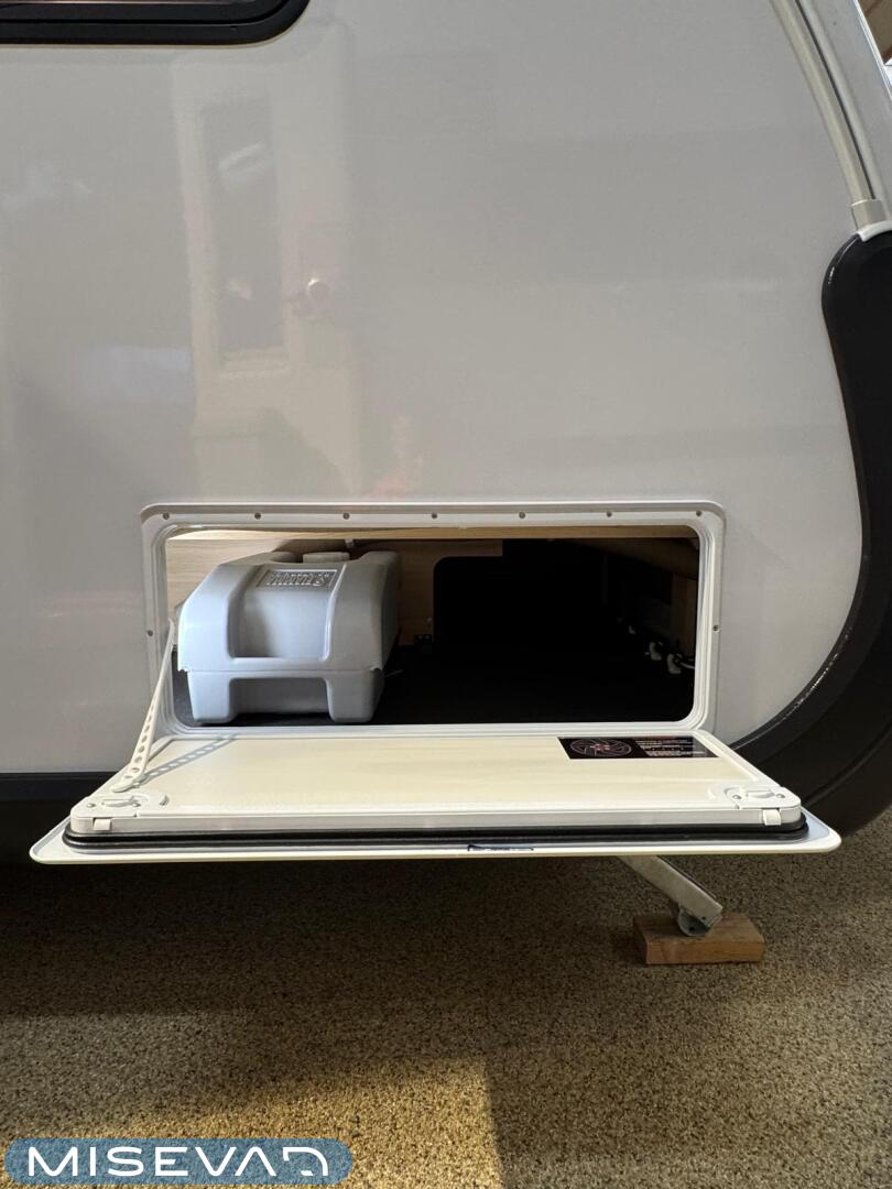 Peräpäästä löytyy WC- tilat ja keittiösaareke. Kompakteista ulkomitoista huolimatta vaunuun on saatu mahtumaan 133- litrainen jääkaappi ja sopivasti erimuotoista säilytystilaa.