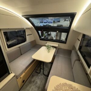 Action LH- pohjaratkaisu tarjoaa toimivat tilat moneen käyttötarkoitukseen. Viihtyisä ja valoisa pöytäryhmä muuttuu kädenkäänteessä koko vaunun levyiseksi megavuoteeksi, johon mahtuu sopuisasti kolmekin henkeä nukkumaan.
