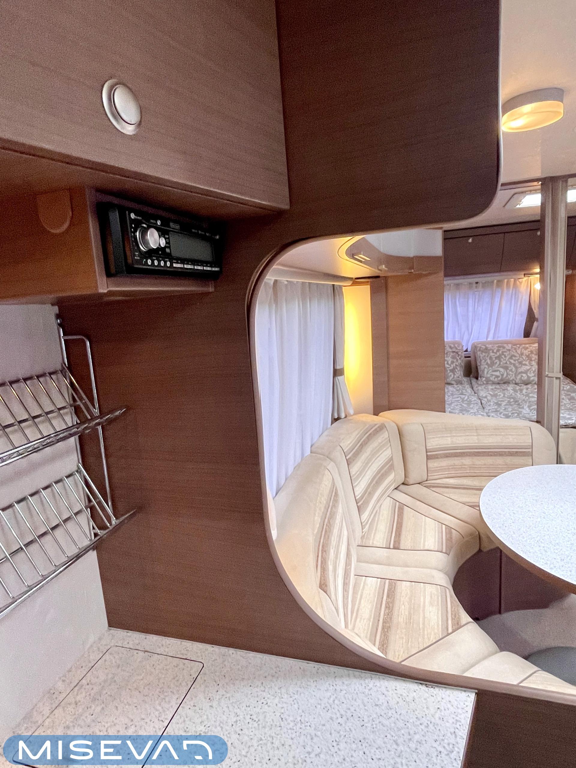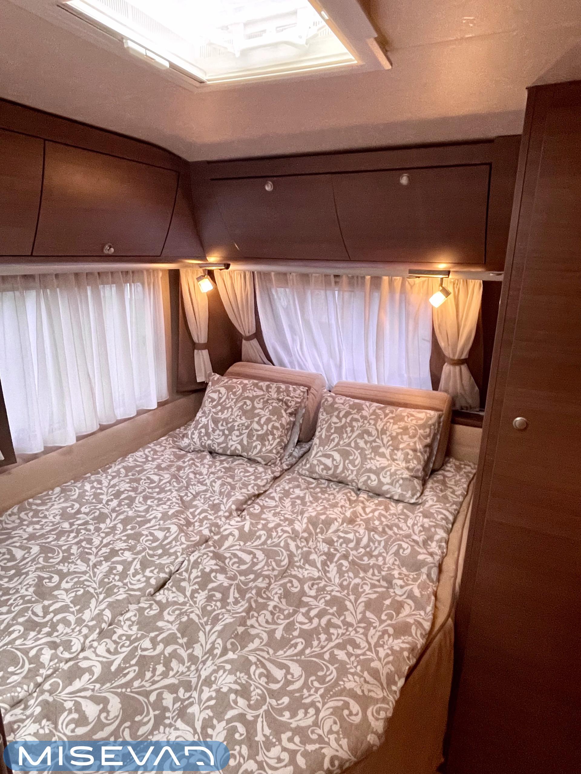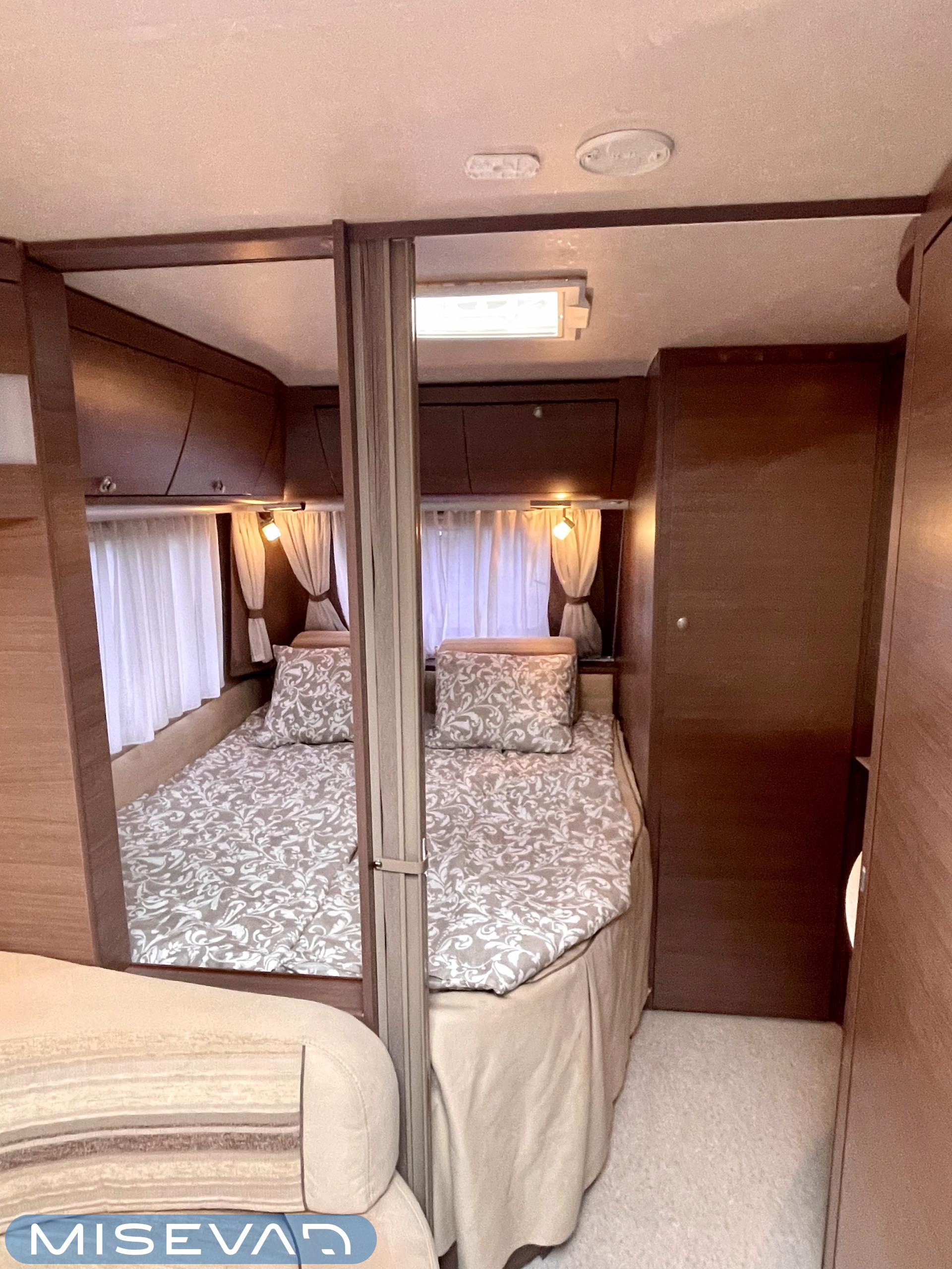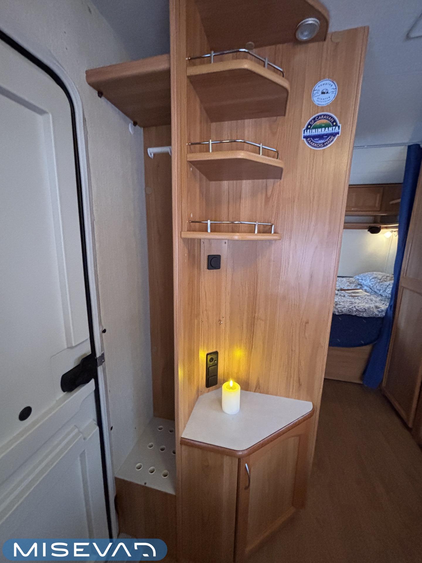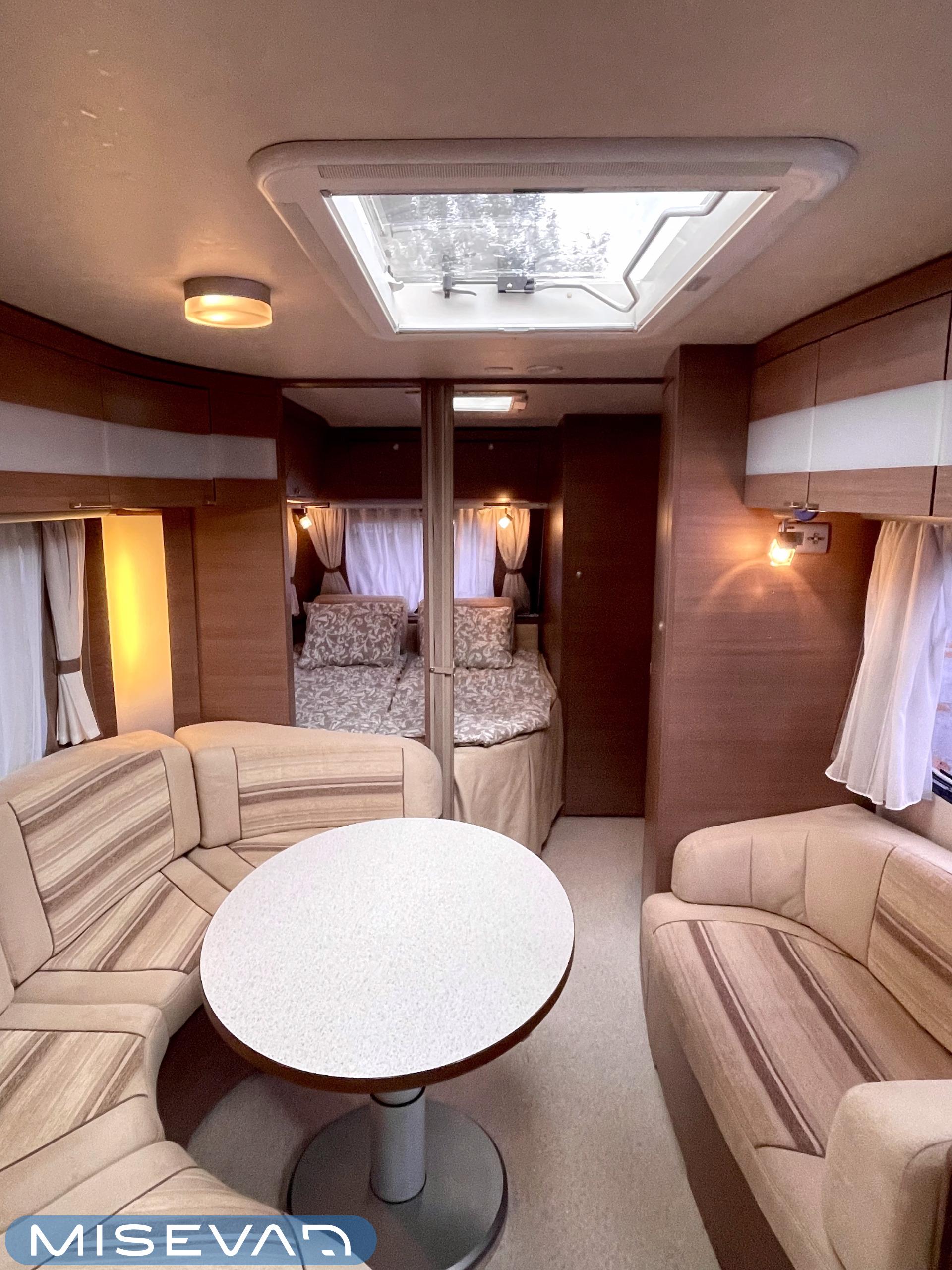 Alde, Jääkaappi, Kasetti WC, Lattialämmitys, Liesi, Nestekiertolämmitys, Pakastelokero, Parivuode, Pesuallas, TV-antenni tai lautasantenni, Takakeittiö, Markiisi, kwh-mittari, mover, sähkön ulosotto, Lämminvesiboileri, Kattoluukku, Radio, Tukijalat