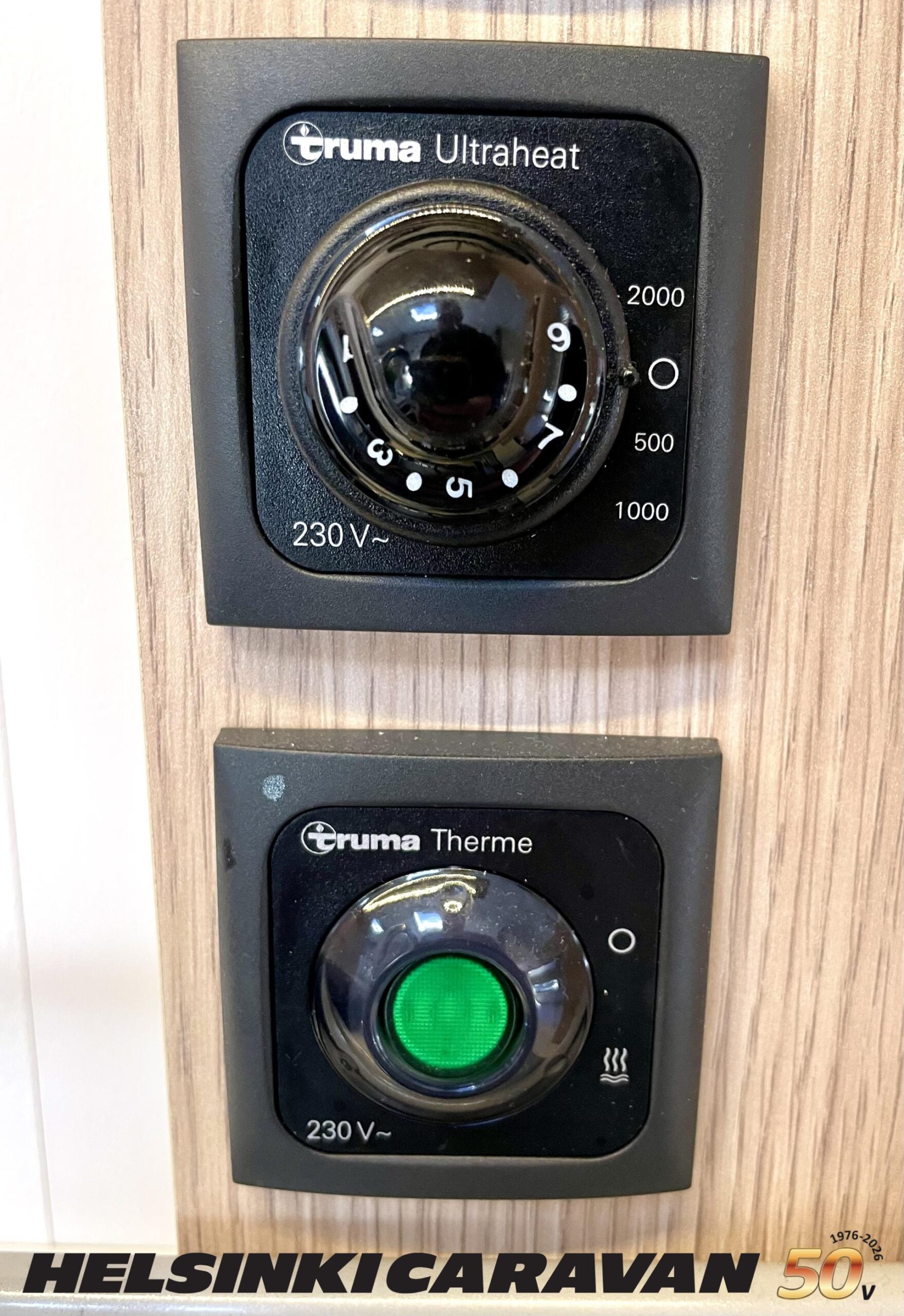 Alde, Aurinkopaneeli, Erikoisvanteet, Kaasu-uuni, Nestekiertolämmitys, Lämminvesiboileri, Markiisi, Pyöräteline, Mover, Erillisvuoteet, Jääkaappi, Kahdet renkaat, Kasetti WC, Kasettiverhot, Kattoluukku, Lattialämmitys, Lattiamatot asunto-osassa, Liesi, Pakastelokero, Pesuallas, Suihku, Sähköpatruuna, TV-antenni tai lautasantenni, Tukijalat, Äänentoistojärjestelmä, Lattialämmitys (sähkö), Ilmastointi (asuintila), 2 (ok) renkaat, Polkupyöräteline, Eristetty harmaavesisäiliö, liesituuletin, sähkön ulosotto, televisioteline, Asuinosan hyttysovi/verho
