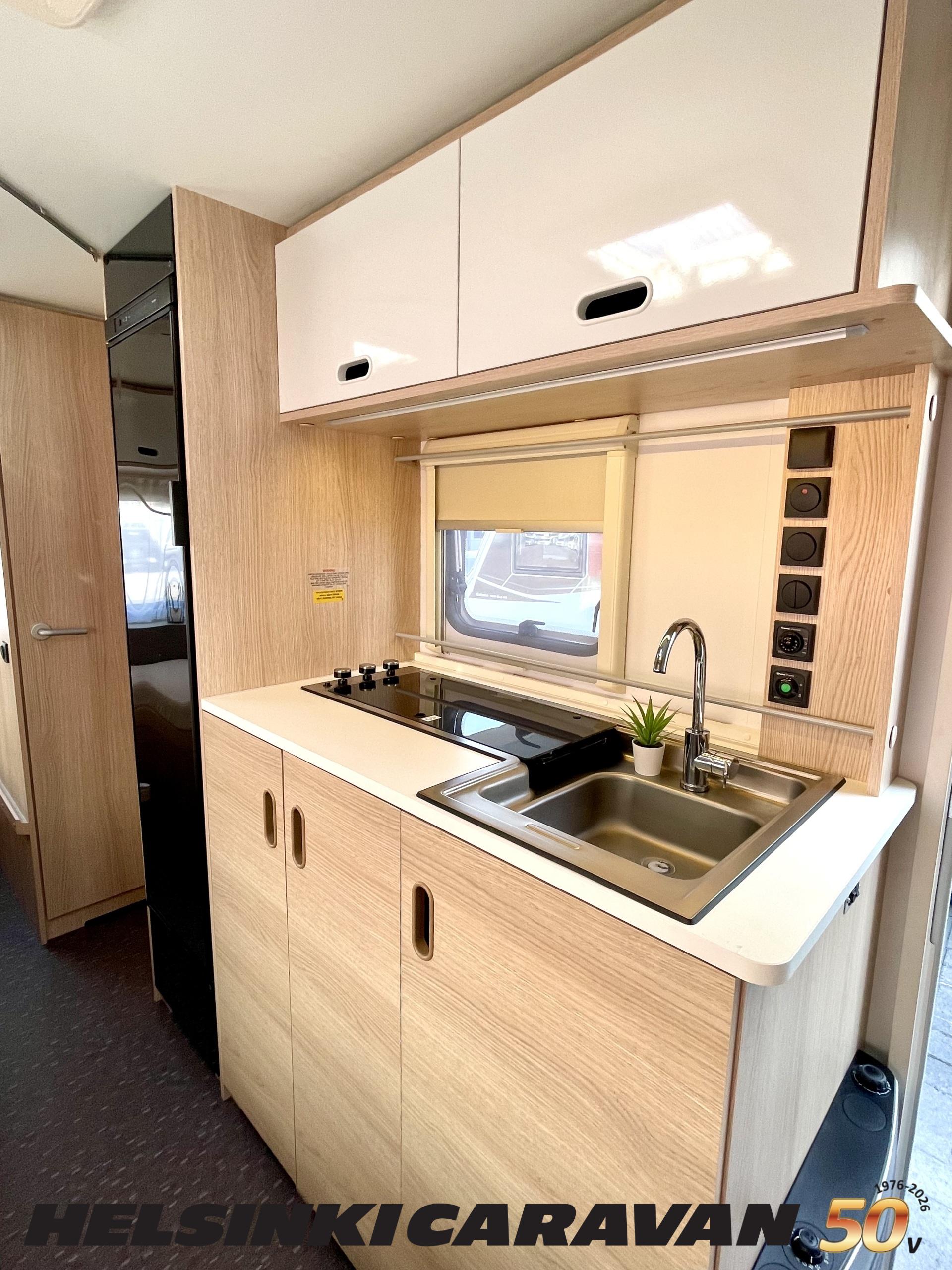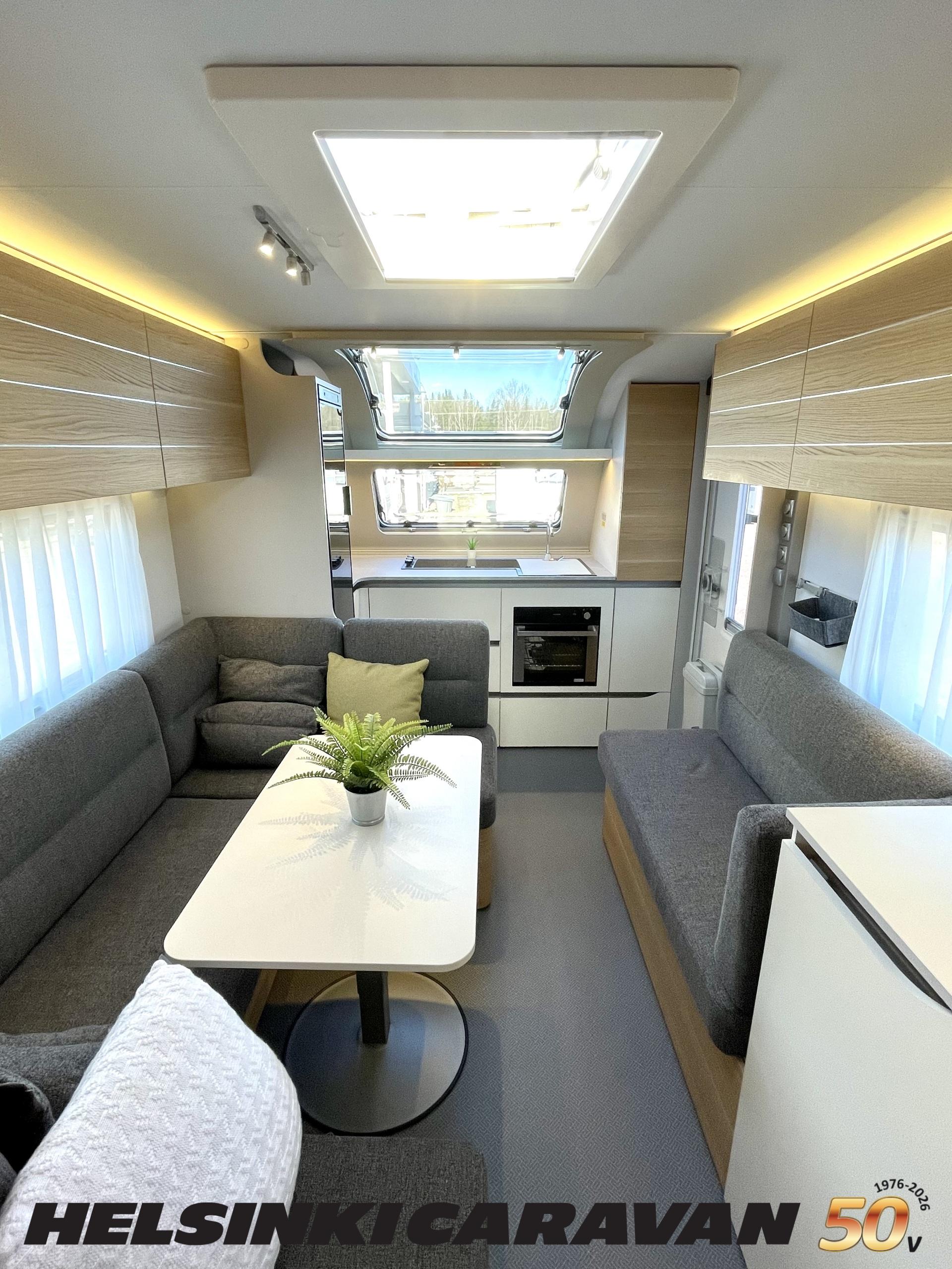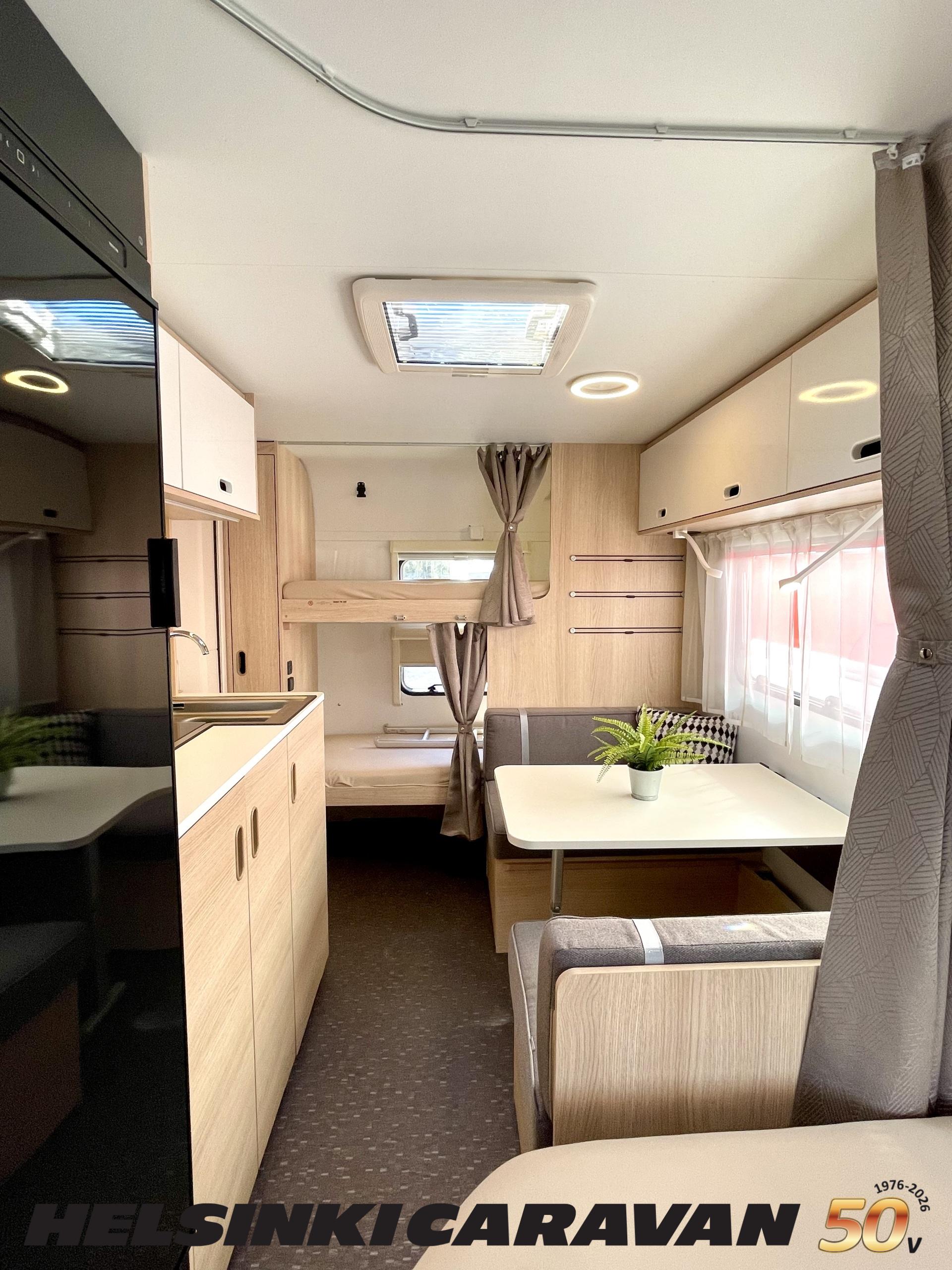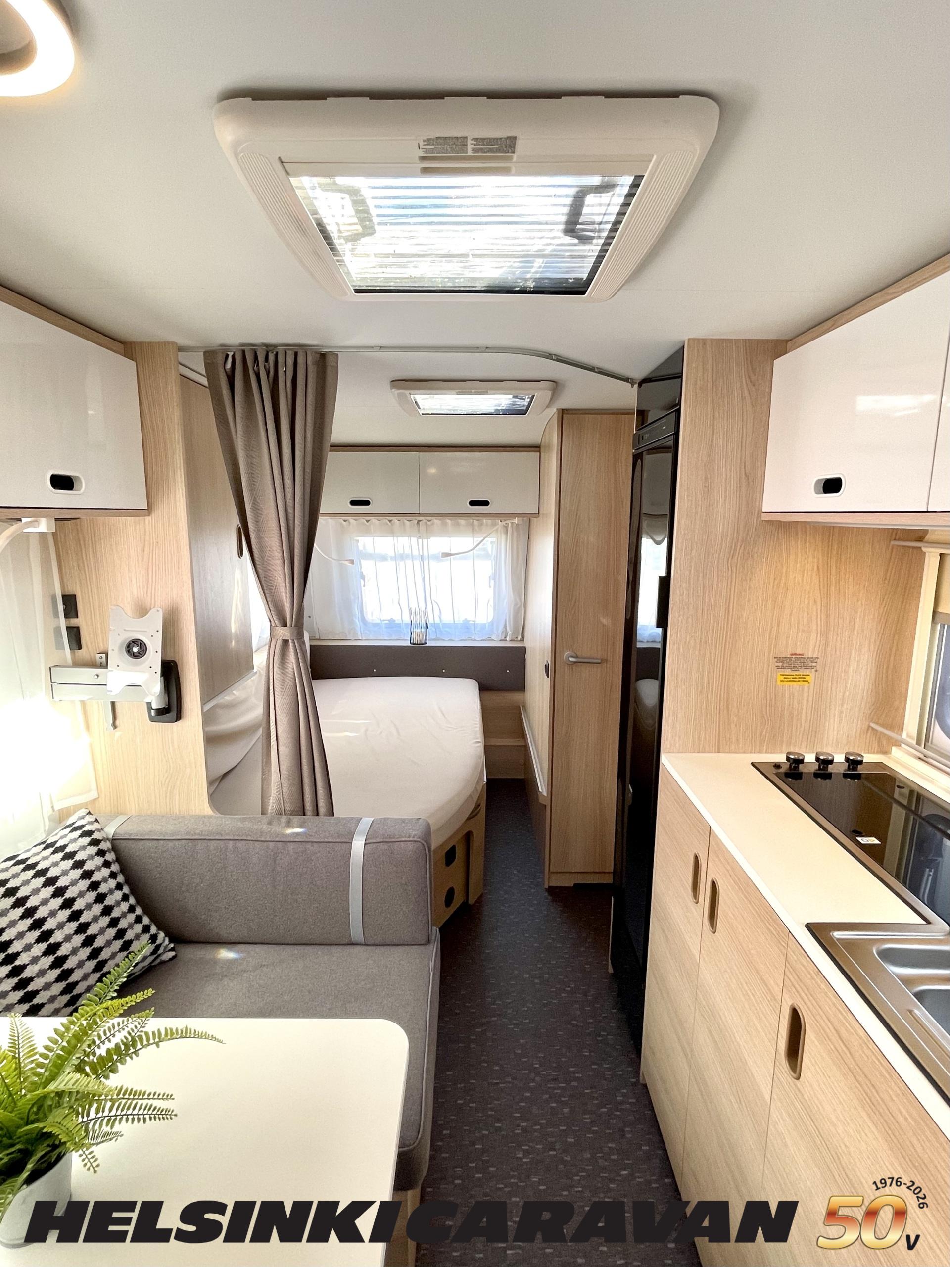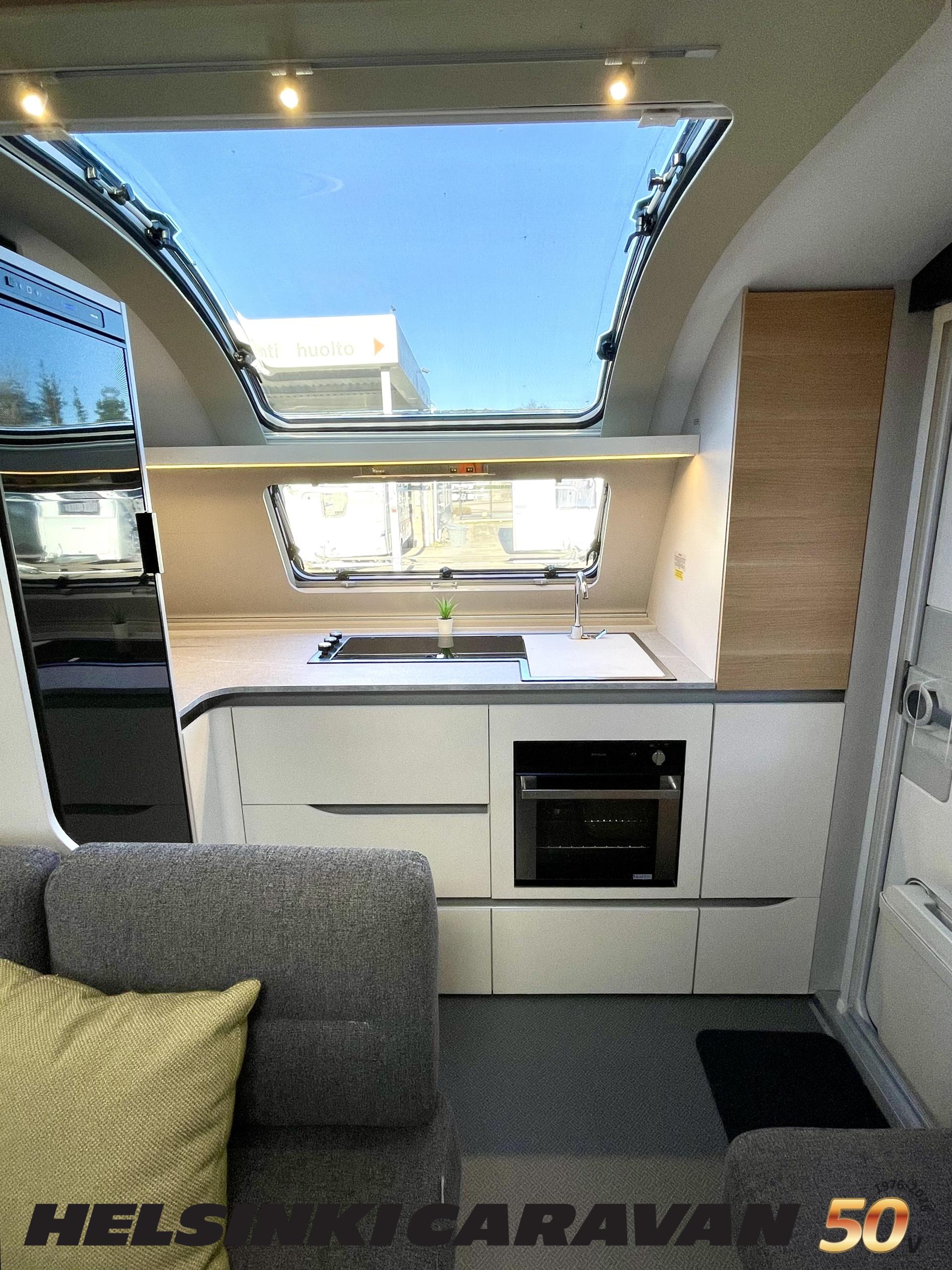 Etukeittiöpohjaratkaisu kasvattaa hiljalleen suosiotaan eikä tämänkään vaunun kohdalla tarvitse ihmetellä miksi. Mikäs siinä kokkaillessa ja nautiskellessa panoraamaikkunan tarjoamista maisemista.