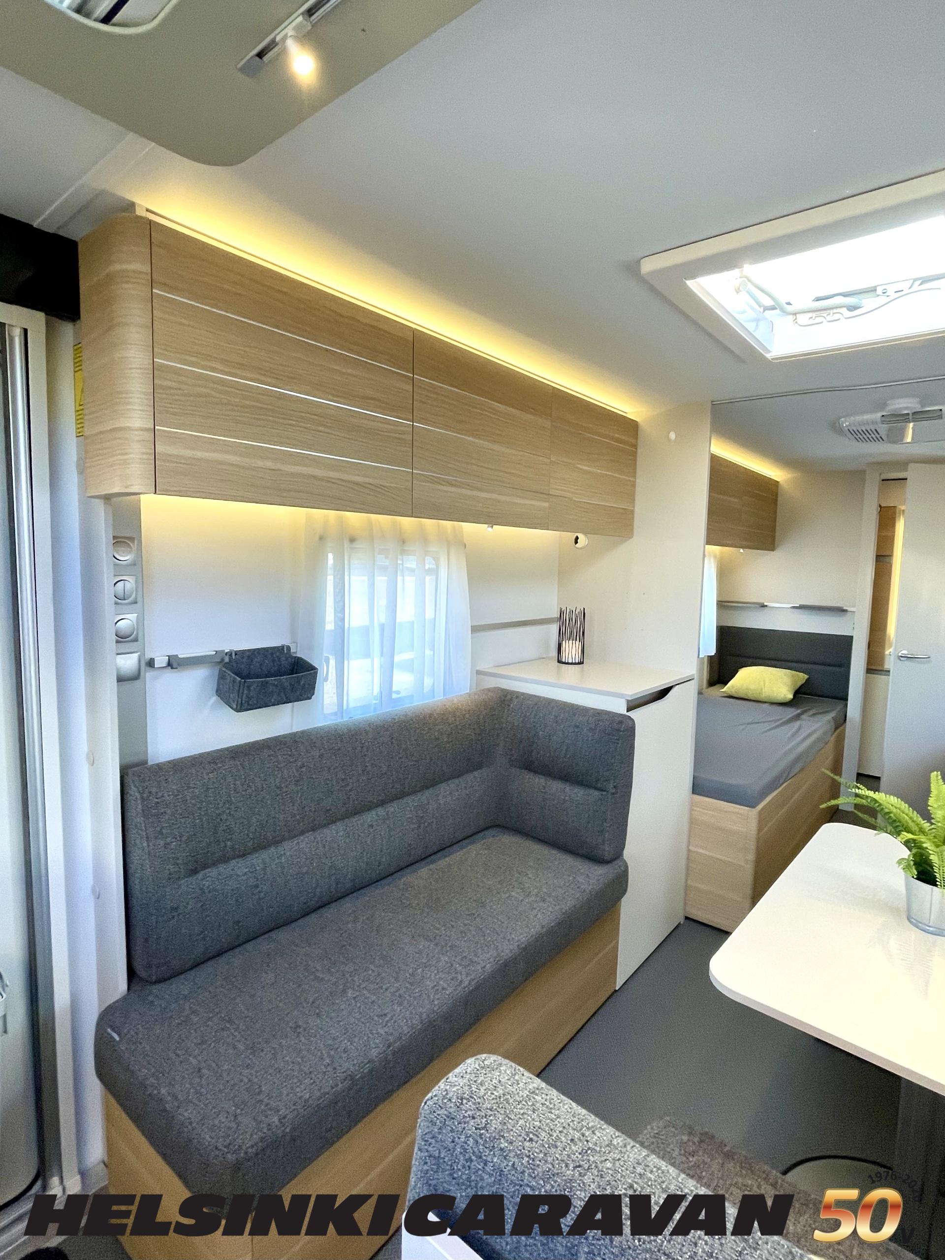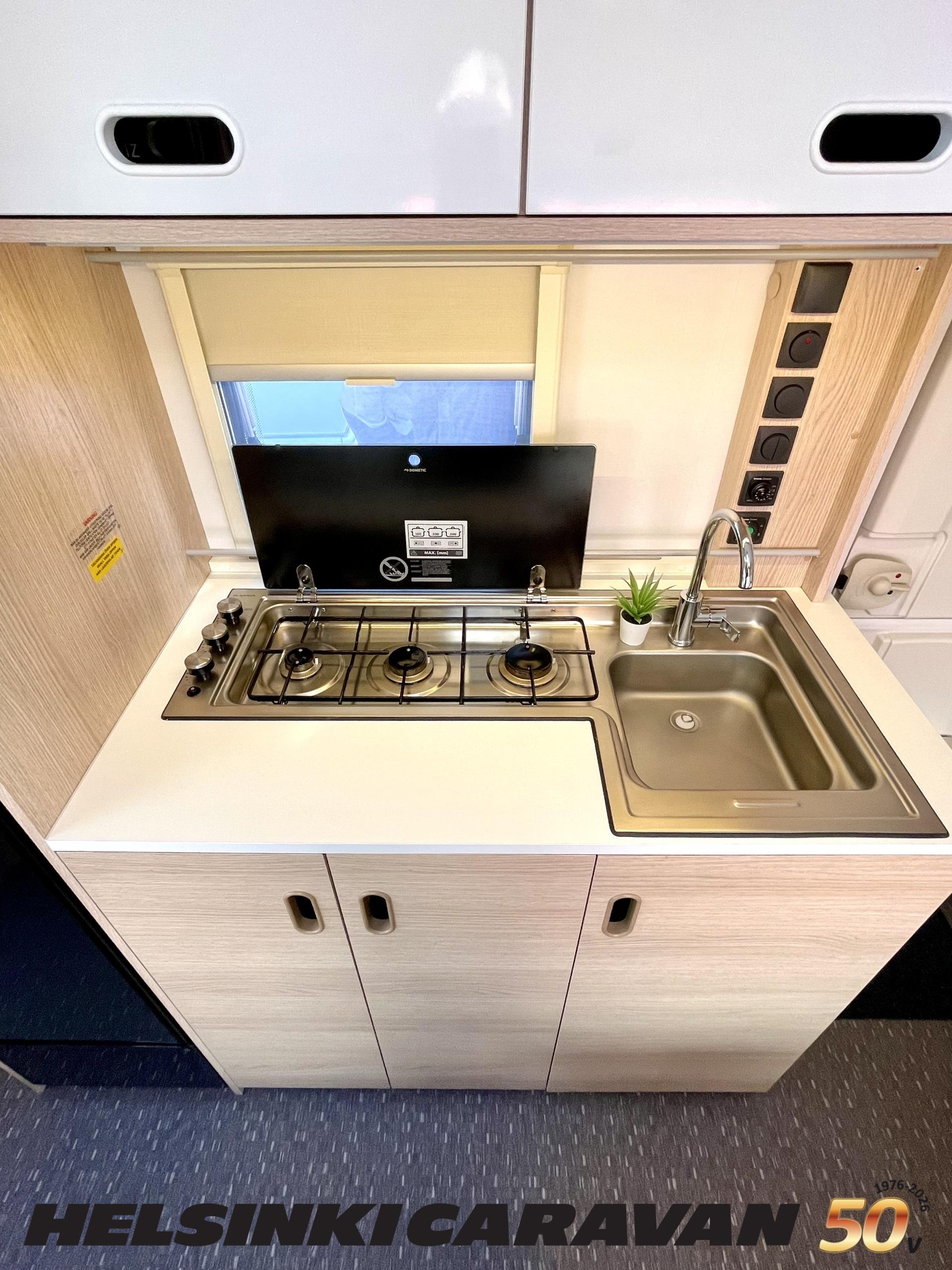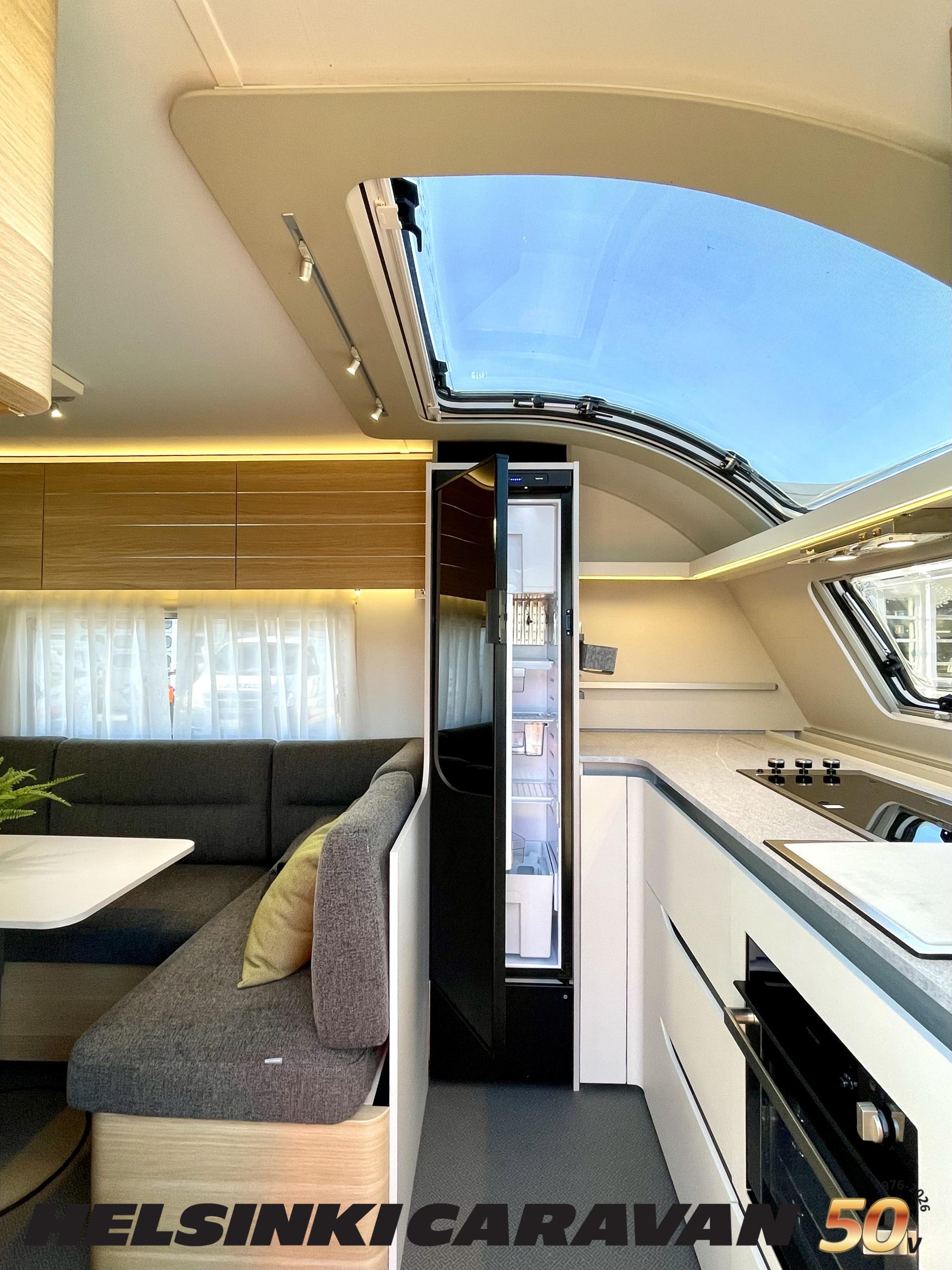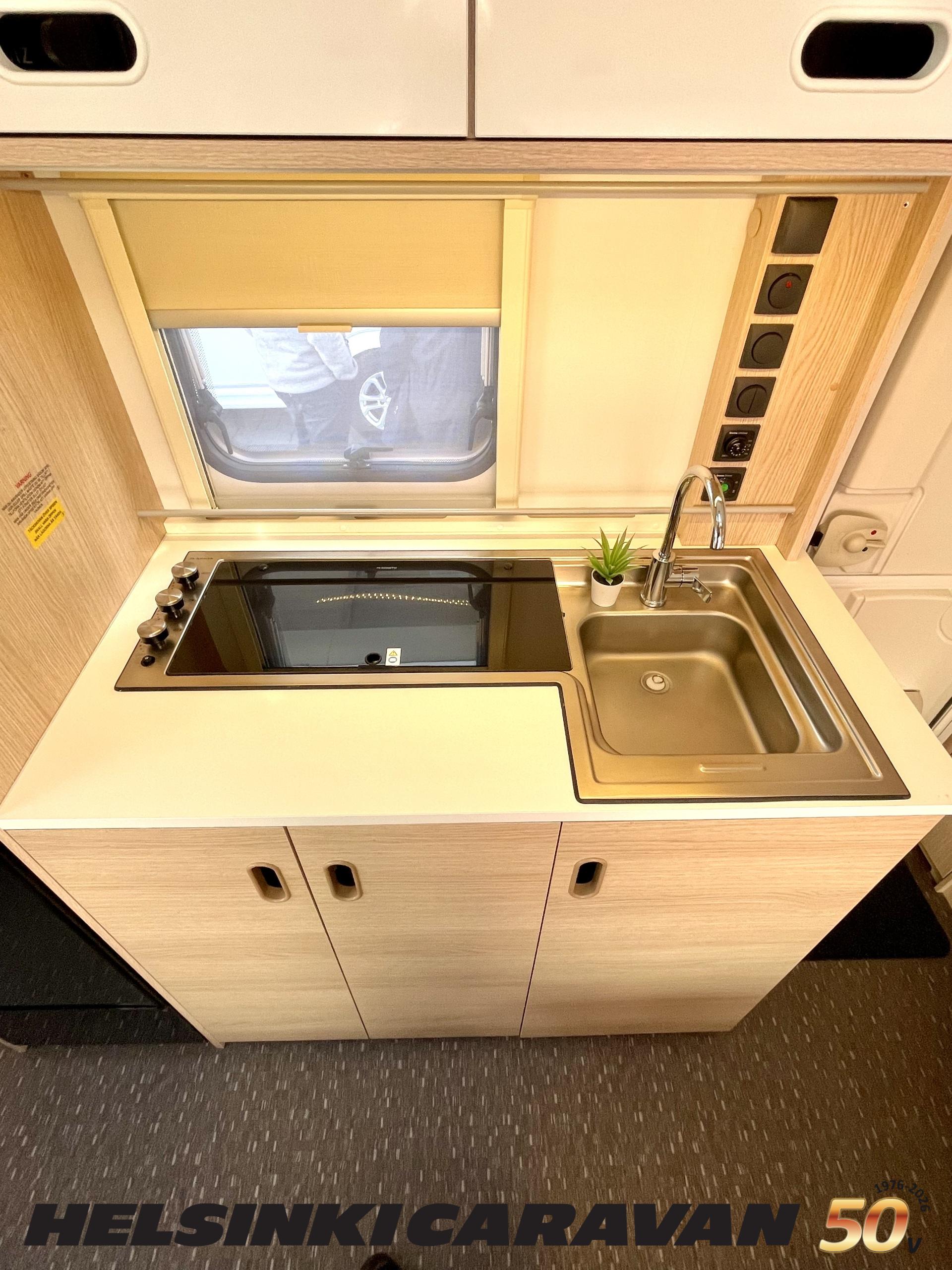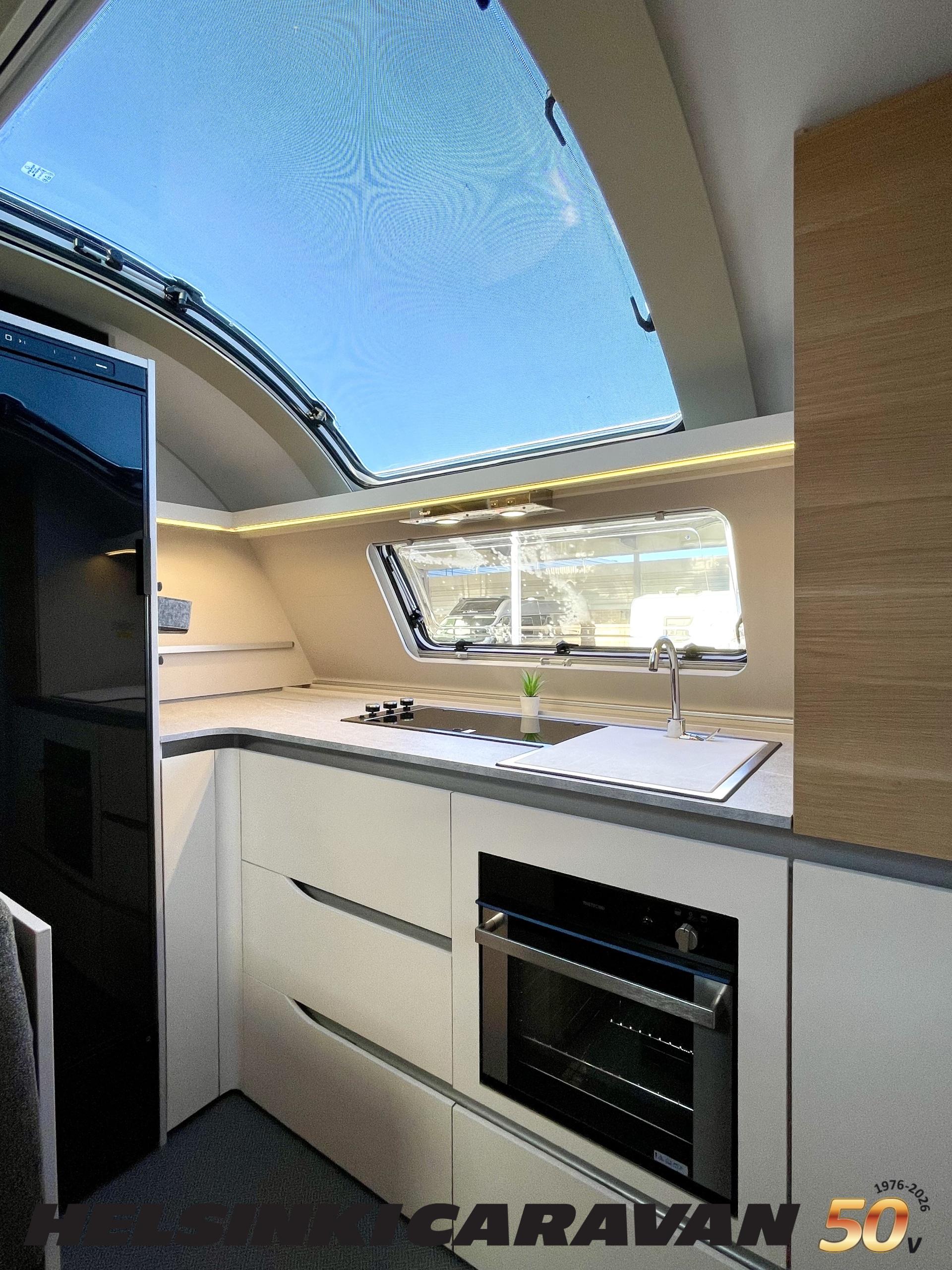Etukeittiöpohjaratkaisu kasvattaa hiljalleen suosiotaan eikä tämänkään vaunun kohdalla tarvitse ihmetellä miksi. Mikäs siinä kokkaillessa ja nautiskellessa panoraamaikkunan tarjoamista maisemista.
