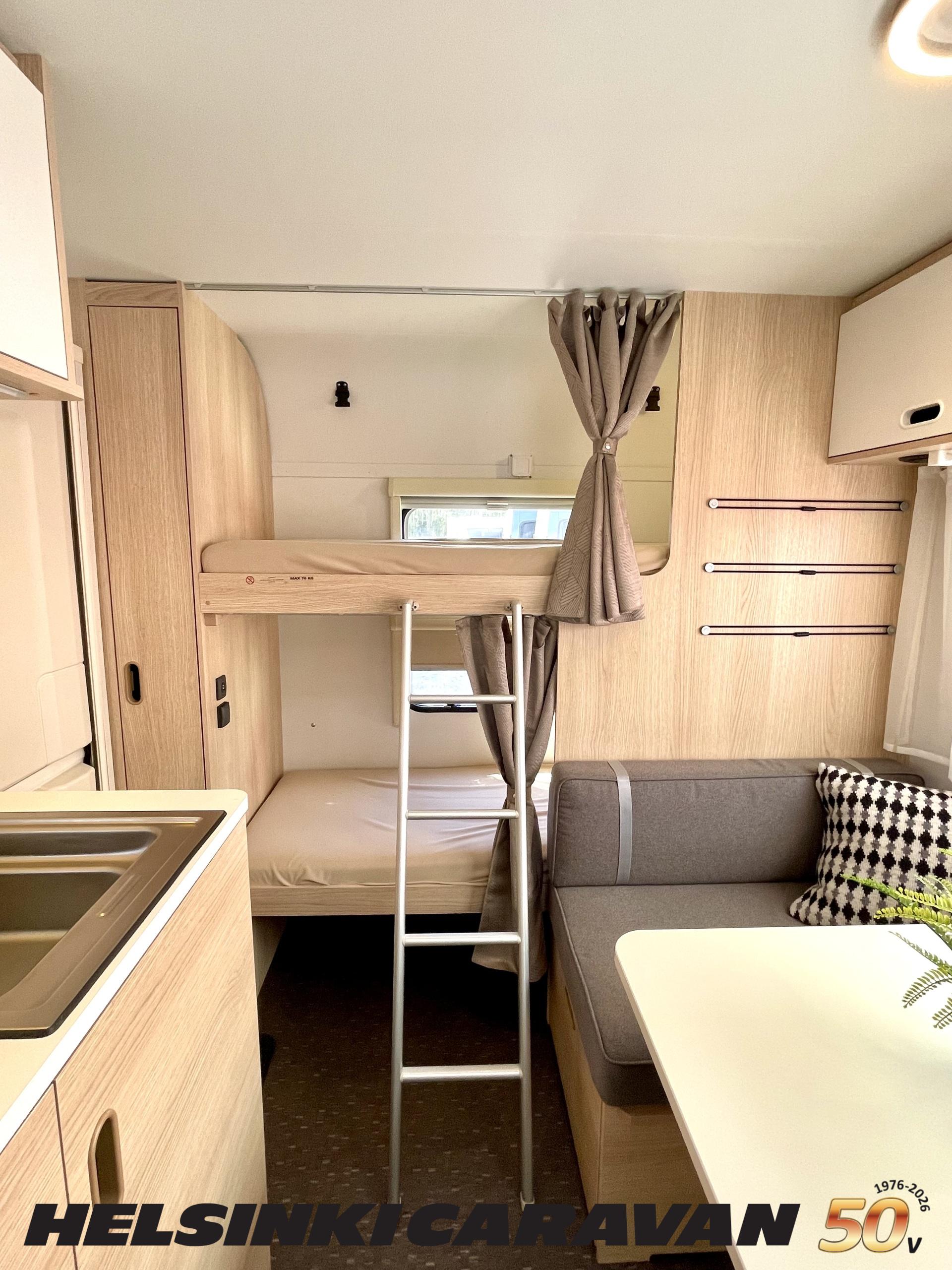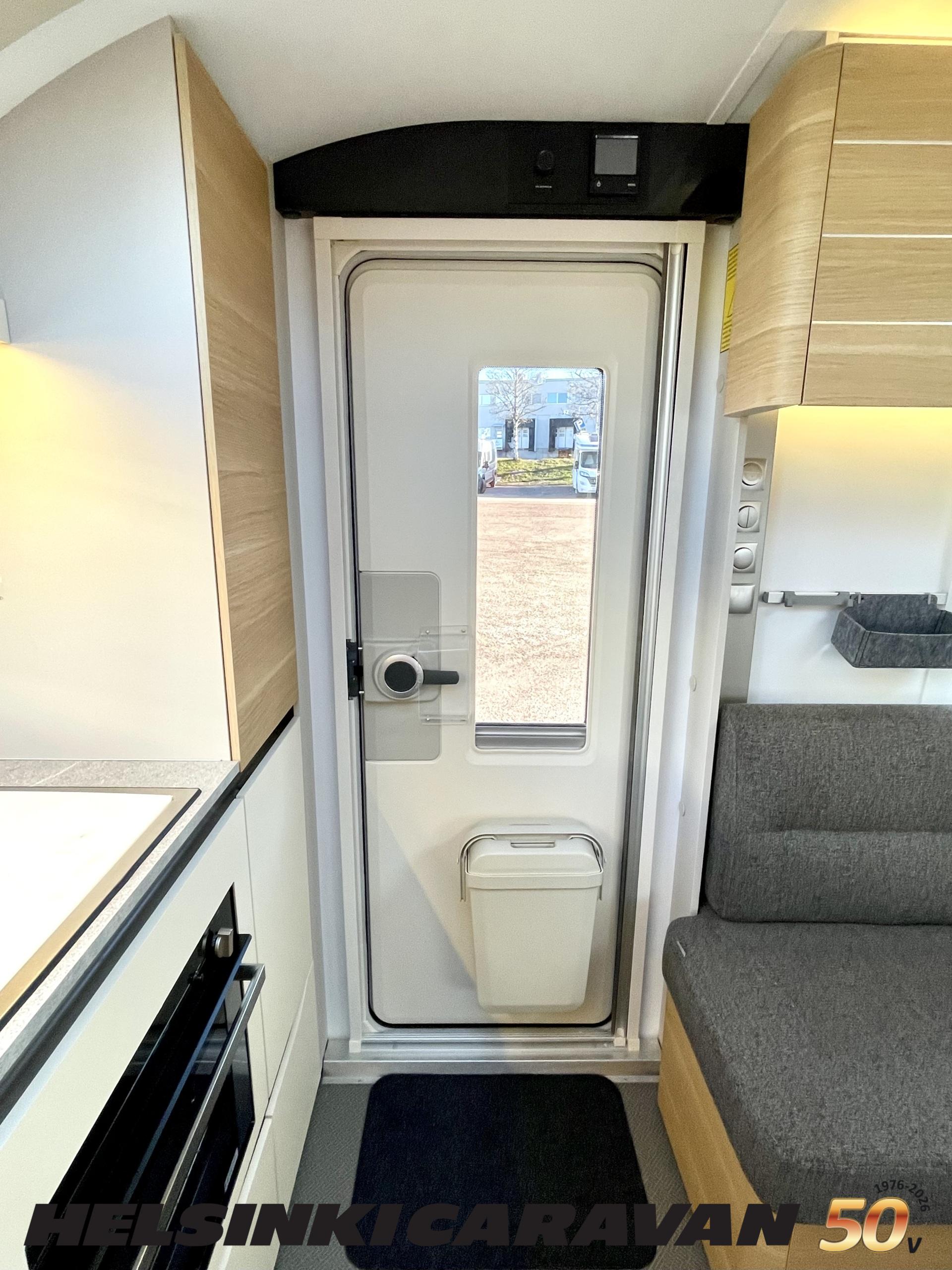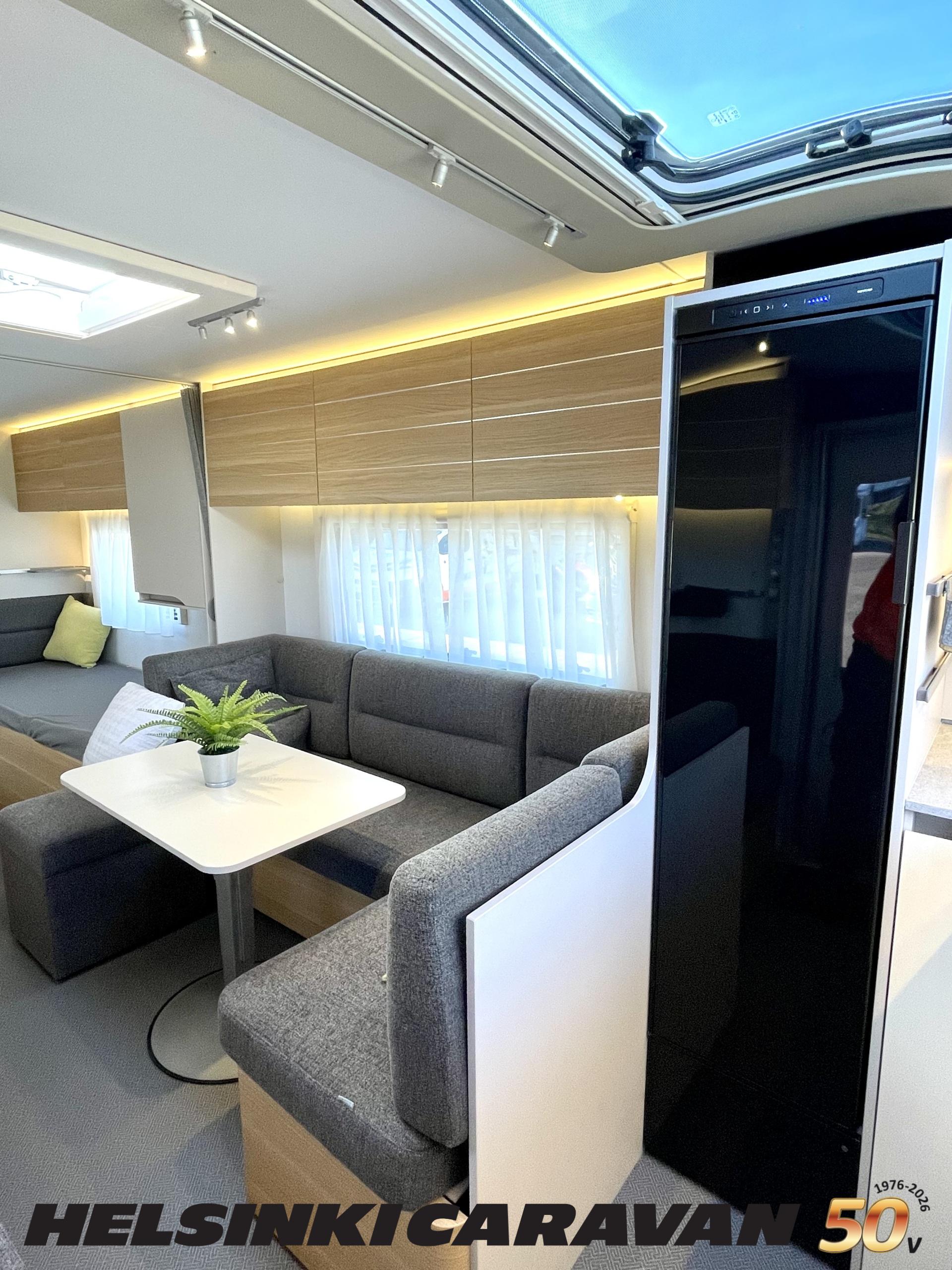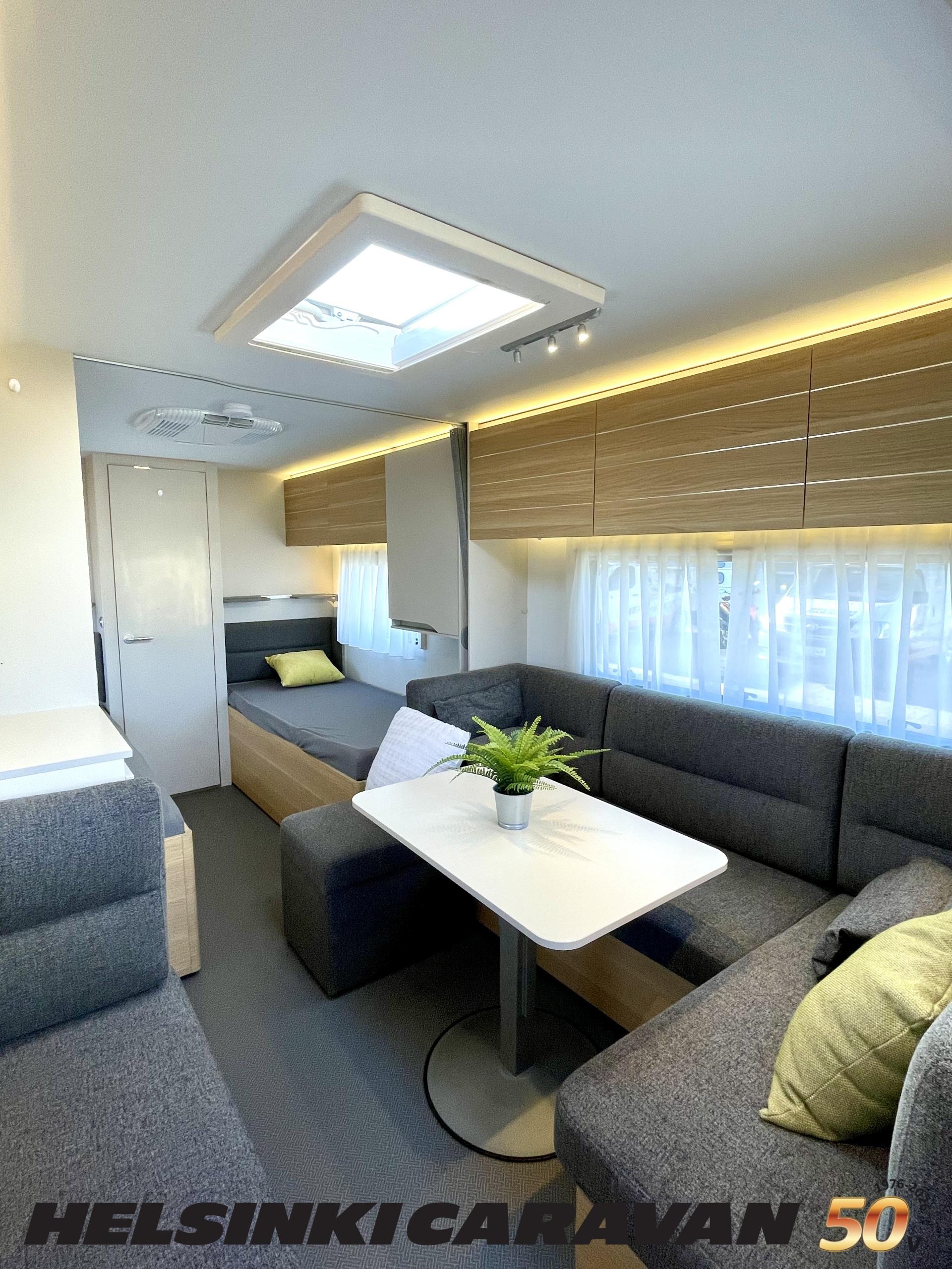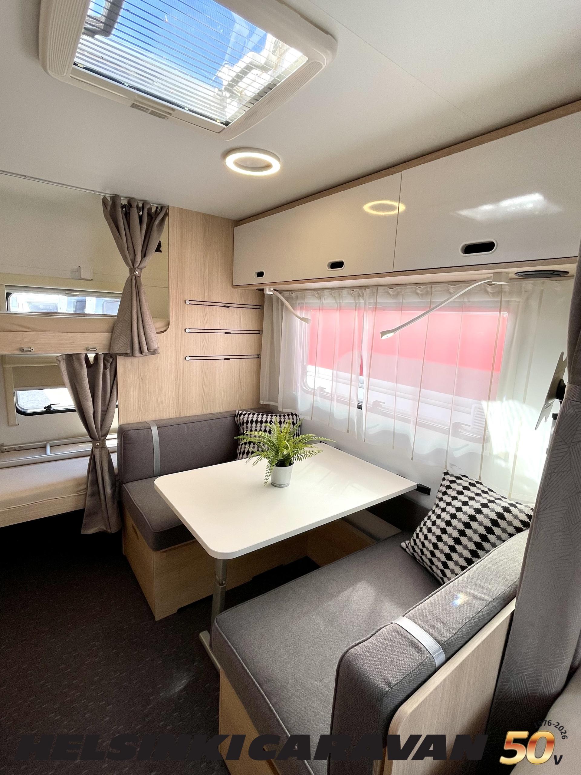Etukeittiöpohjaratkaisu kasvattaa hiljalleen suosiotaan eikä tämänkään vaunun kohdalla tarvitse ihmetellä miksi. Mikäs siinä kokkaillessa ja nautiskellessa panoraamaikkunan tarjoamista maisemista.