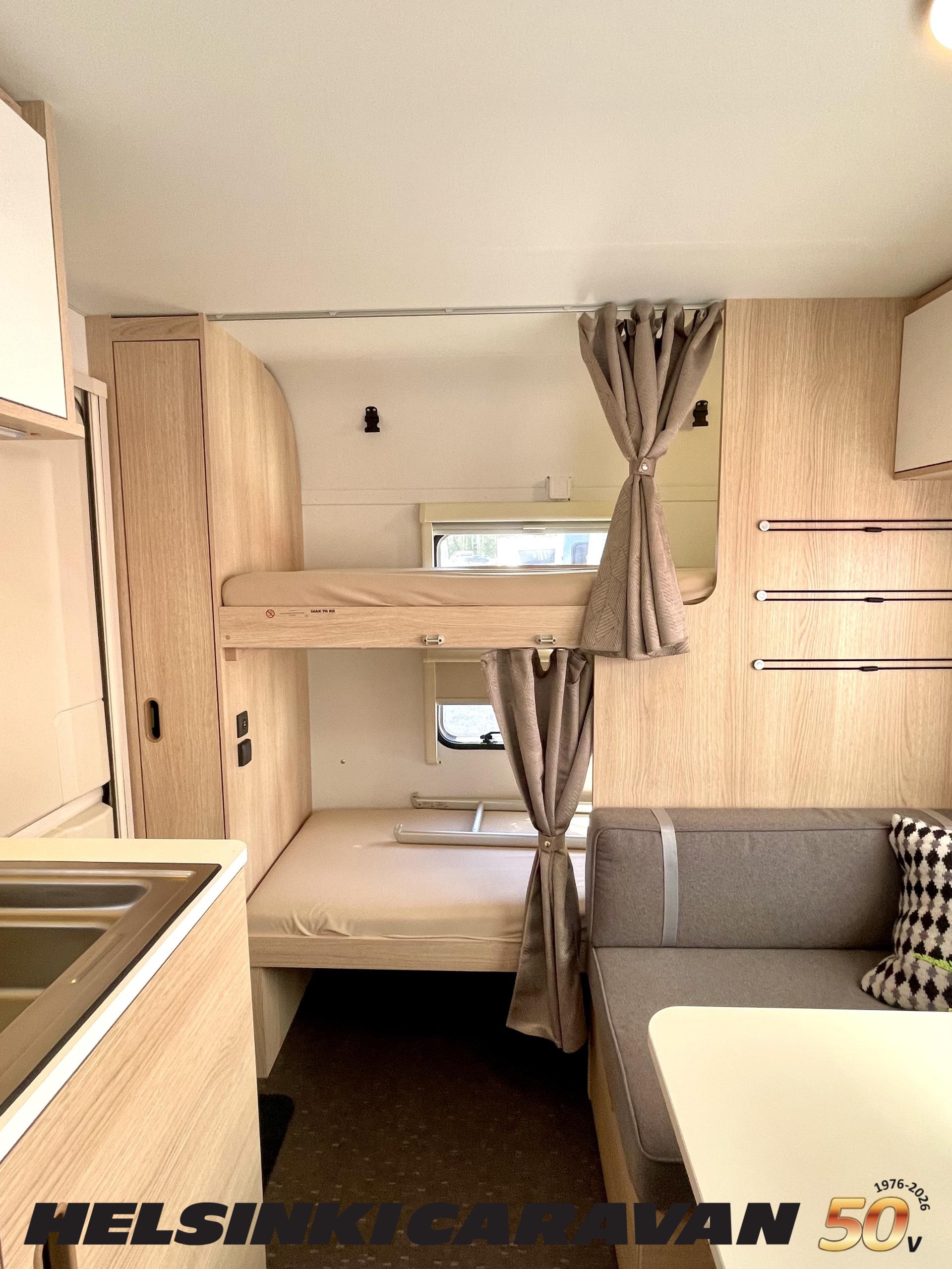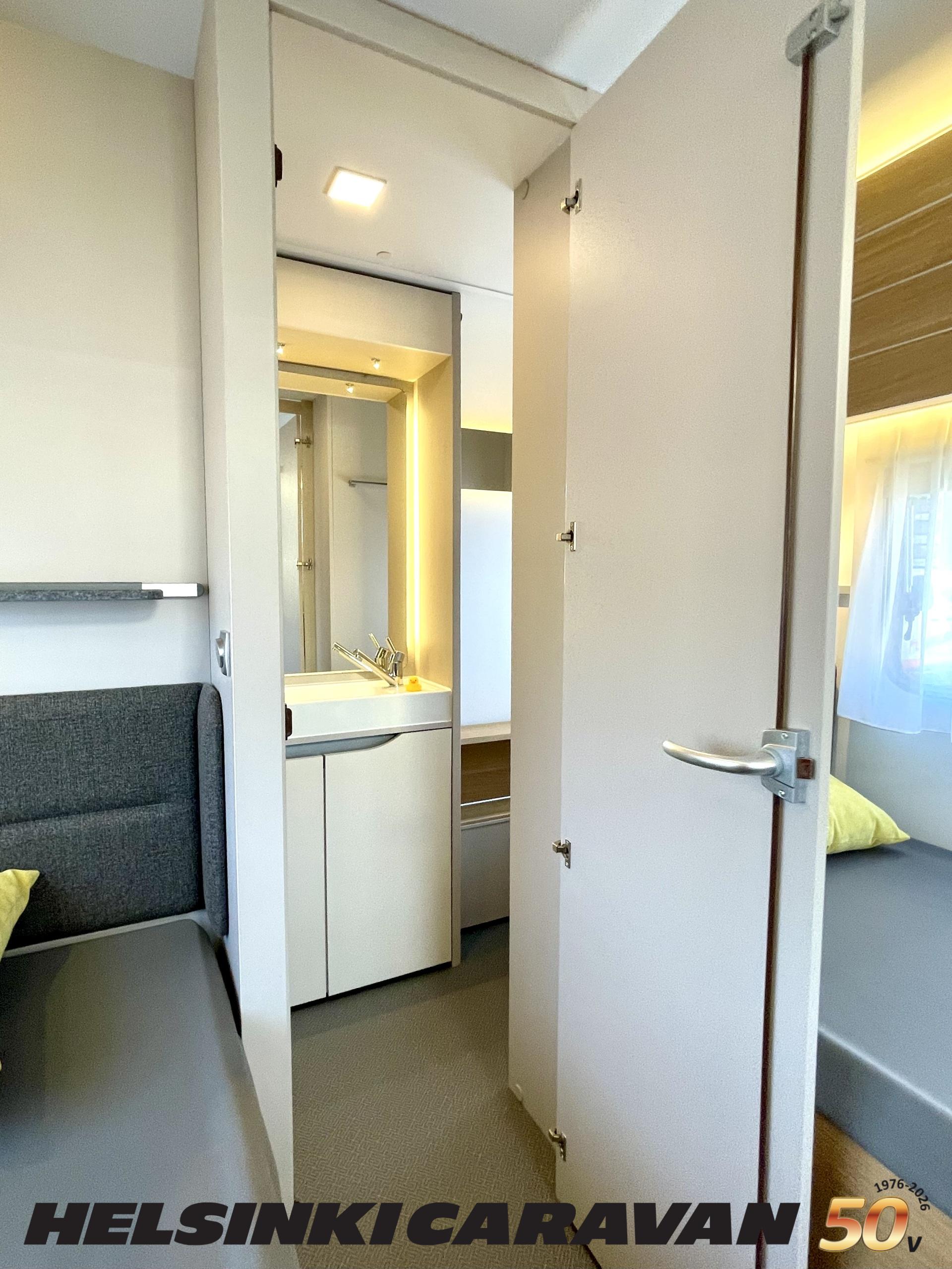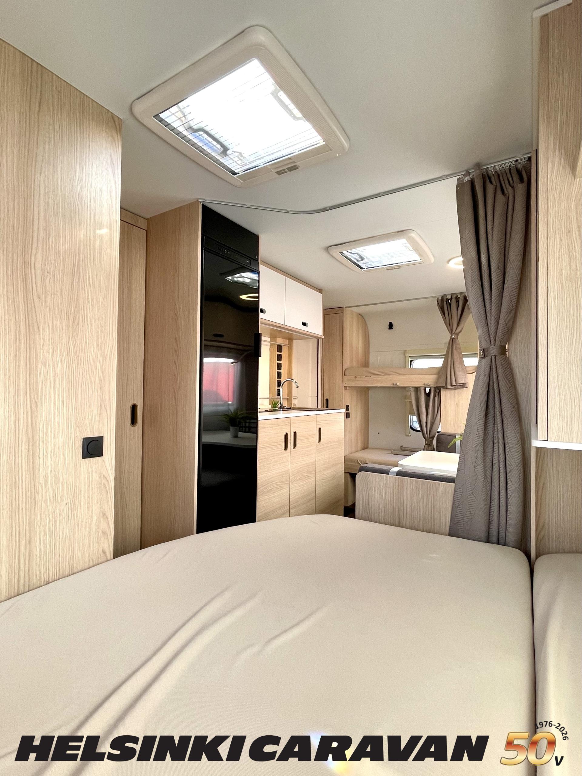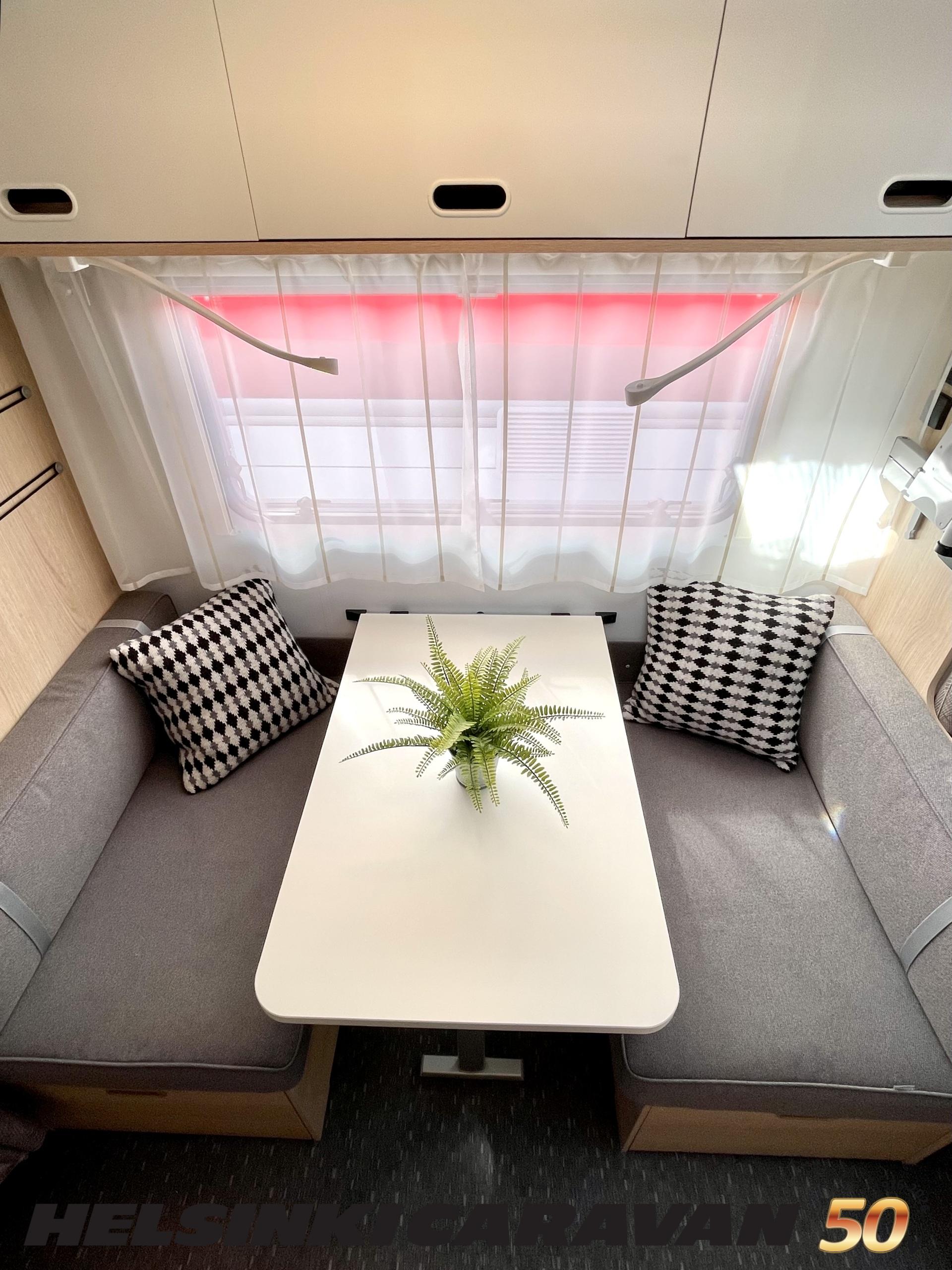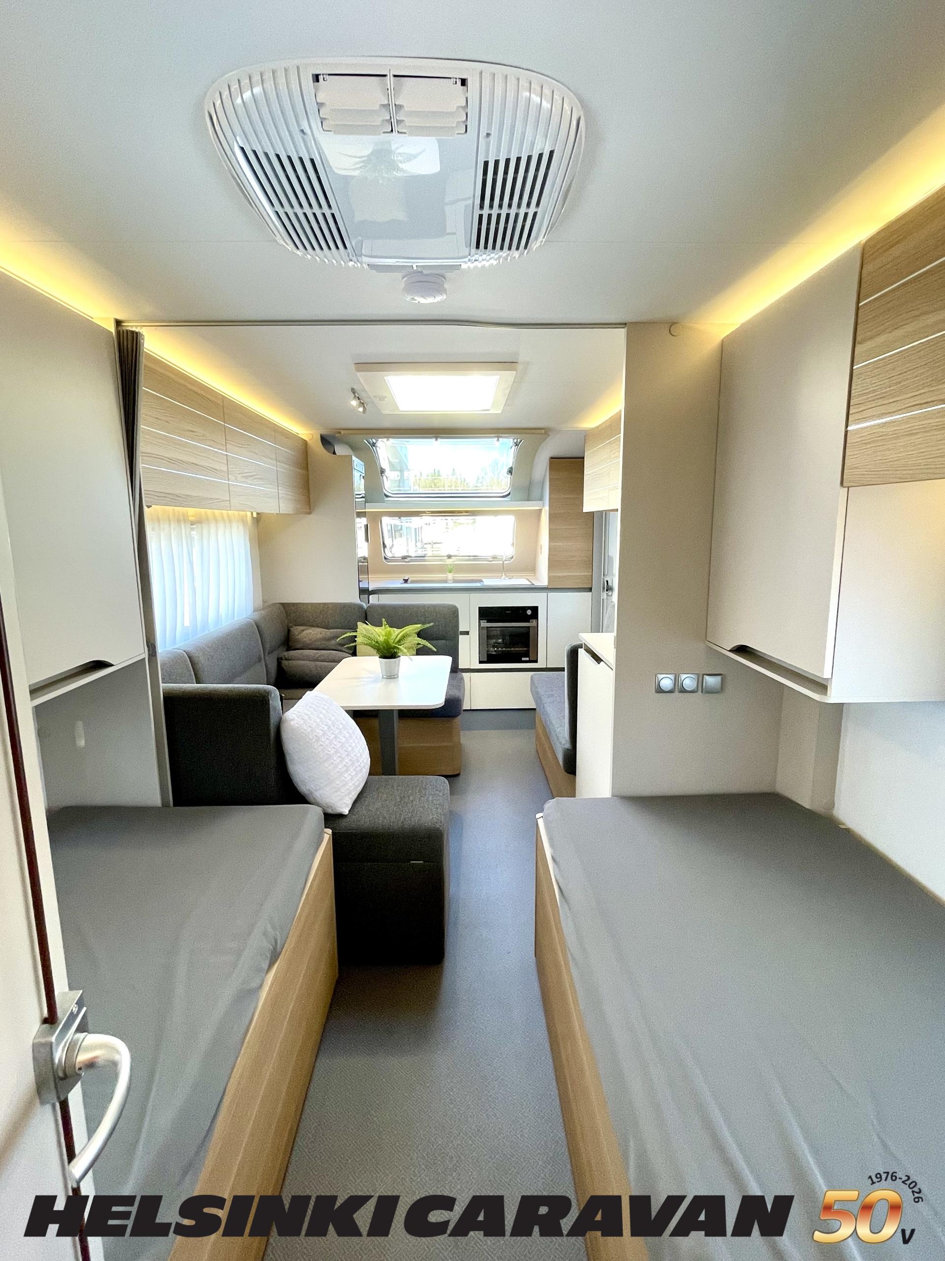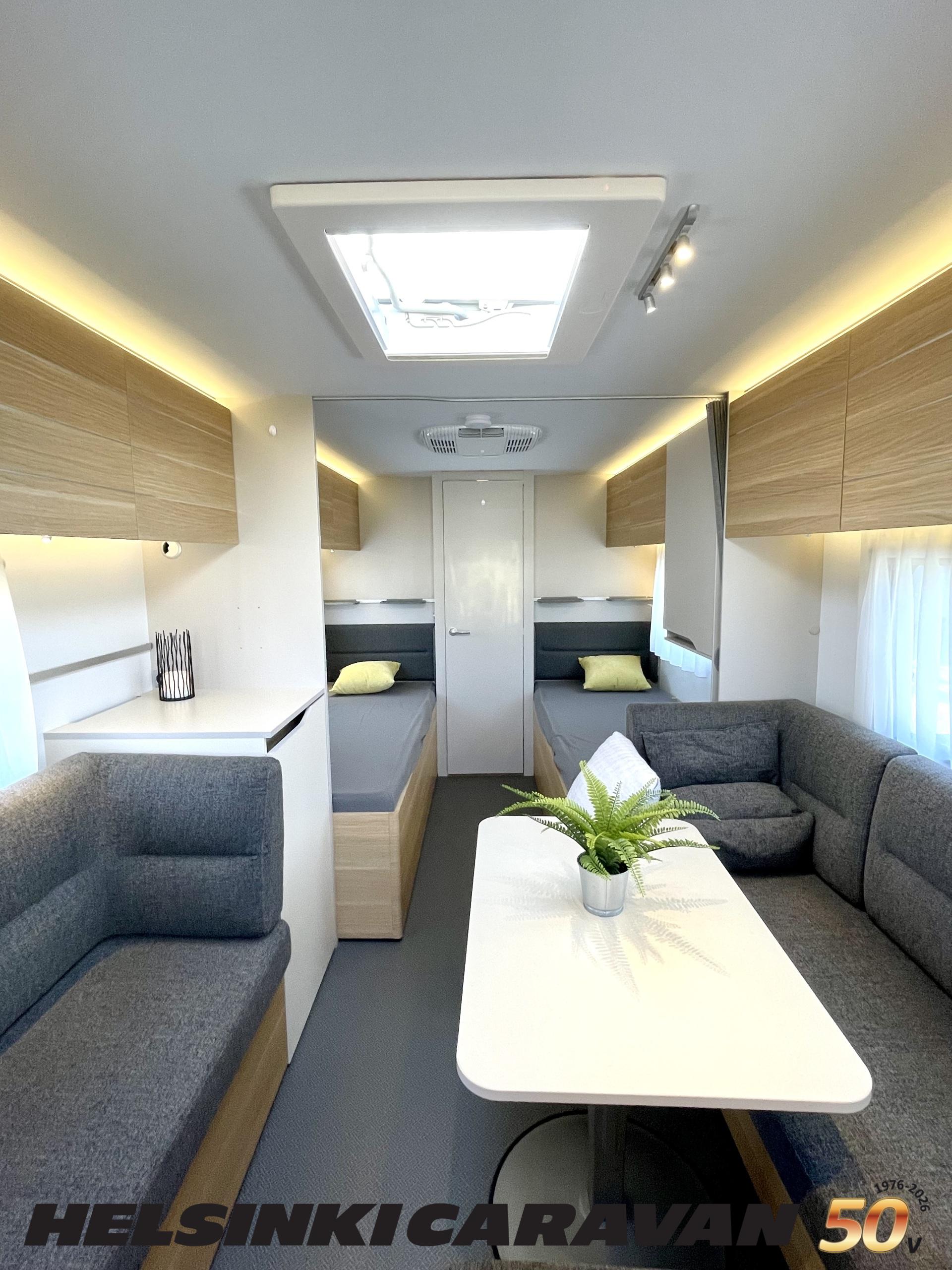 Etukeittiöpohjaratkaisu kasvattaa hiljalleen suosiotaan eikä tämänkään vaunun kohdalla tarvitse ihmetellä miksi. Mikäs siinä kokkaillessa ja nautiskellessa panoraamaikkunan tarjoamista maisemista.