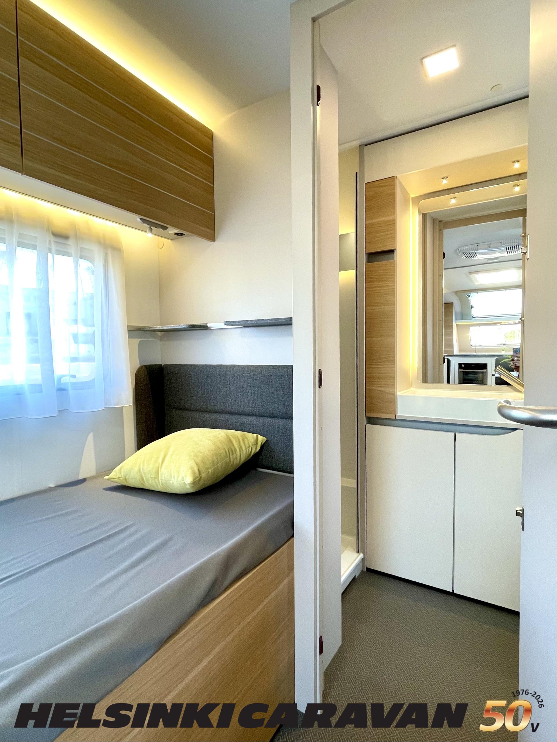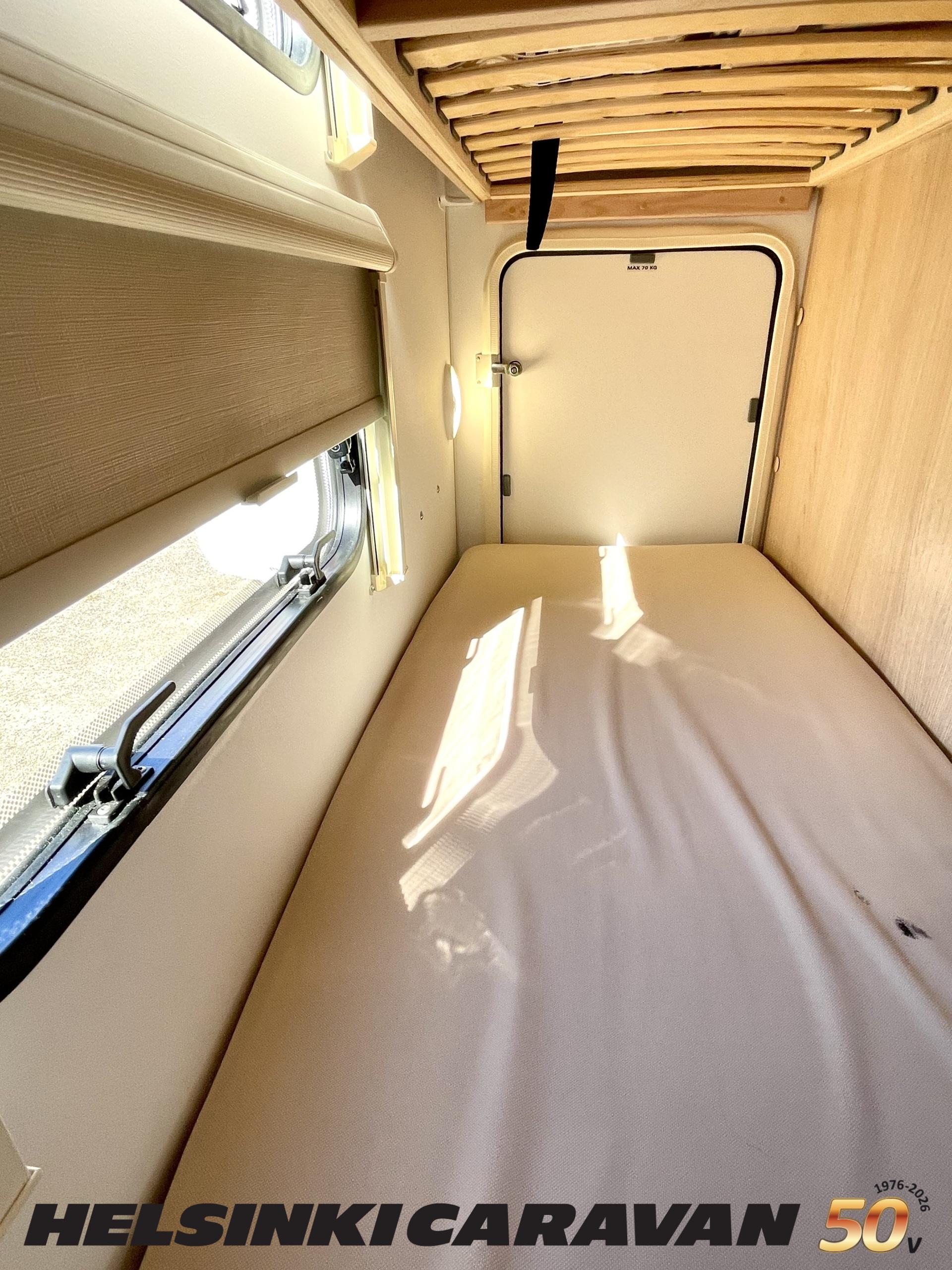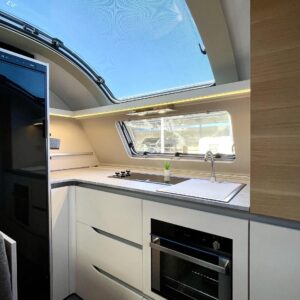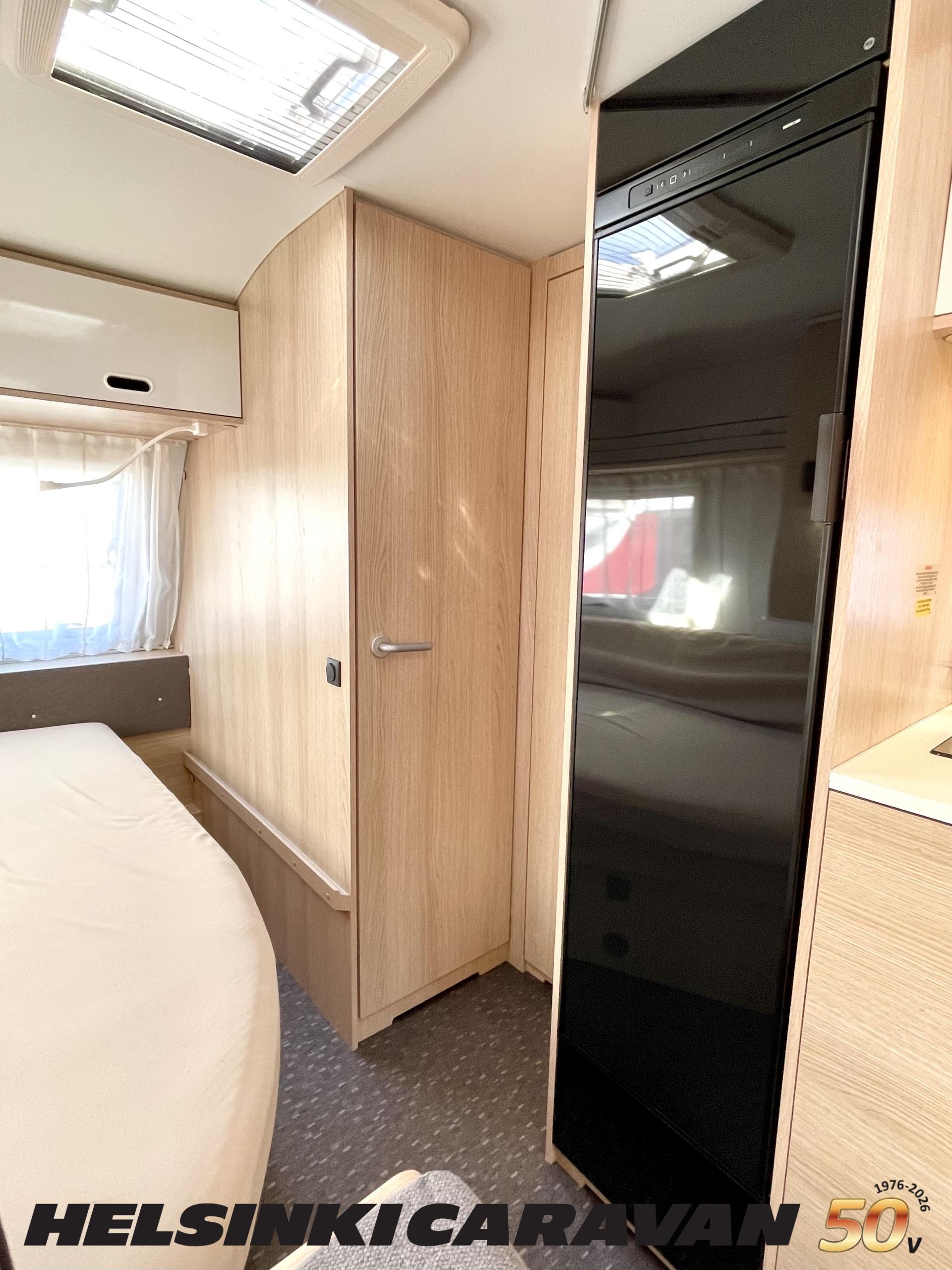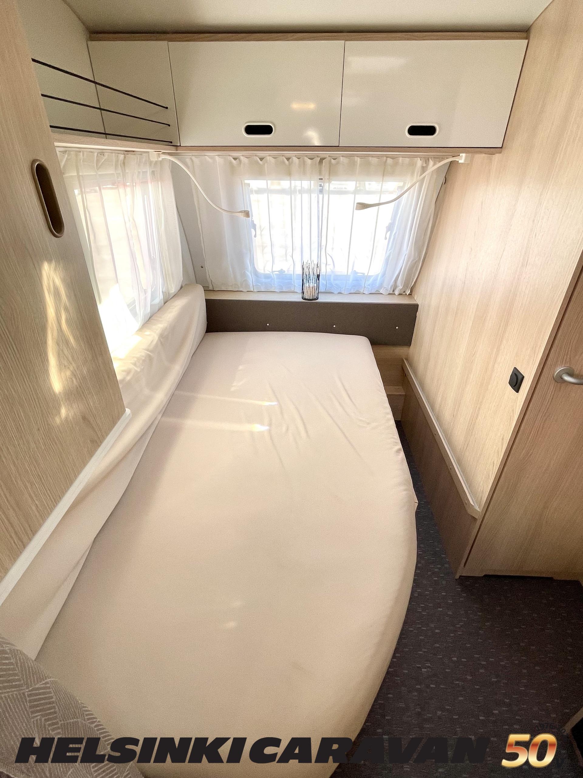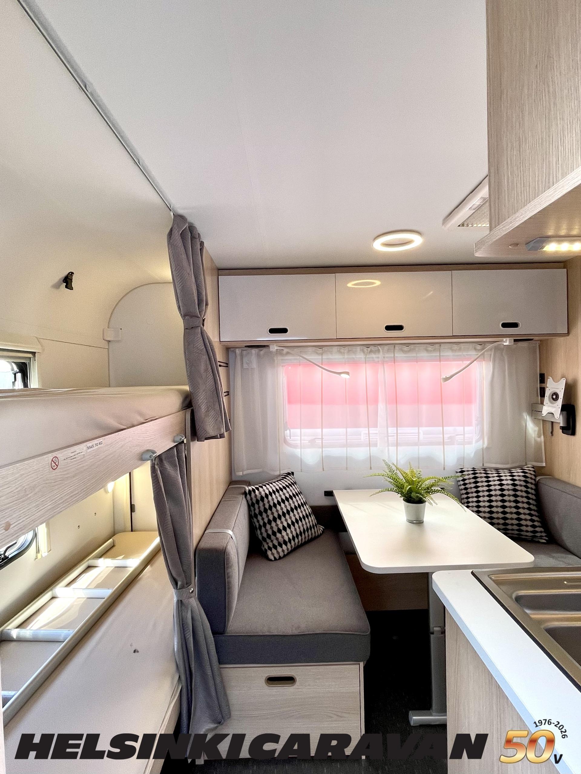 Etukeittiöpohjaratkaisu kasvattaa hiljalleen suosiotaan eikä tämänkään vaunun kohdalla tarvitse ihmetellä miksi. Mikäs siinä kokkaillessa ja nautiskellessa panoraamaikkunan tarjoamista maisemista.