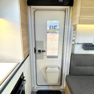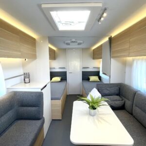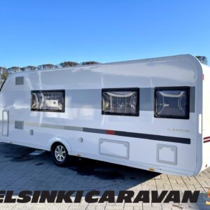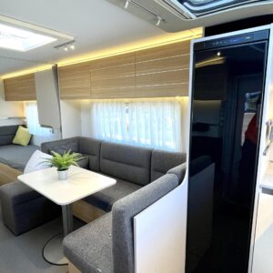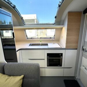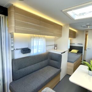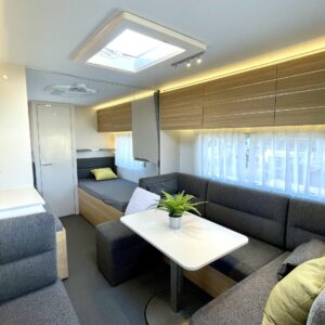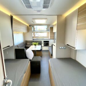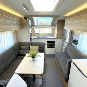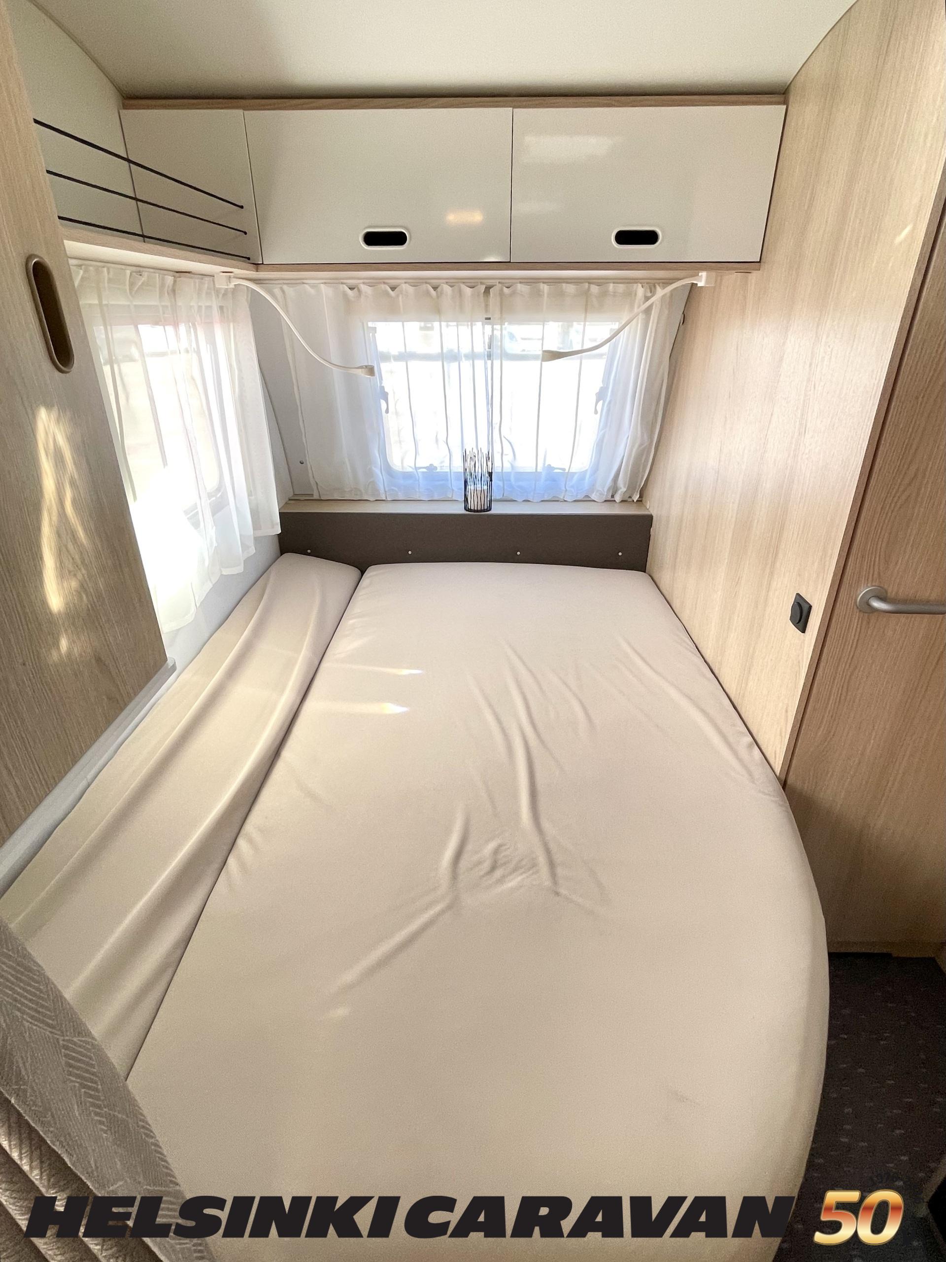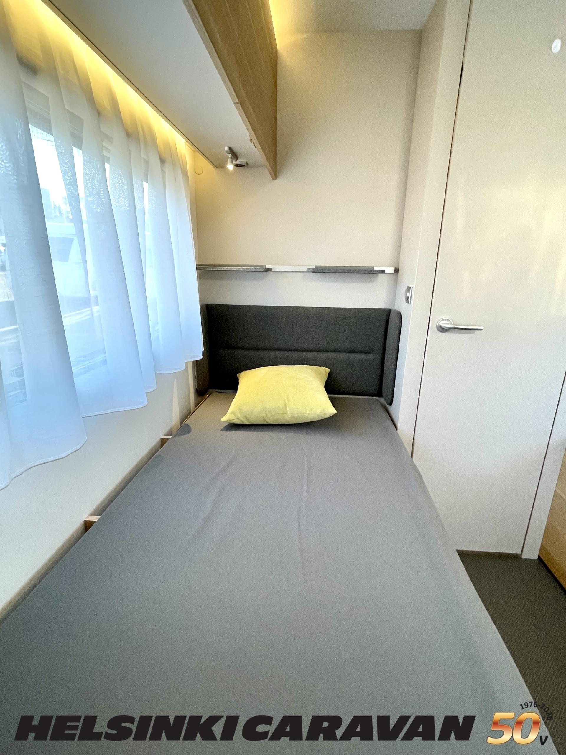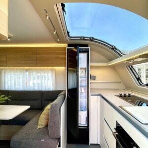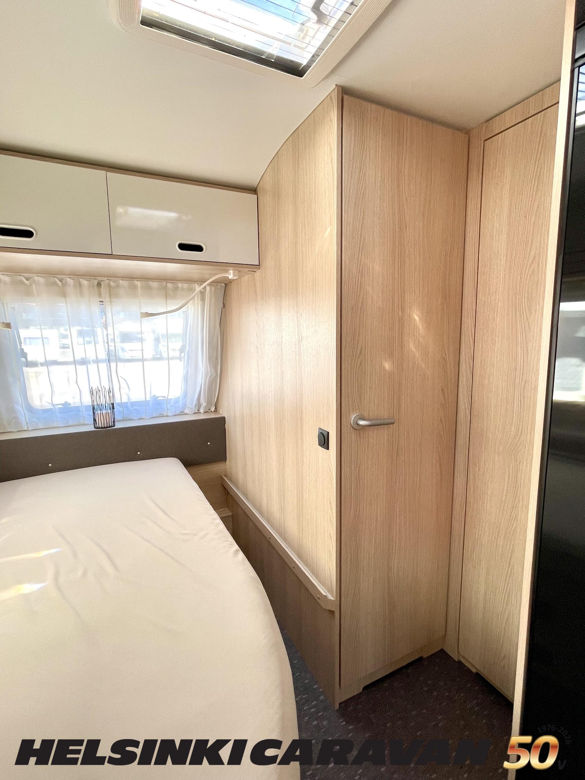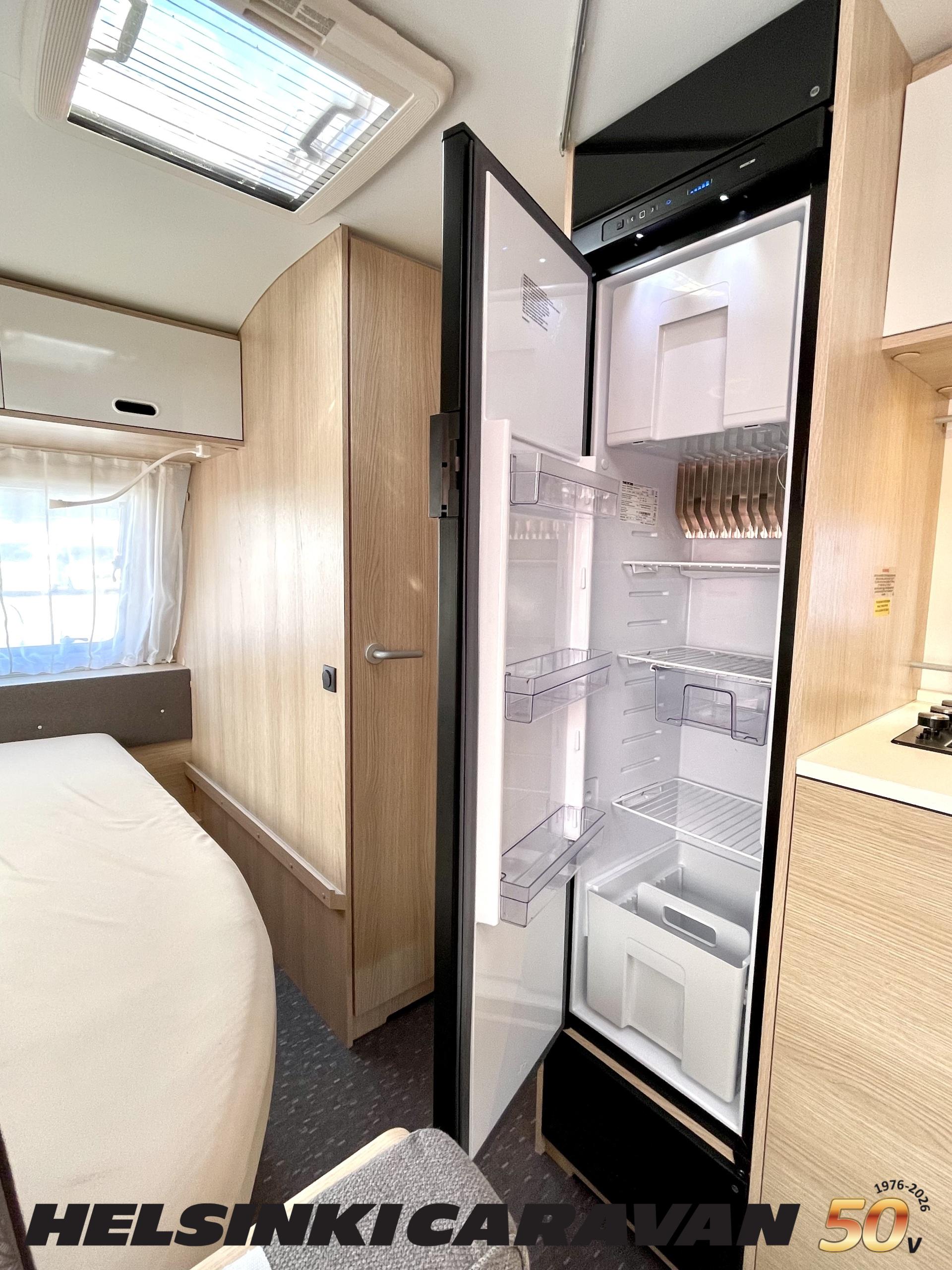 Etukeittiöpohjaratkaisu kasvattaa hiljalleen suosiotaan eikä tämänkään vaunun kohdalla tarvitse ihmetellä miksi. Mikäs siinä kokkaillessa ja nautiskellessa panoraamaikkunan tarjoamista maisemista.