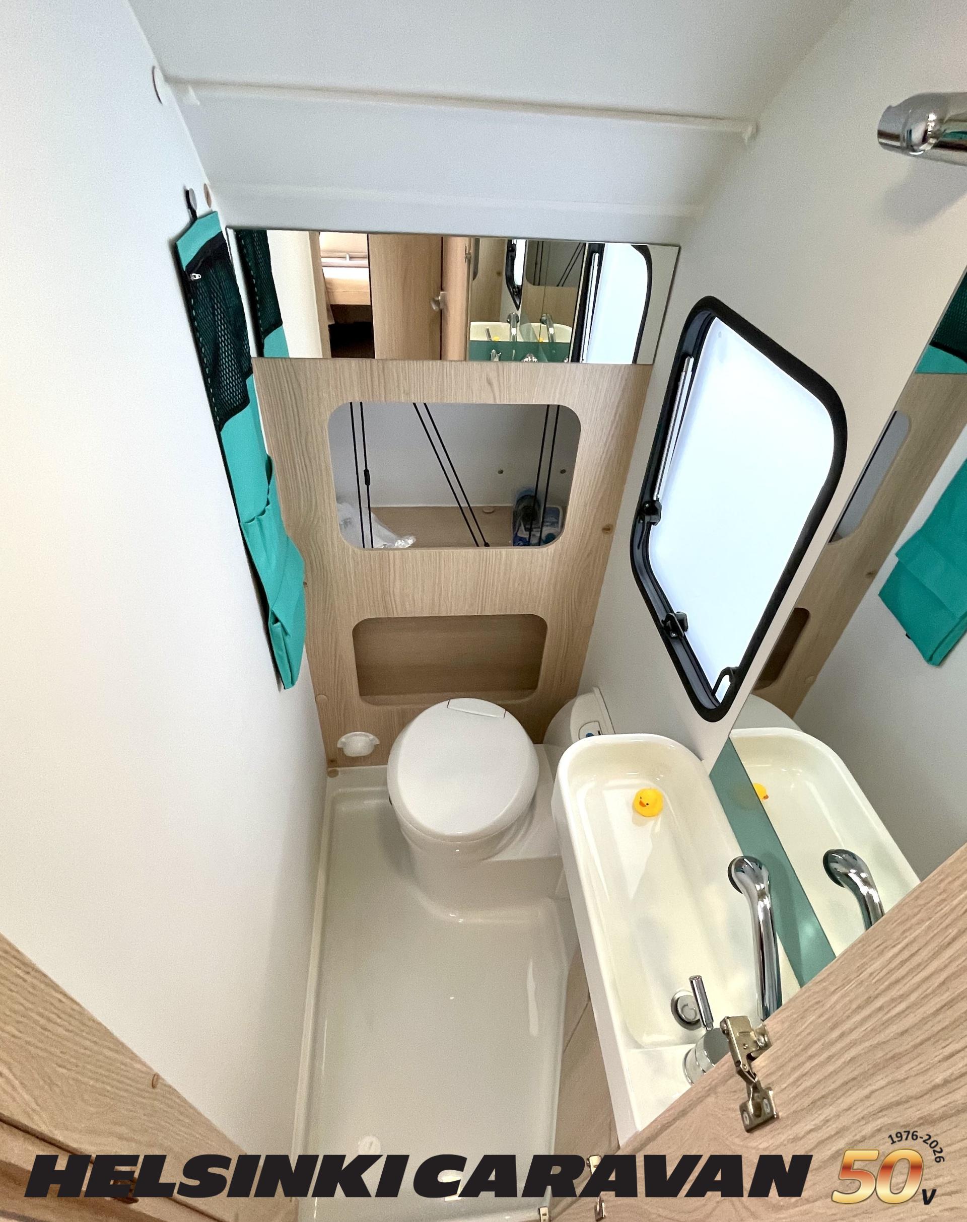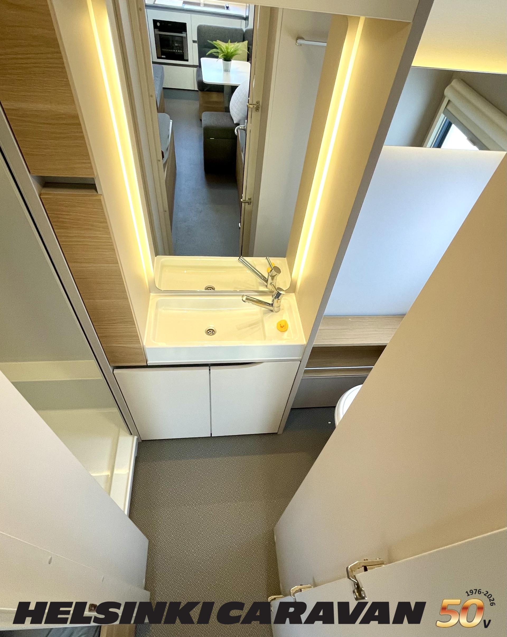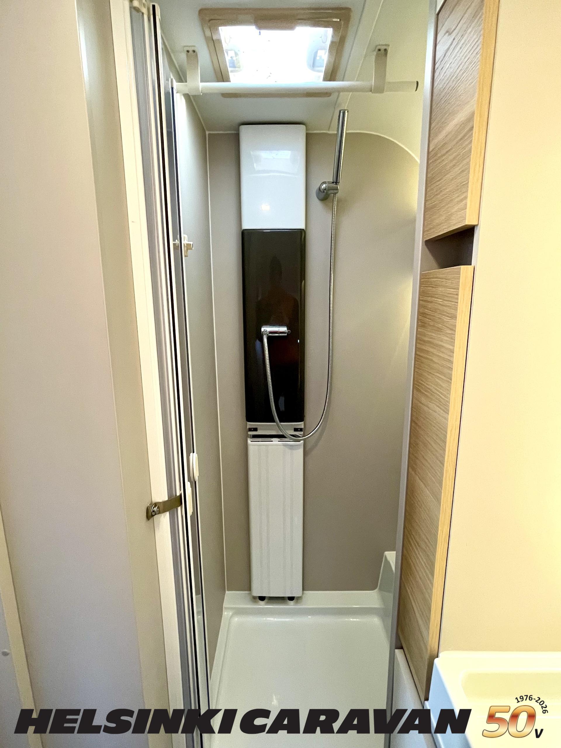 Koko vaunun levyinen takawc/ suihkutila on sisustettu valoisasti ja modernisti. Meikkipeilin edessä tehdään ihmeitä ja suihkussa mahtuu laulelemaan isompikin kaveri. Tässäkin tilassa on oma kattoluukku luonnonvalon ja ilmanvaihdon takaamiseksi.