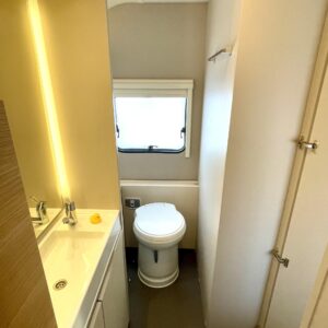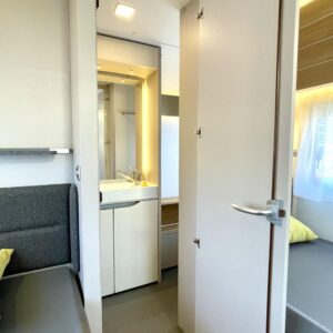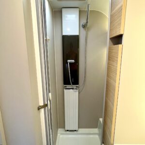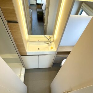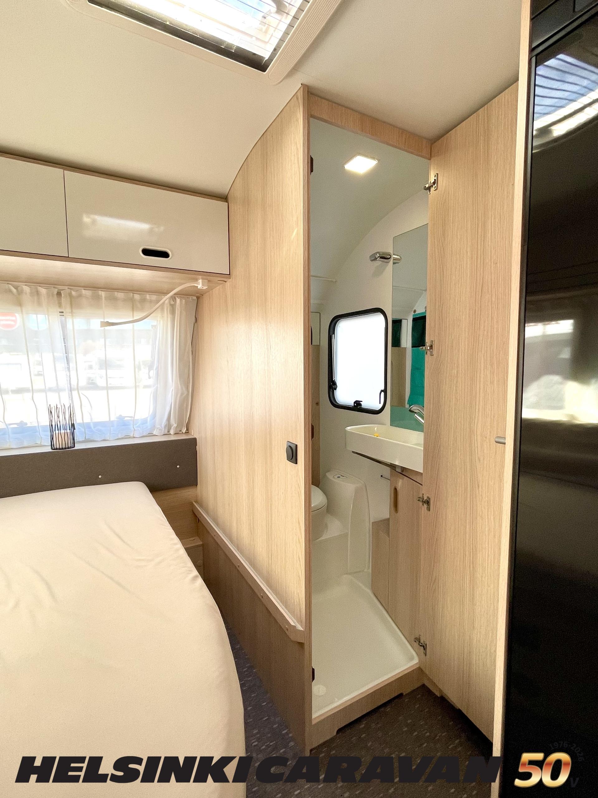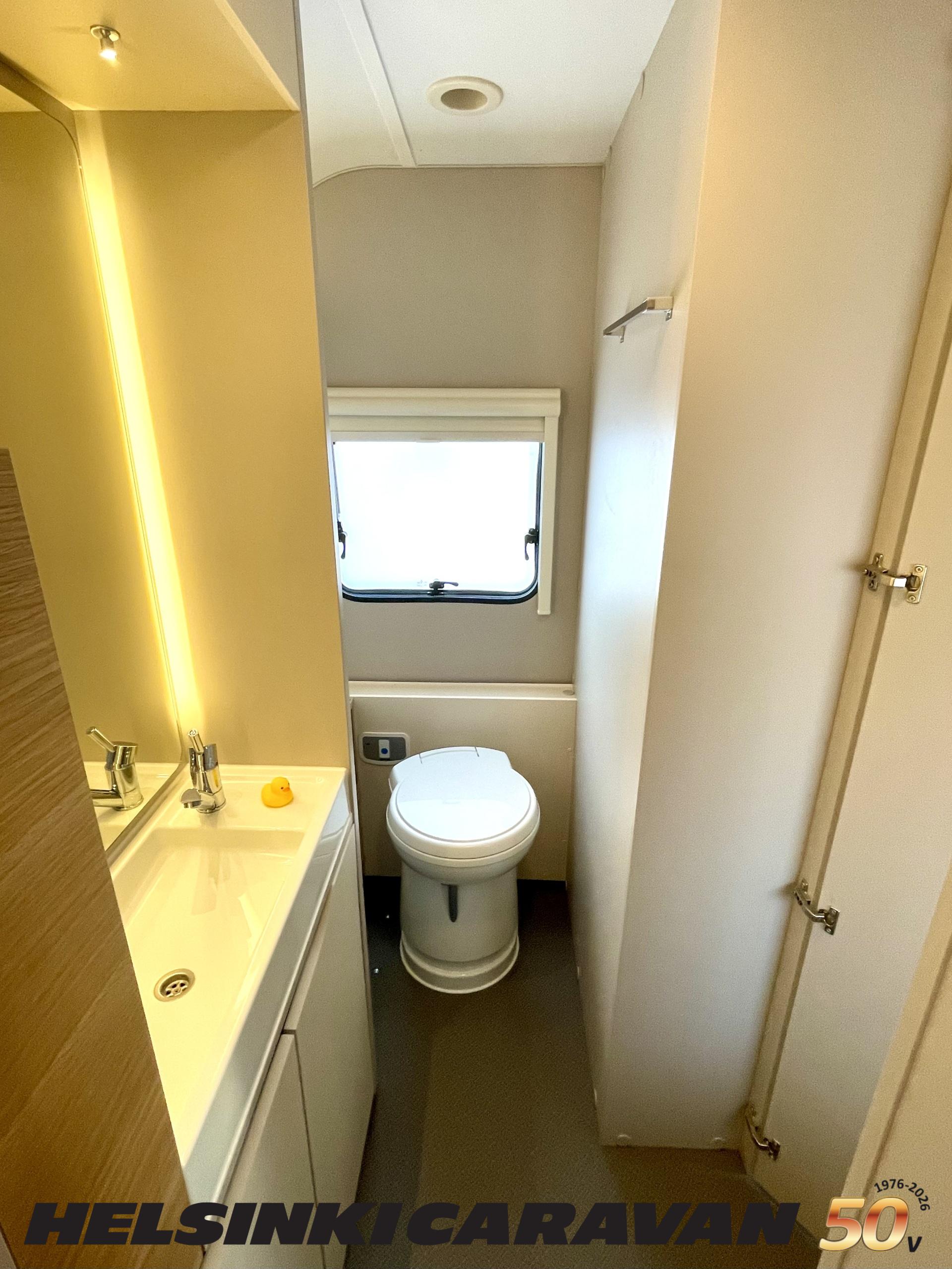 Koko vaunun levyinen takawc/ suihkutila on sisustettu valoisasti ja modernisti. Meikkipeilin edessä tehdään ihmeitä ja suihkussa mahtuu laulelemaan isompikin kaveri. Tässäkin tilassa on oma kattoluukku luonnonvalon ja ilmanvaihdon takaamiseksi.
