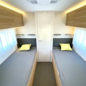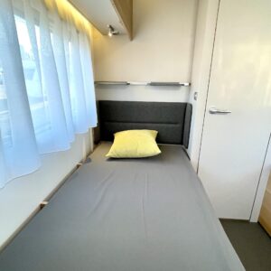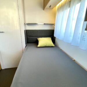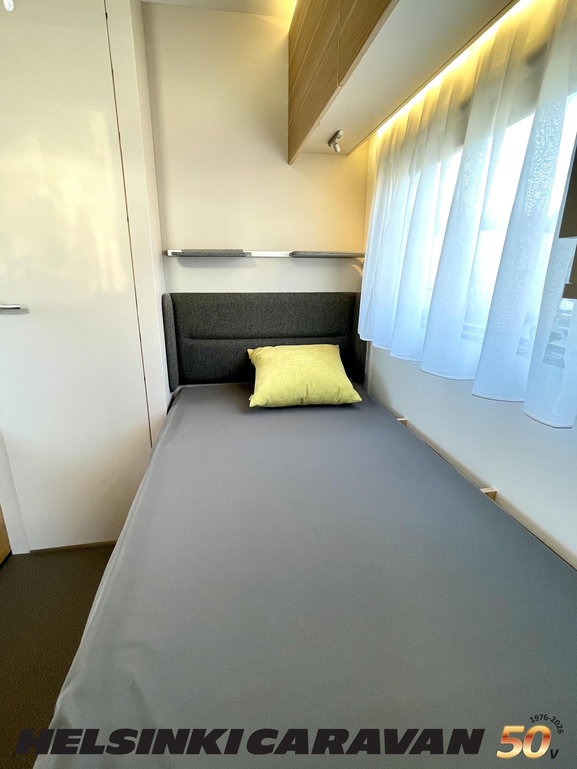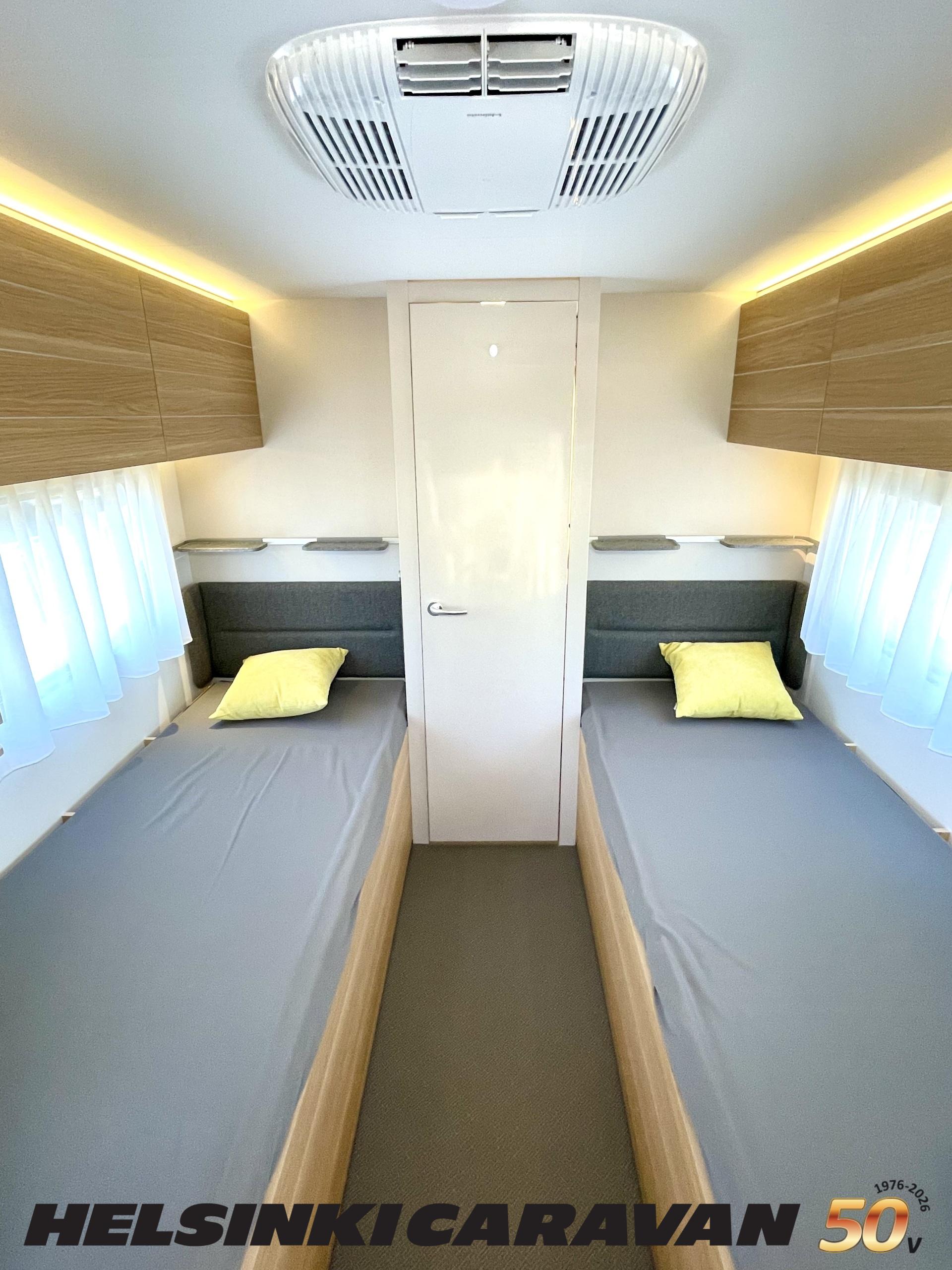 Olohuonetila johtaa kaihdinverholla osastoituvaan makuuosastoon, jossa leveät ja täyspitkät erillisvuoteet vaatekaapistoineen sijaitsevat. Täältä löytyy myös tehokas kaukosäätimellä varustettu Webaston lämpöpumpputekniikalla toimiva ilmastointilaite. Ei hikistä pyörimistä nahkeissa lakanoissa, vaan peitto korville ja unta kaaliin!