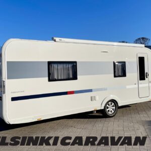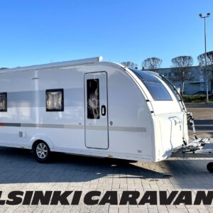 Ulkoisista varusteistakaan ei ole puutetta, pitkä kotelomarkiisi suojaa porotukselta ja on helppo pystyttää yksinkin. Aisan päältä löytyy polkupyöräteline ja sivuseinältä löytyy sähkön ulosotto vaikkapa jokakeväistä lätkän kisastudiota varten!