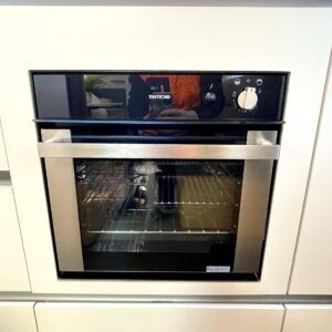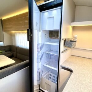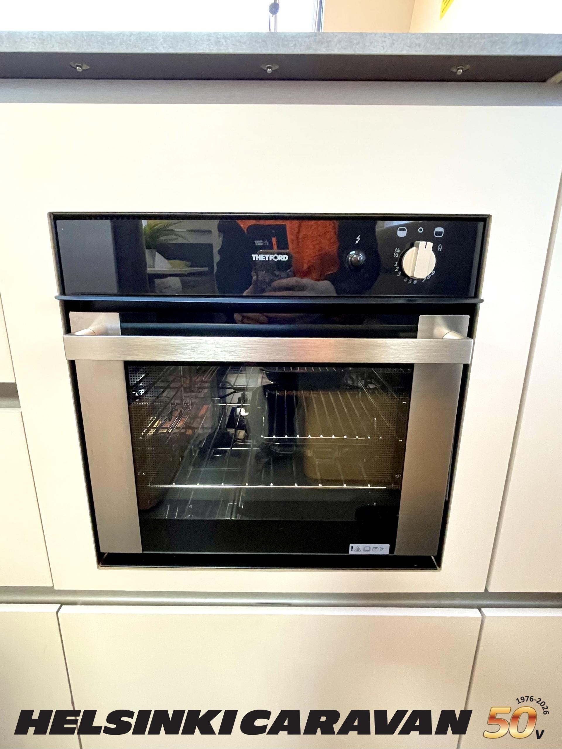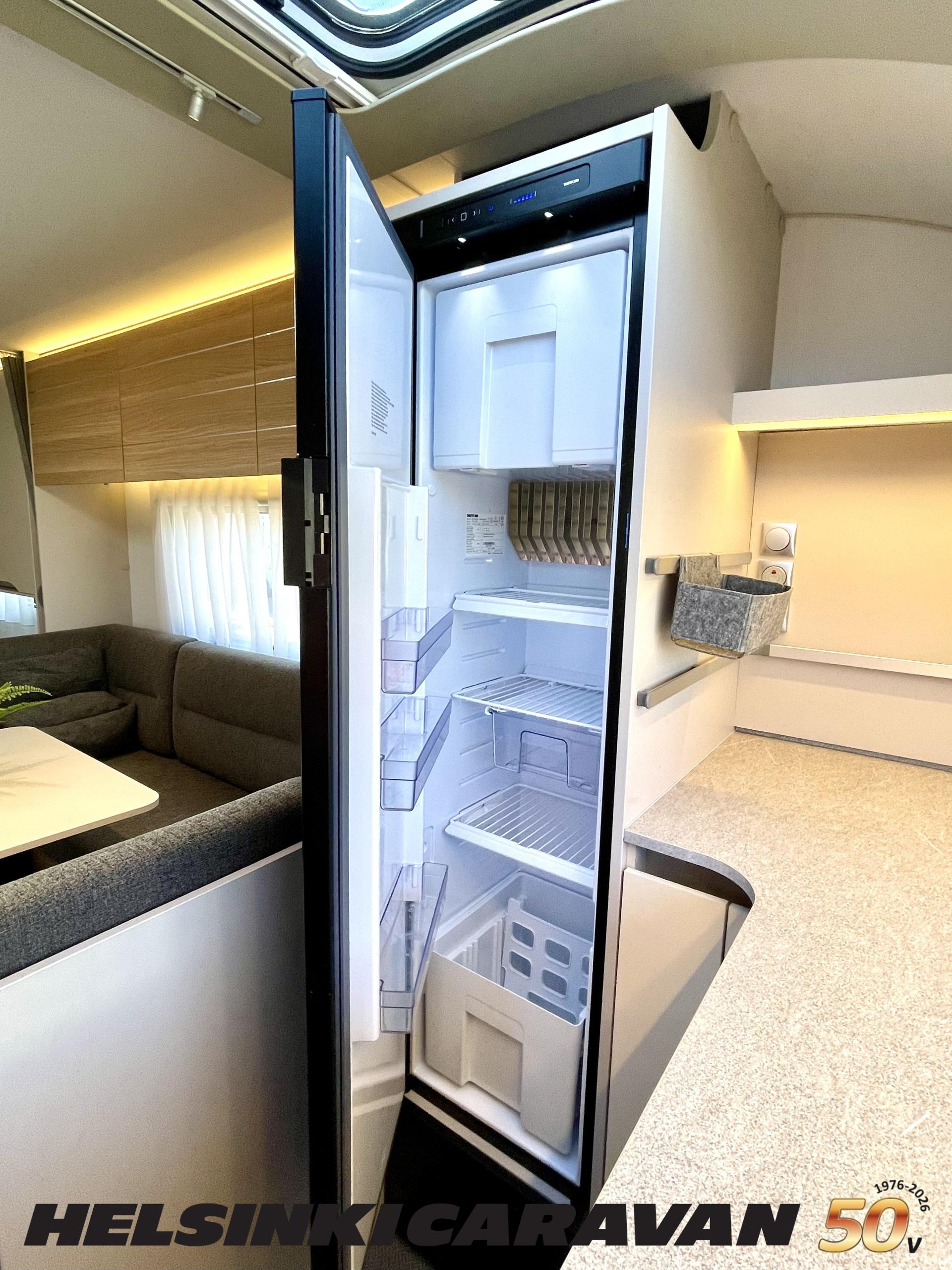 Ylellisestä keittiöstä löytyy todella reilusti laskupintaa ja laatikostotilaa. Kolmipolttimisen lieden alapuolelta löytyy lisäksi kaasu-uuni jossa myös grillaustoiminto. Leveä huuva kätkee sisäänsä myös liesituulettimen. Korkea jääkaappi on kolmitoiminen, energialähteeksi kelpaa niin 12- kuin 230V- sähkö sekä kaasu. Jääkaapista löytyy myös pakastelokero.