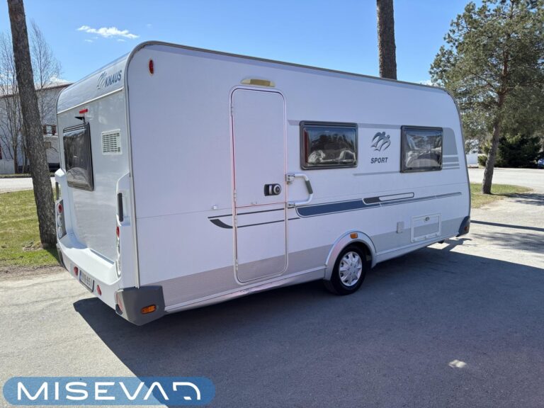 Ulkoisista varusteistakaan ei ole puutetta, pitkä kotelomarkiisi suojaa porotukselta ja on helppo pystyttää yksinkin. Aisan päältä löytyy polkupyöräteline ja sivuseinältä löytyy sähkön ulosotto vaikkapa jokakeväistä lätkän kisastudiota varten!