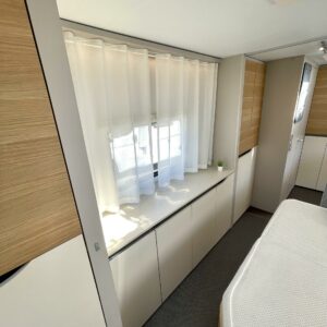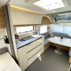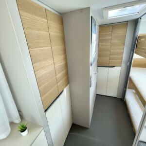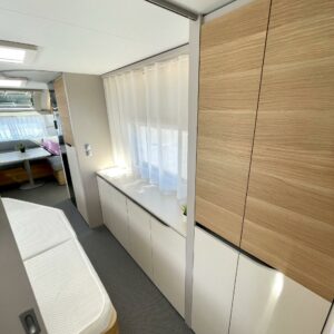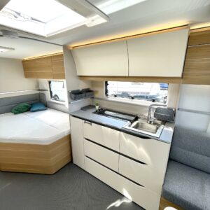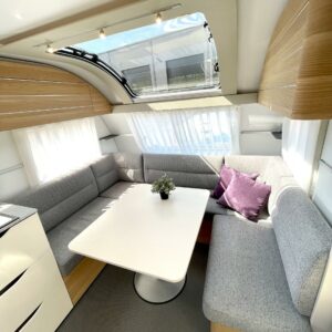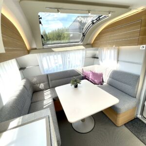 Valoisassa pohjaratkaisussa edessä suuri U-sohvaryhmä ja keittiö. Keskiosassa pitkittäinen parivuode sekä paljon kaappitilaa. Takaosassa kerrosvuoteet kolmelle ja wc erillisellä suihkulla.