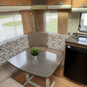 Pariskunnalle mahtava parivuode vaunu. Takana U-istuinryhmä, keskellä vaunua mahtava L-keittiö ja toisella puolen vaatekaappi. Vaunun keulassa wc / kylpyhuone sekä parivuode. Toimiva kokonaisuus ja ihanan pieni vetopaino!