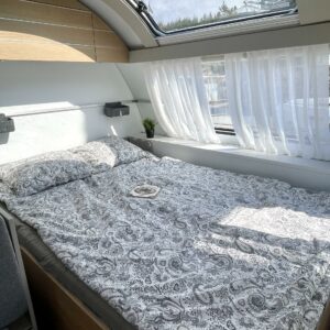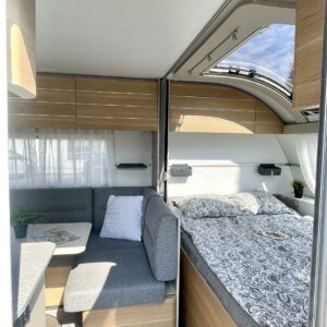 Ajattomilla vaaleilla väreillä sisustettu vaunu, missä suuri kattoikkuna edessä tuoden valoa ja lisätilan tuntua. Vaunun etuosassa on parivuode poikittain, keskellä suuri istuinryhmä sekä keittiö, missä korkea jääkaappi. Takaosassa on varsin tilava WC/suihkuhuone, sekä kerrosssängyt kahdelle.Tasaisen lämmityksen takaa nestekiertoinen Alde-keskuslämmitys. Vaunussa on myös valmiiksi asennettu rullamarkiisi.
