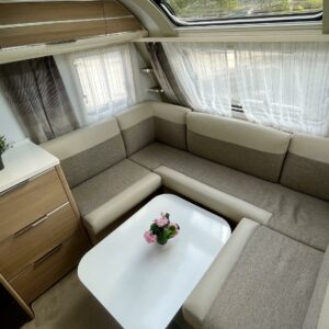 Heti sisään tullessa vaunu tarjoilee käyttäjälleen valoisuutta isolla etuikkunalla. Tässä voisi viettää vaikka yön Suomen suvessa lintuja kuunnellen, hyttysverkko löytyy suojaamaan isoa ikkunaa. U-muotoisen ruokailuryhmän ympärille mahtuu syömään koko perheen voimin tai isommalla porukalla. Keittiössä on kivasti kaappitilaa ja reilut vetolaatikostot. Kapea ja kätevä vetolaatikko myös mausteille. WC:n varusteisiin kuuluu suihku ja peilikaappi kätkee sisäänsä taitettavan lavuaarin. Takaosassa omat erillissängyt. Pyörät kulkee reissussa pyörätelineessä. Grillibileitä voi järjestää ulkona, koska vaunusta löytyy myös kaasun ulostulo. Eikä pieni sadekaan haittaa Suomen suvessa, sillä vaunussa on markiisi sään suojaksi. Vaunua on helppo liikutella sen omalla moverilla. Alde pitää matkustajat mukavan lämpimänä myös koleammillakin keleillä. Kokonaisuuden täydentää vaunun omat matot. Varusteet ja vaunu tarkastettuna, valmiina kesää kohti.