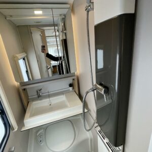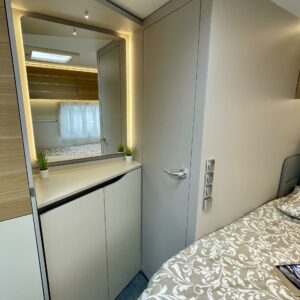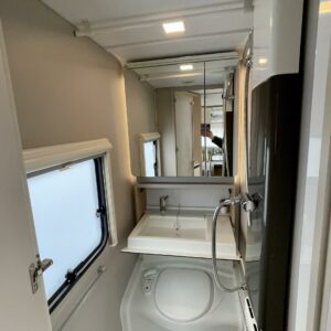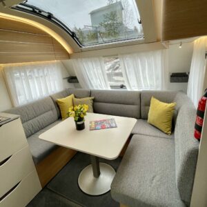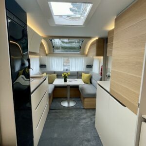 Ah, Adriaa tarjolla. Tule avaamaan Adrian ovi ja ihastu! Värimaailma ei sisustassa riitele, vaunu on visuaalisesti todella tyylikäs. Etuosassa on mehevän näköiset sohvat ja tilaa vaikka kuudelle. Jos vähän tiivistää. Keltaiset sisustustyynyt tuo värimaailmaan raikkautta ja toki sohvalle mahtuu ne omatkin suosikki tyynyt. Tilaa on. Keittiön graniittijäljitelmä tuo arvokkuuden tuntua. Adrialla onkin yleensä mietitty keittiöiden visuaalista puolta. Ihan jo lieden ja pesualtaan valinnassa. Kaappitilaa on reilusti ja vedettävät alakaapit käytössä ihan ehdottomat. Pitkä jääkaappi palvelee varmasti kaikkia vaunun nälkäisiä asukkeja. Vaunun takaa löytyy kivan kokoinen parisänky. WC-/suihkutilaan mahtuu hyvin pesulle. Keittiötä vastapäätä on vielä lisää kaappitilaa. Vaunua lämmittää tottakai nestekiertoinen Alde. Iso panoraamaikkuna on kauniiden kesäaamujen ilo.