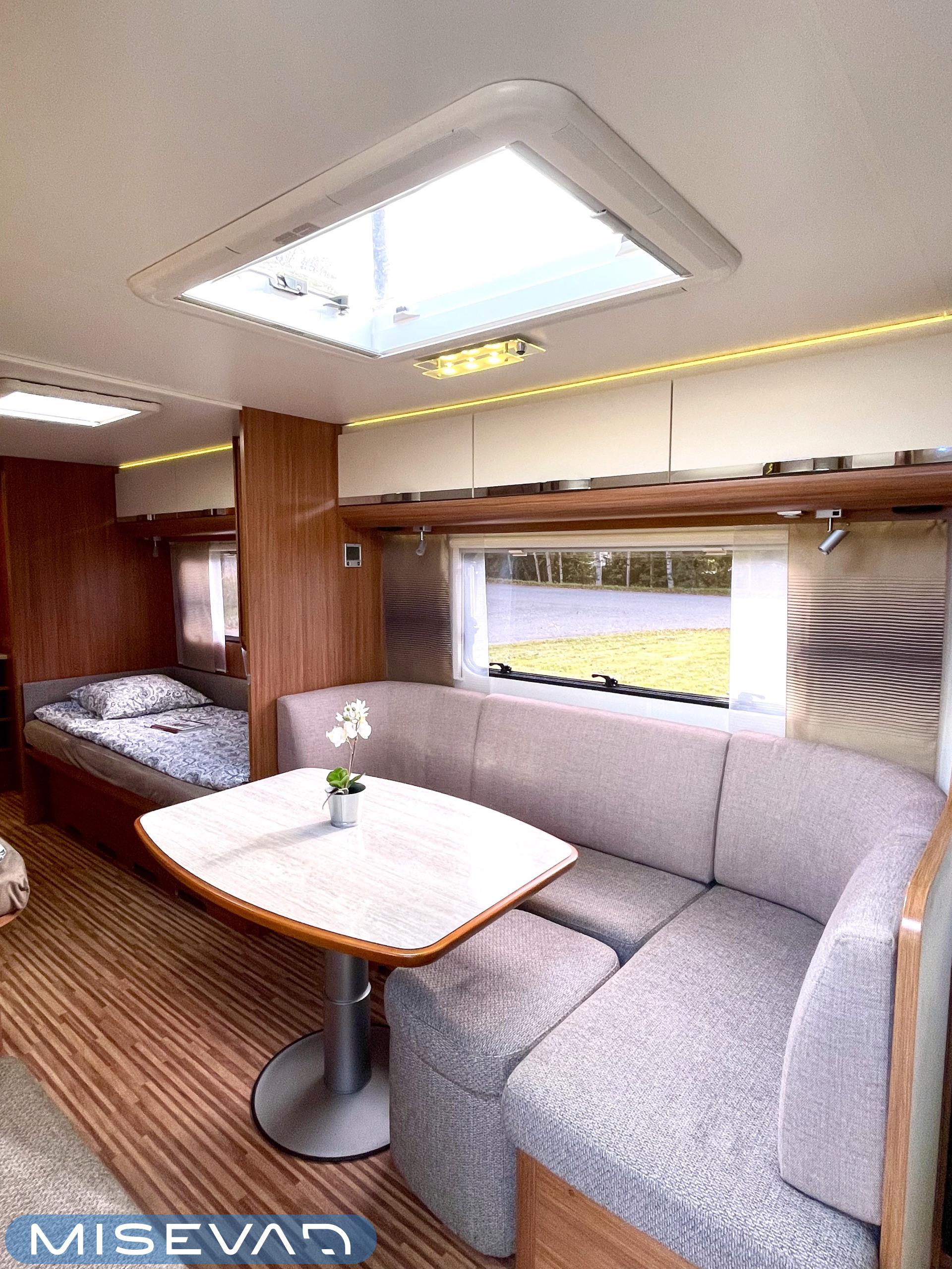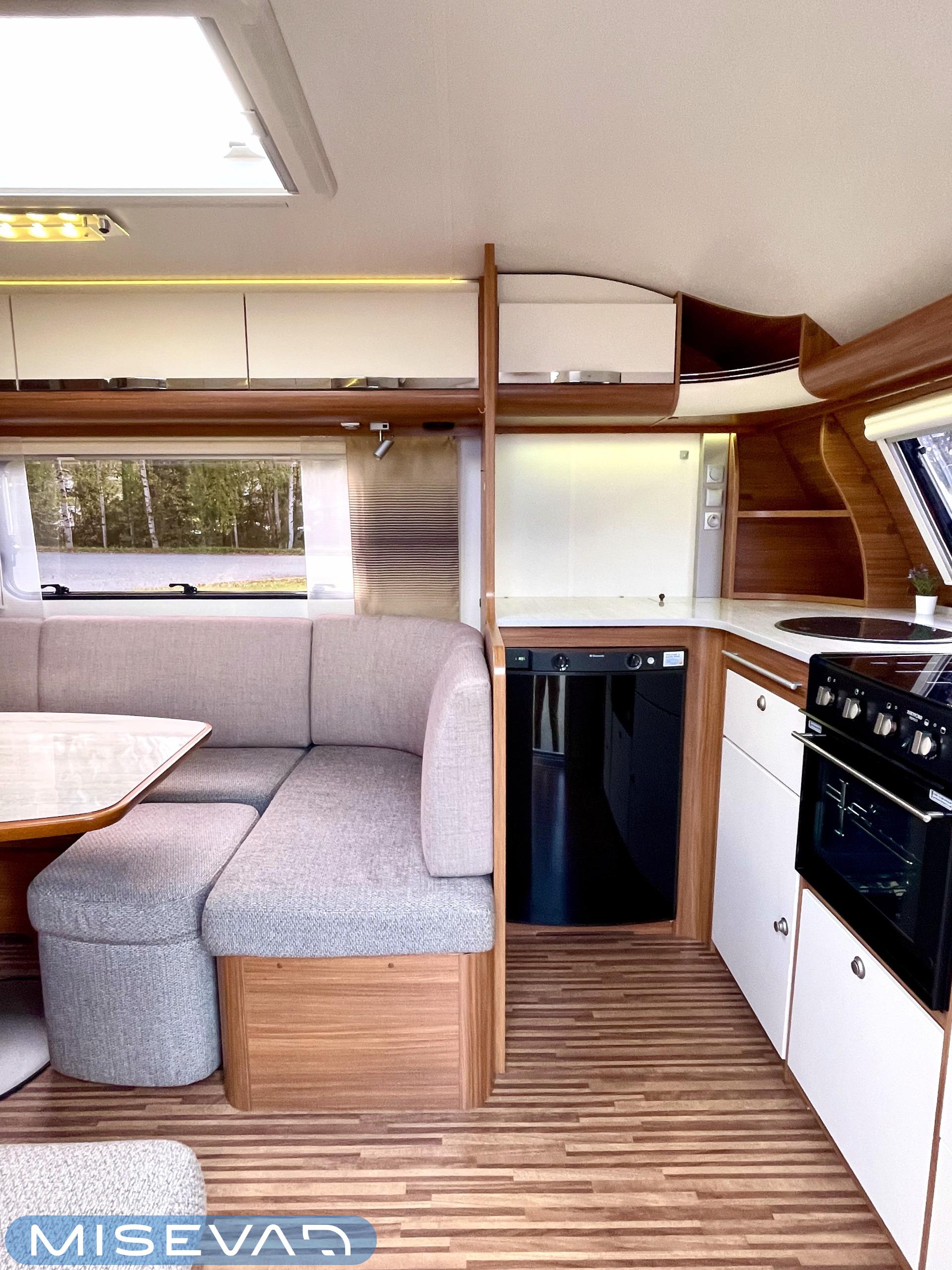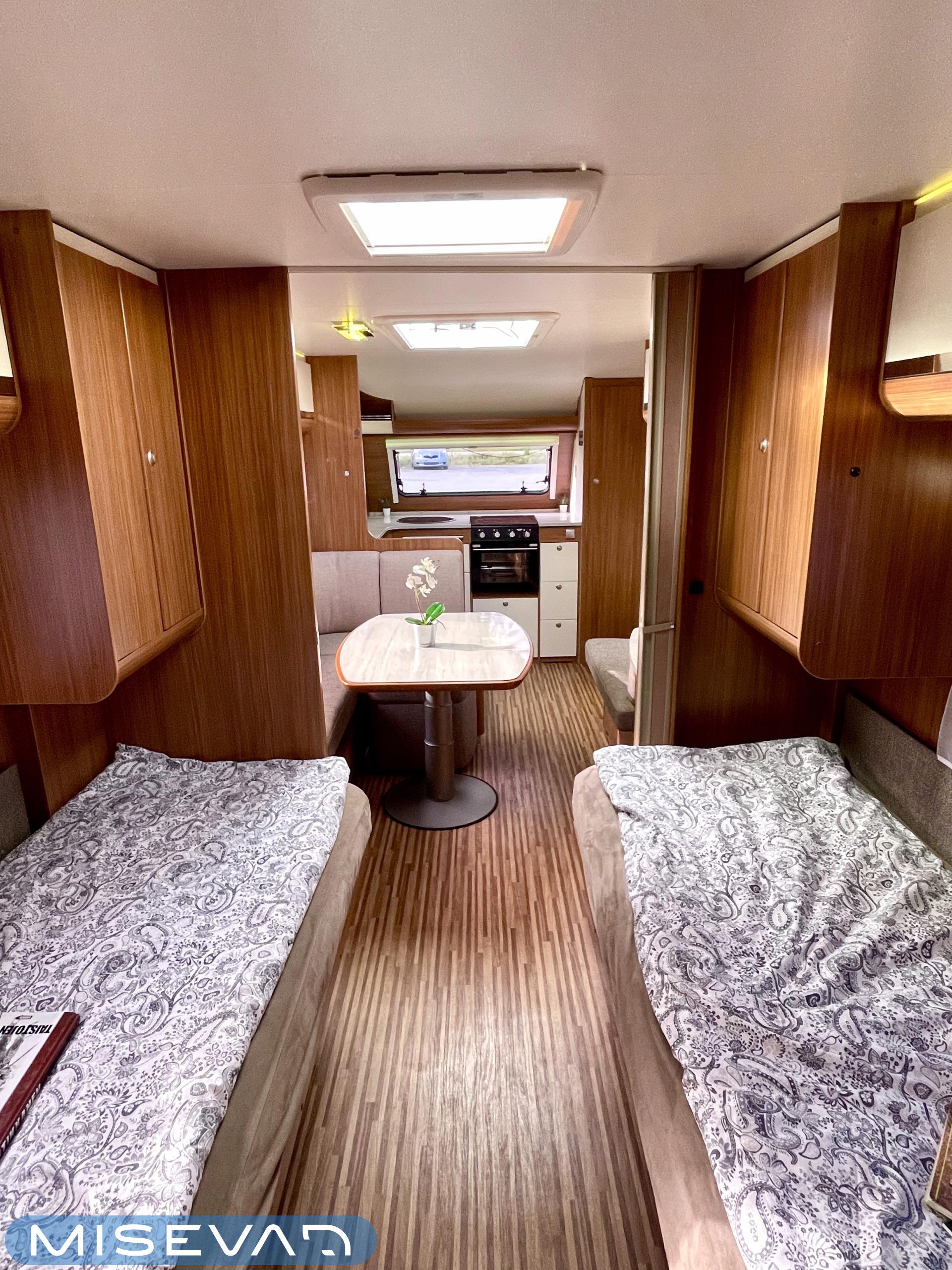 Nyt iski Misevalaisissakin vaunukuume! Adrian HT malli herättää heti kiinnostuksen kenessä tahansa. Pelkästään etukeittiö on jo monen hakuagenteissa ruksittuna. Se mahdollistaa kokkailevalle vaunuilijalle huipputilat ruoanlaittoon! Tilaa on ja kaapistoja myöskin. Toinen tämän vaunun ehdoton hitti on taka-wc. Sijoittelu takana tekee asuinosasta erityisen avaran ja vaunun takaosassa saa käydä asioilla ihan rauhassa. Taka-wc:tä voi sanoa hyvällä omatunnolla jo ihan aidoksi kylpyhuoneeksi. Kylpyamme vain puuttuu. Vaunu tarjoaa myös erillissängyt ja mukavan oleskelutilan. Sohvaa on etuosassa molemmin puolin ja pöydän ympärille mahtuu kivasti porukkaa. Kaiken kruunaa Alden nestekiertoinen lämmitys ja se mahdollistaa vaunun käytön vaikka ihan sydäntalvellakin. Tulikohan jo kerrottua että vaunu on erittäin avara ja siisti? No, se on! Tule vaikka itse tutustumaan!