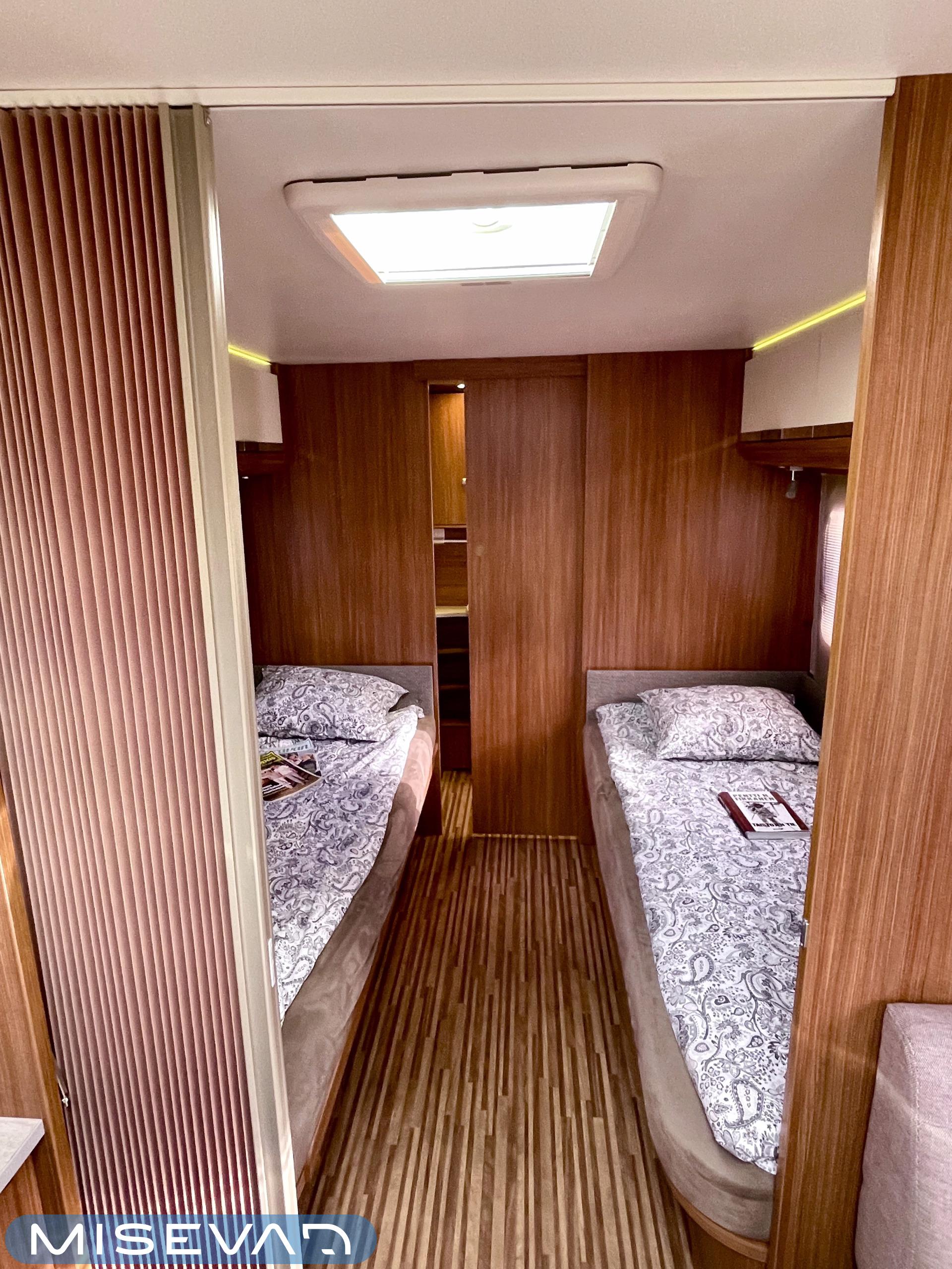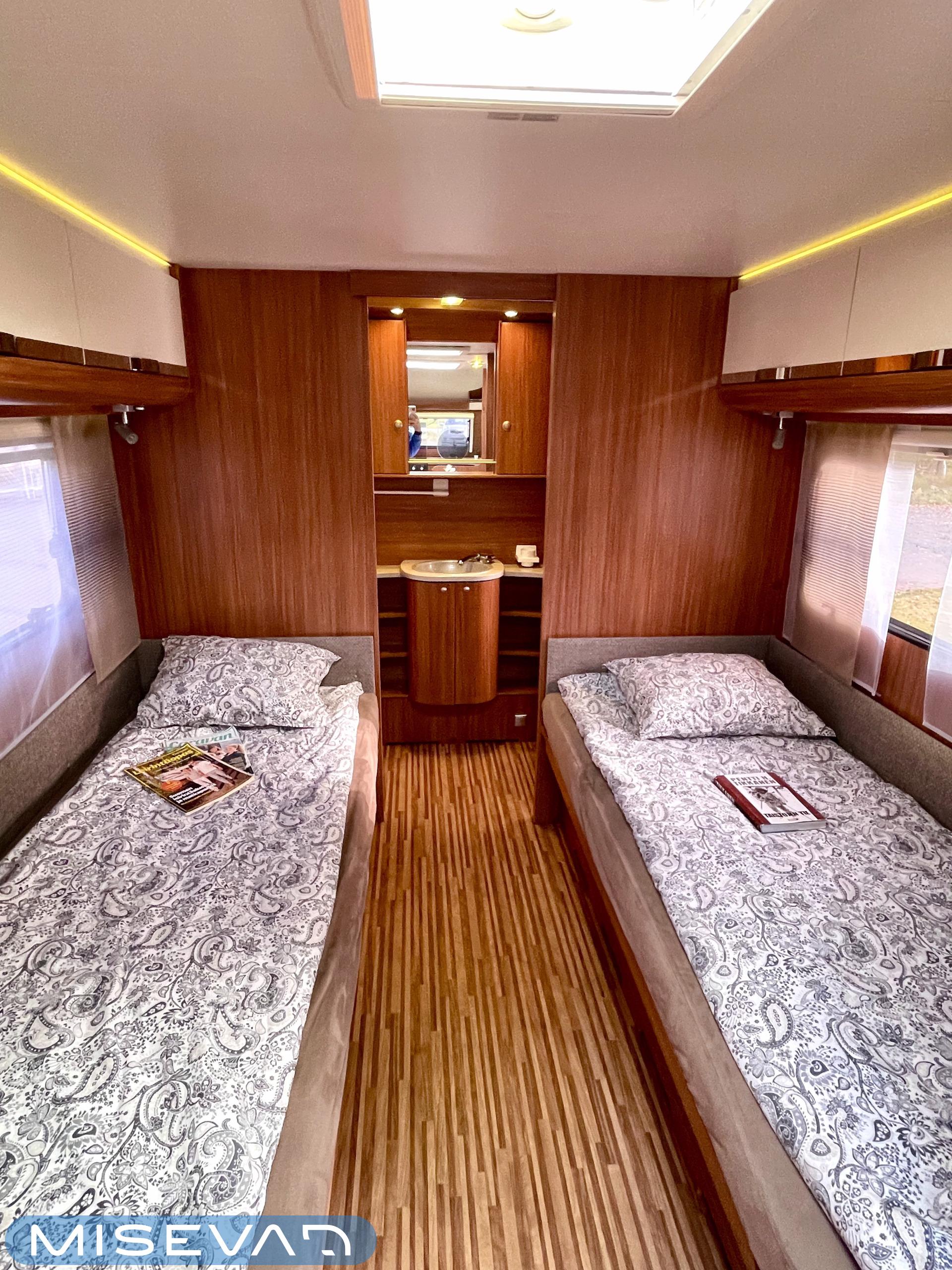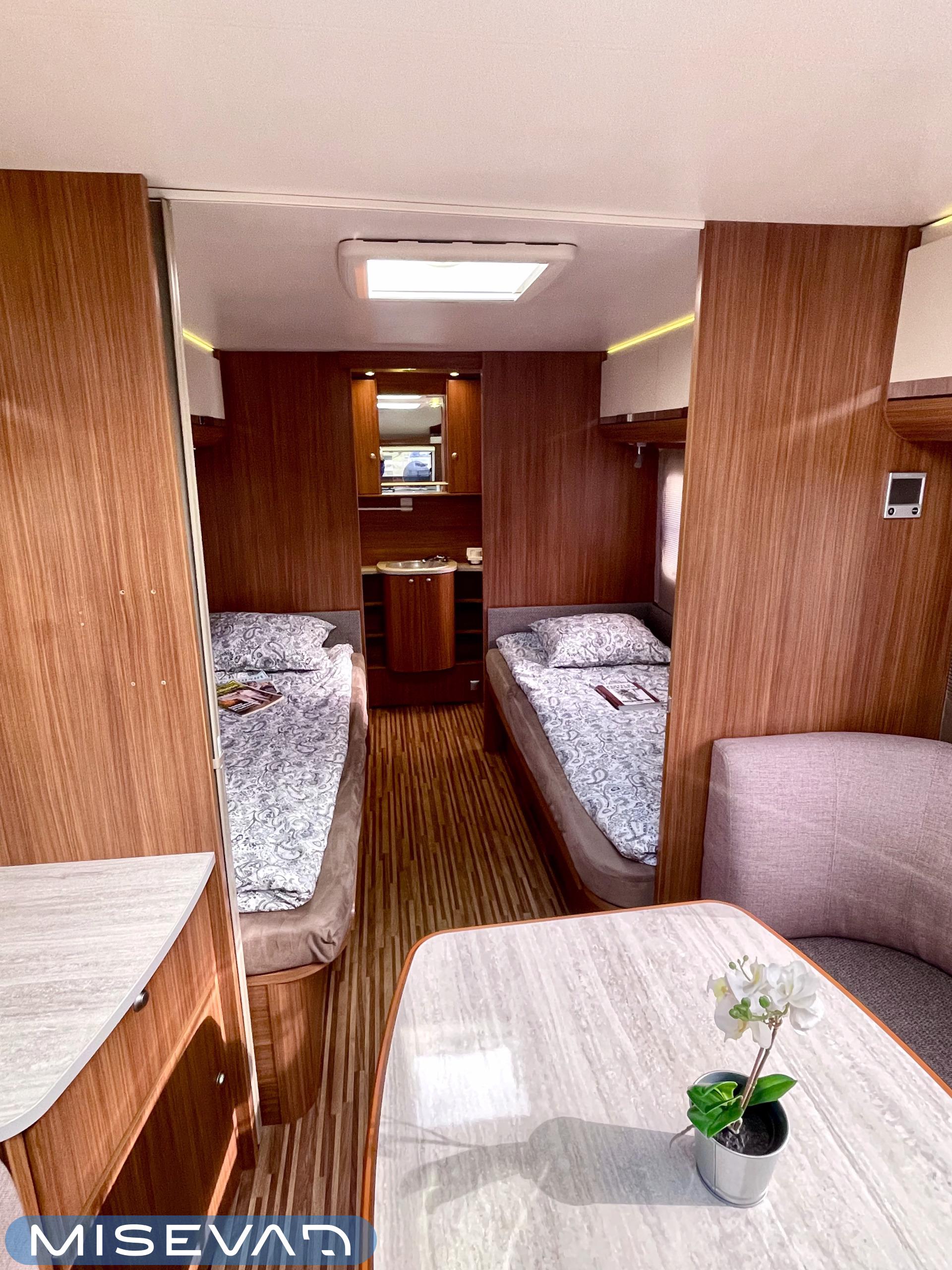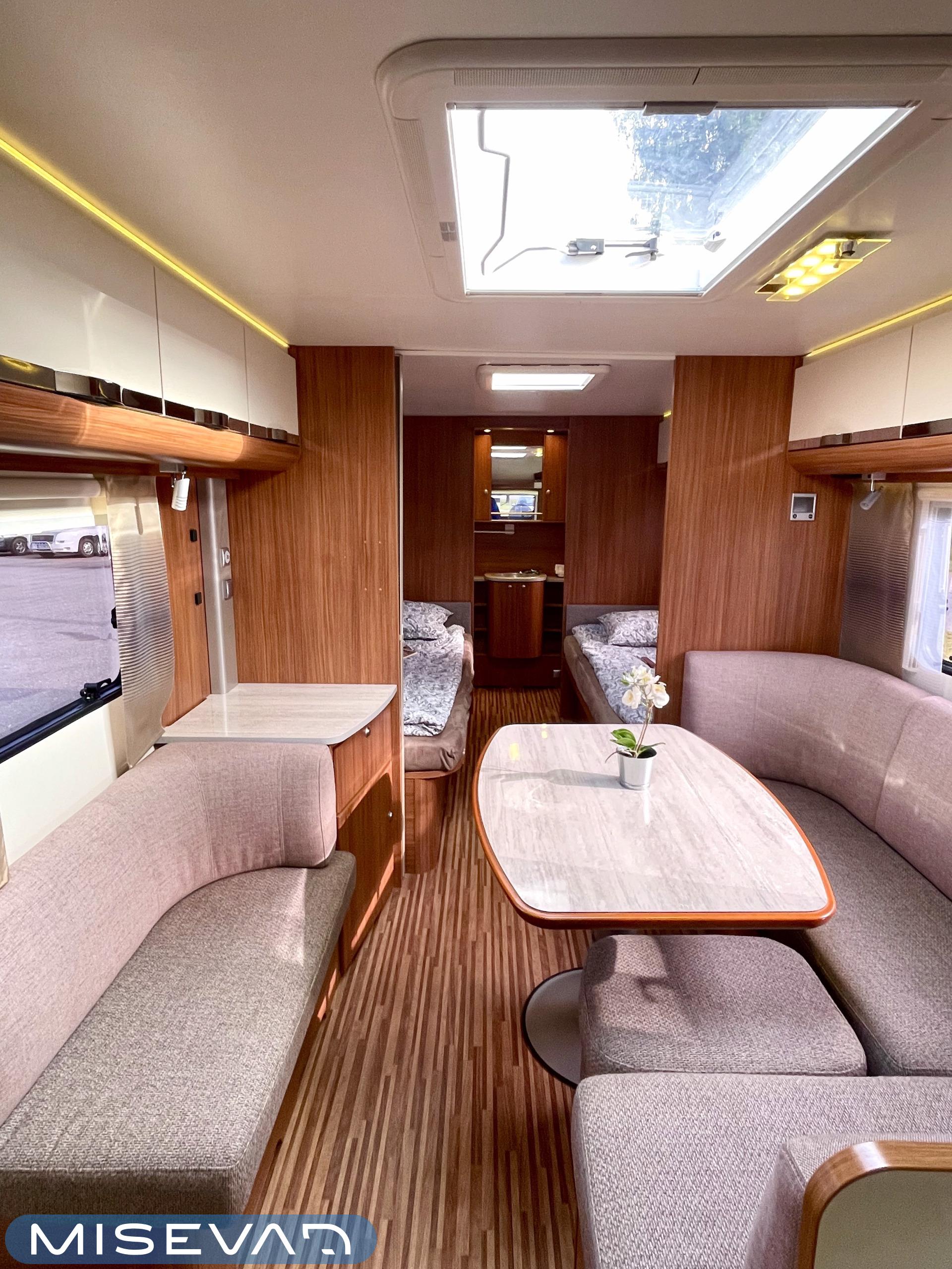 Nyt iski Misevalaisissakin vaunukuume! Adrian HT malli herättää heti kiinnostuksen kenessä tahansa. Pelkästään etukeittiö on jo monen hakuagenteissa ruksittuna. Se mahdollistaa kokkailevalle vaunuilijalle huipputilat ruoanlaittoon! Tilaa on ja kaapistoja myöskin. Toinen tämän vaunun ehdoton hitti on taka-wc. Sijoittelu takana tekee asuinosasta erityisen avaran ja vaunun takaosassa saa käydä asioilla ihan rauhassa. Taka-wc:tä voi sanoa hyvällä omatunnolla jo ihan aidoksi kylpyhuoneeksi. Kylpyamme vain puuttuu. Vaunu tarjoaa myös erillissängyt ja mukavan oleskelutilan. Sohvaa on etuosassa molemmin puolin ja pöydän ympärille mahtuu kivasti porukkaa. Kaiken kruunaa Alden nestekiertoinen lämmitys ja se mahdollistaa vaunun käytön vaikka ihan sydäntalvellakin. Tulikohan jo kerrottua että vaunu on erittäin avara ja siisti? No, se on! Tule vaikka itse tutustumaan!