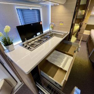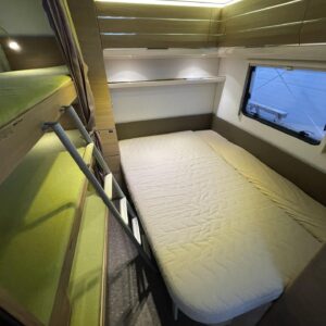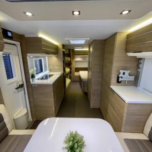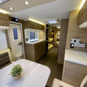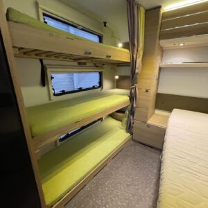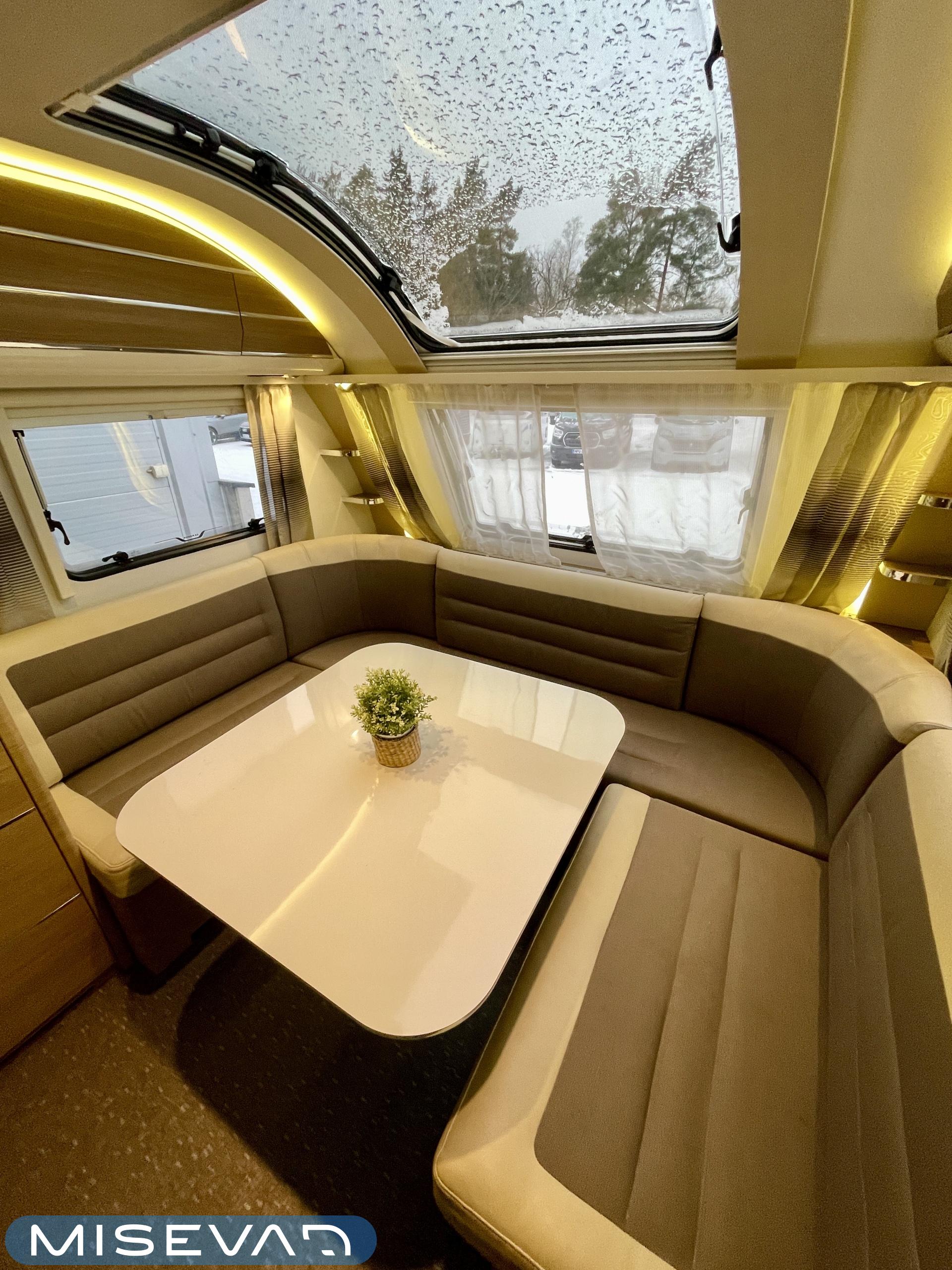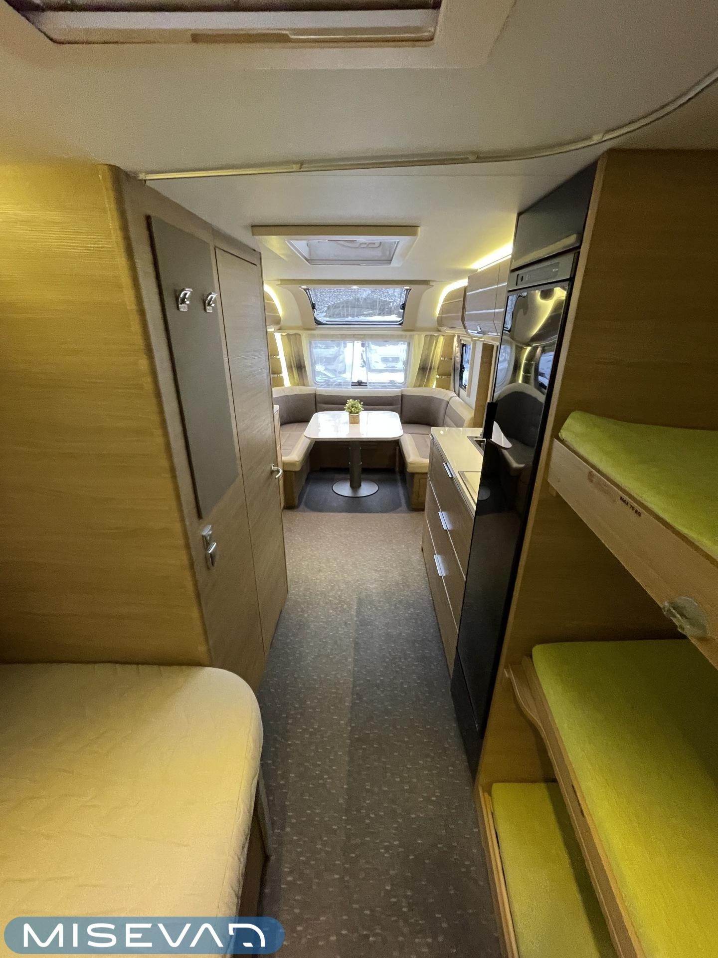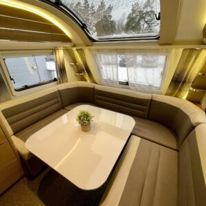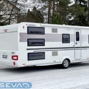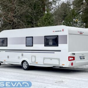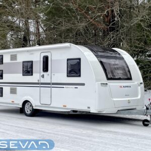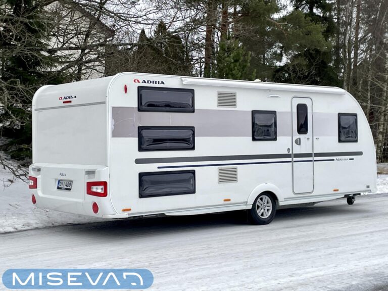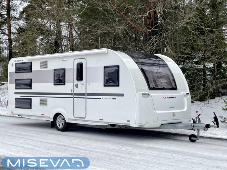 Adria Adora 593 UK, joka on todellinen tilaihme kompaktissa koossa! Tämä vaunu on suunniteltu palvelemaan suurempaakin porukkaa ilman, että perässävedettävyydestä tarvitsee tinkiä. Painoa on 1800 kg ja pituutta vain karvan verran yli 8 metriä, joten tämä liikkuu vetokoukun perässä todella vaivattomasti. Nukkumapaikkoja on kerrankin todella riittämiin: perältä löytyy huippusuosittu kolmikerrossänky lapsille, vieressä kiinteä levitettävä parivuode ja edestä valoisa U-istuinryhmä, josta loihdit vielä lisävuoteen käden käänteessä. Lämmityksestä vastaa, Alde-nestekeskuslämmitys sähköpatruunalla ja sähköisellä lattialämmityksellä, eli tällä vaunulla kelpaa reissata mukavasti ympäri vuoden. Keittiövarustus on vähinkäänkin riittävä: massiivinen jenkkijääkaappi vetää sisäänsä koko katraan eväät ja reilut työtasot tekevät kokkailusta nautinnollista. Vaunun kruunaa etuosan upea panoraamaikkuna, joka tuo valtavasti valoa ja avaruutta yhteisiin ruokailuhetkiin. Tässä on täydellinen paketti, jossa yhdistyvät fiksut neliöt, laatu ja helppous tule hakemaan omasi ja lähde nauttimaan vapaudesta!