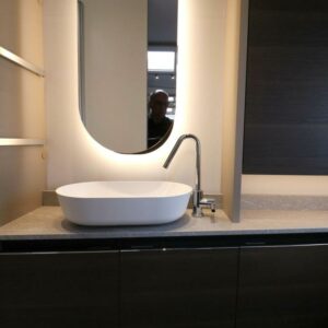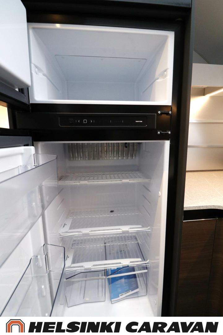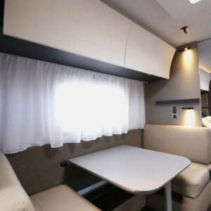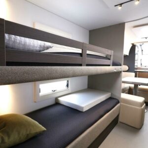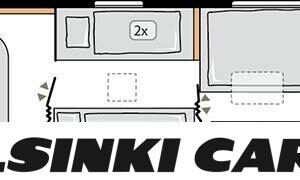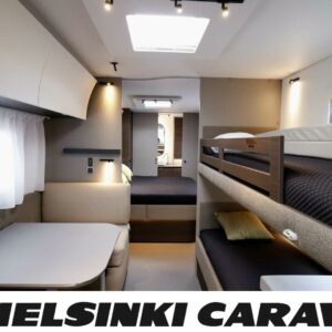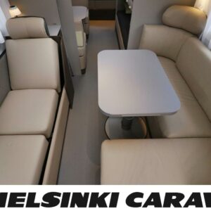 Upea etukeittiö, jossa paljon laskutilaa sekä iso jääkaappi-pakastin -yhdistelmä, kaasu-uuni sekä valtavasti luonnonvaloa suurten ikkunoiden ansiosta. Keskellä avara monikäyttöinen pöytäryhmä, joka sijattavissa vuoteeksi. Taaempana lastenhuone kerrosvuoteilla ja pienellä pöydällä, joka myös sijattavissa vuoteeksi. Seuraavana makuuhuone todella leveällä saarekevuoteella. Perällä koko vaunun levyinen pesuhuone erillisellä suihkutilalla.