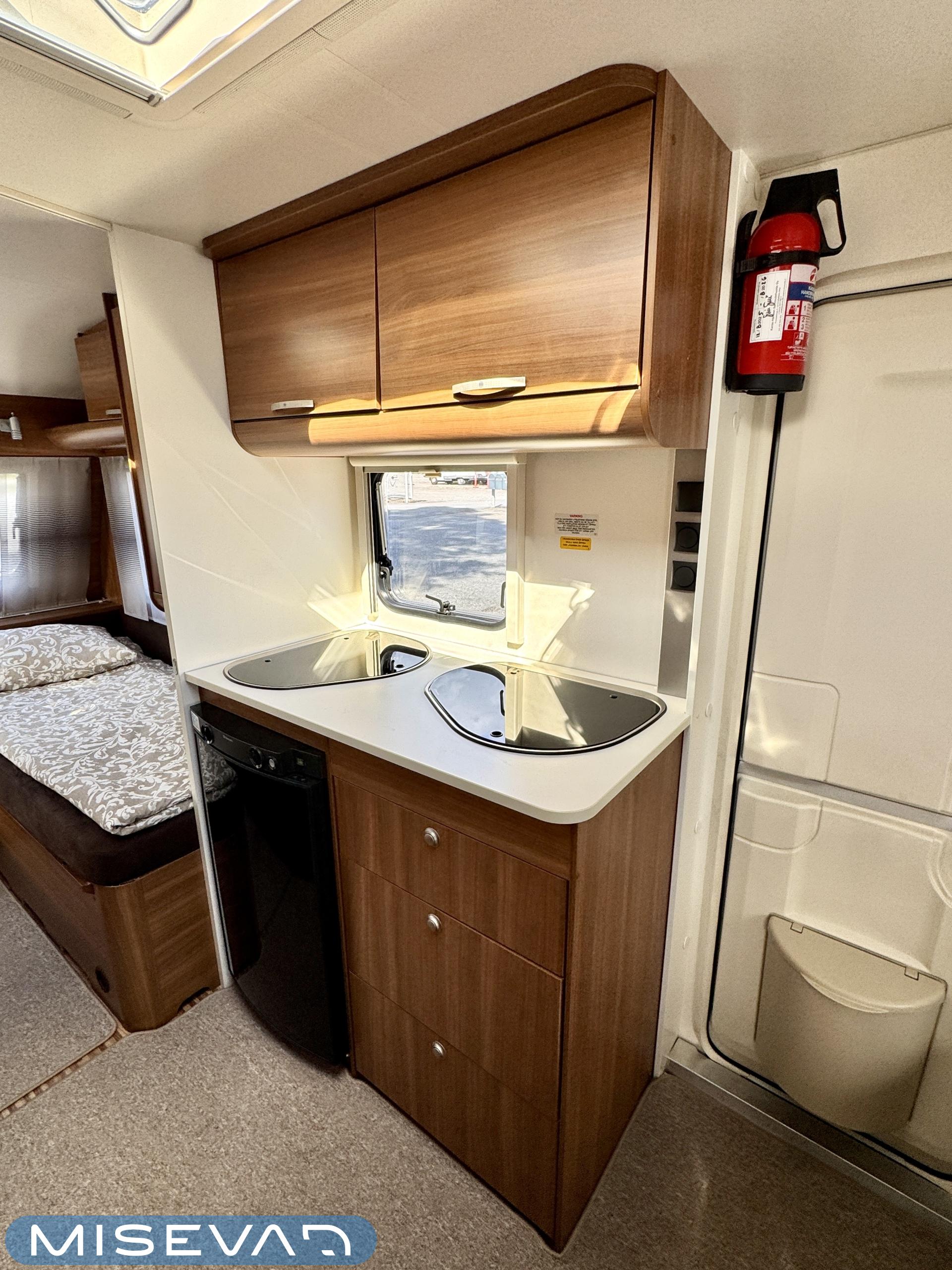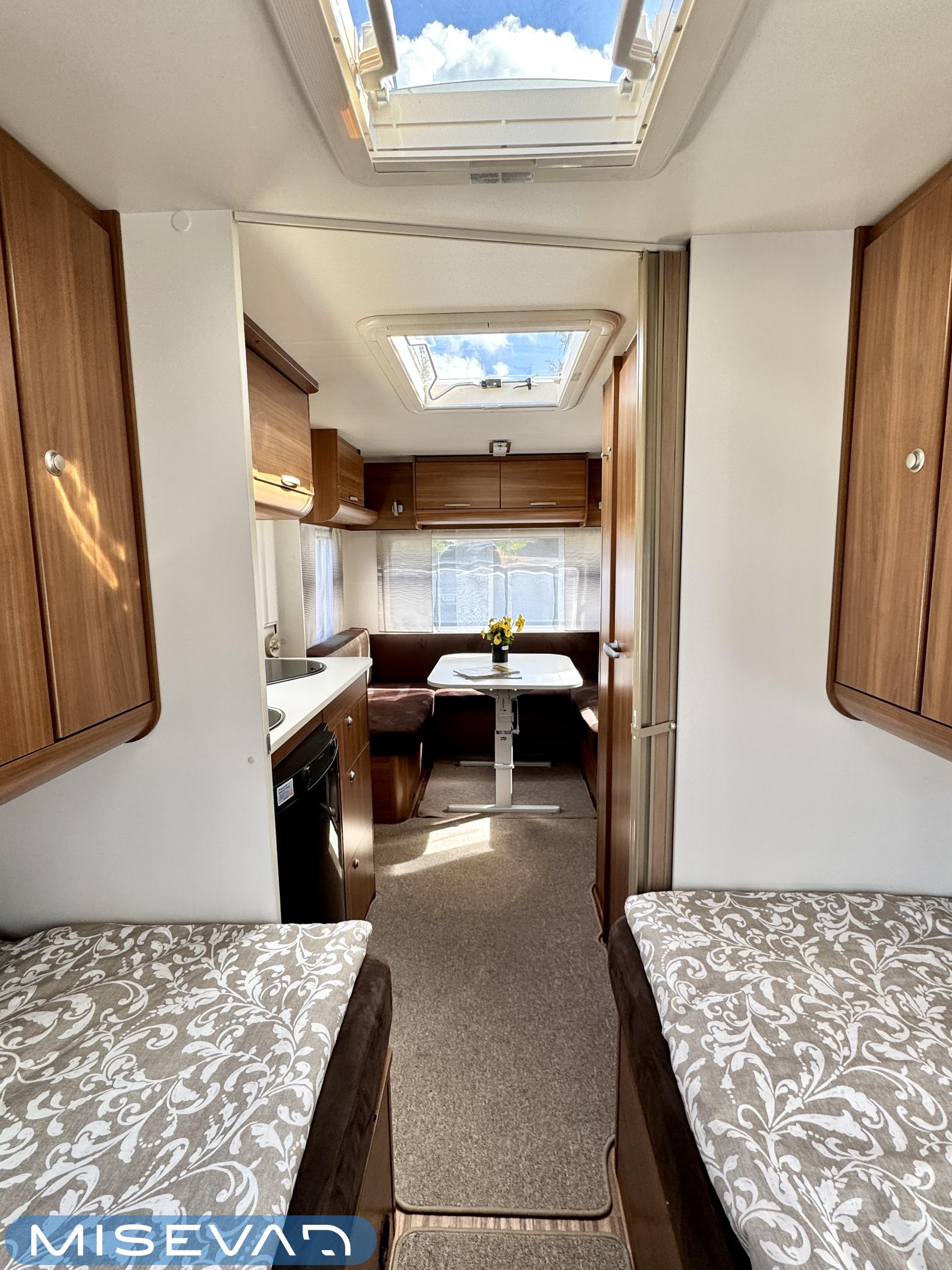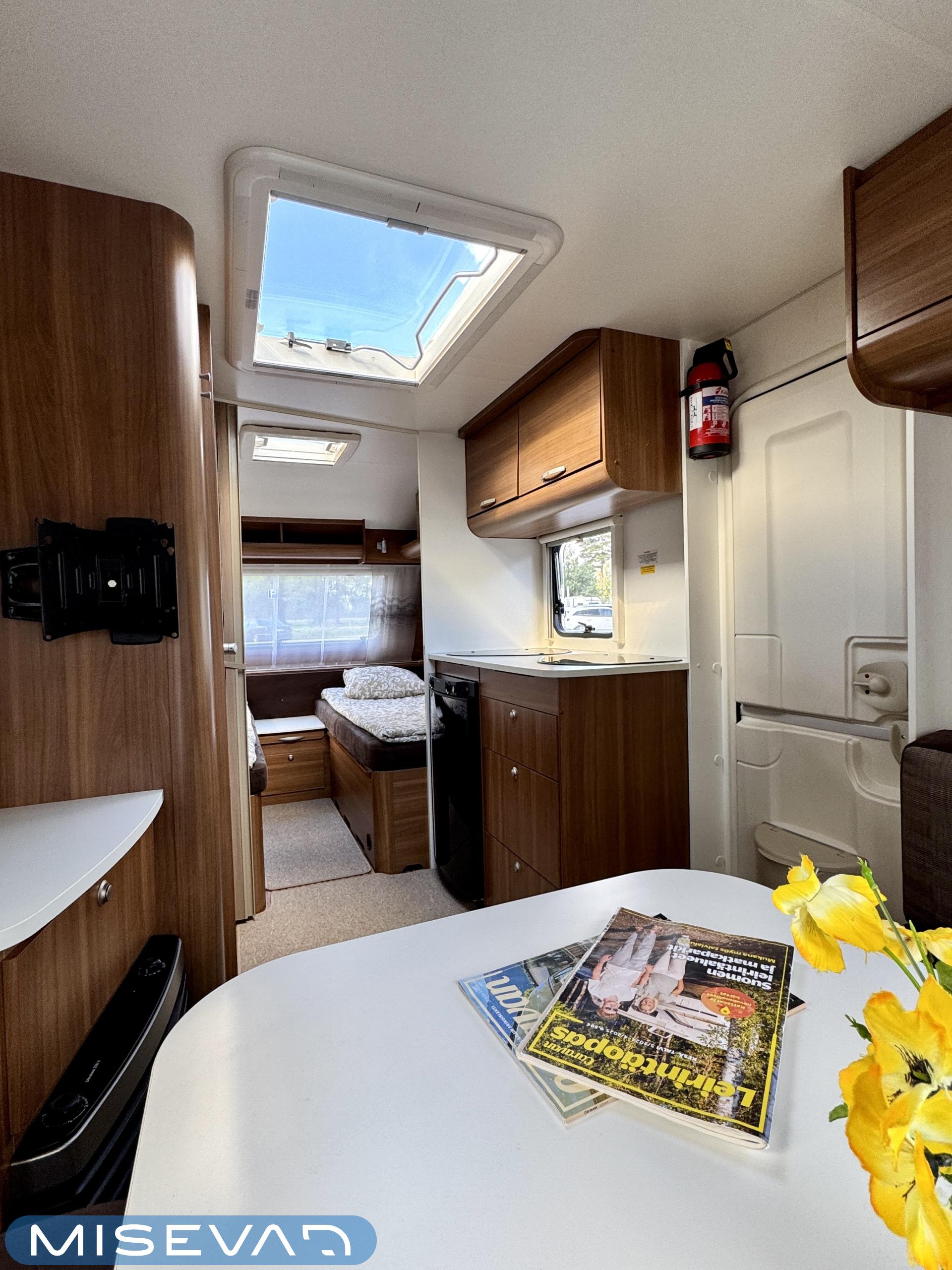 Sisätilat on verhoiltu tumman tyllikkääksi ja korostettu vaaleilla seinillä, sekä tasoilla. Yleisilme on ajattoman tyylikäs. Kaappitilaa on runsaasti läpi vaunun ja erillissänkyjen alta säilytystilaa löytyy lisää. Takana oleva ruokailuryhmä muuntuu kädenkäänteessä sängyksi ja vaunu on hetkessä nukkumapaikka neljälle. Keittiö palvelee vaunukokkia kokoisekseen loistavasti. Ei jää hernekeitot tai siskonmakkarasopat keittämättä. Vaunun keskiosasta löytyy hyvän kokoinen wc-tila. Kaksiosaisella ulko-ovella saa lämpimillä keleillä mukavan tuuletuksen vaunuun. Parasta vaunussa on sen isot ikkunat, joiden kautta aurinko saa sisätilan oikeuksiinsa.