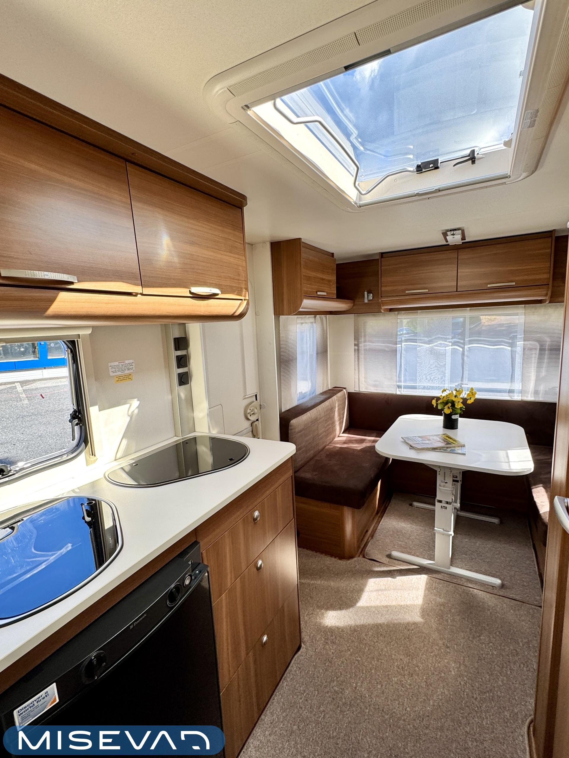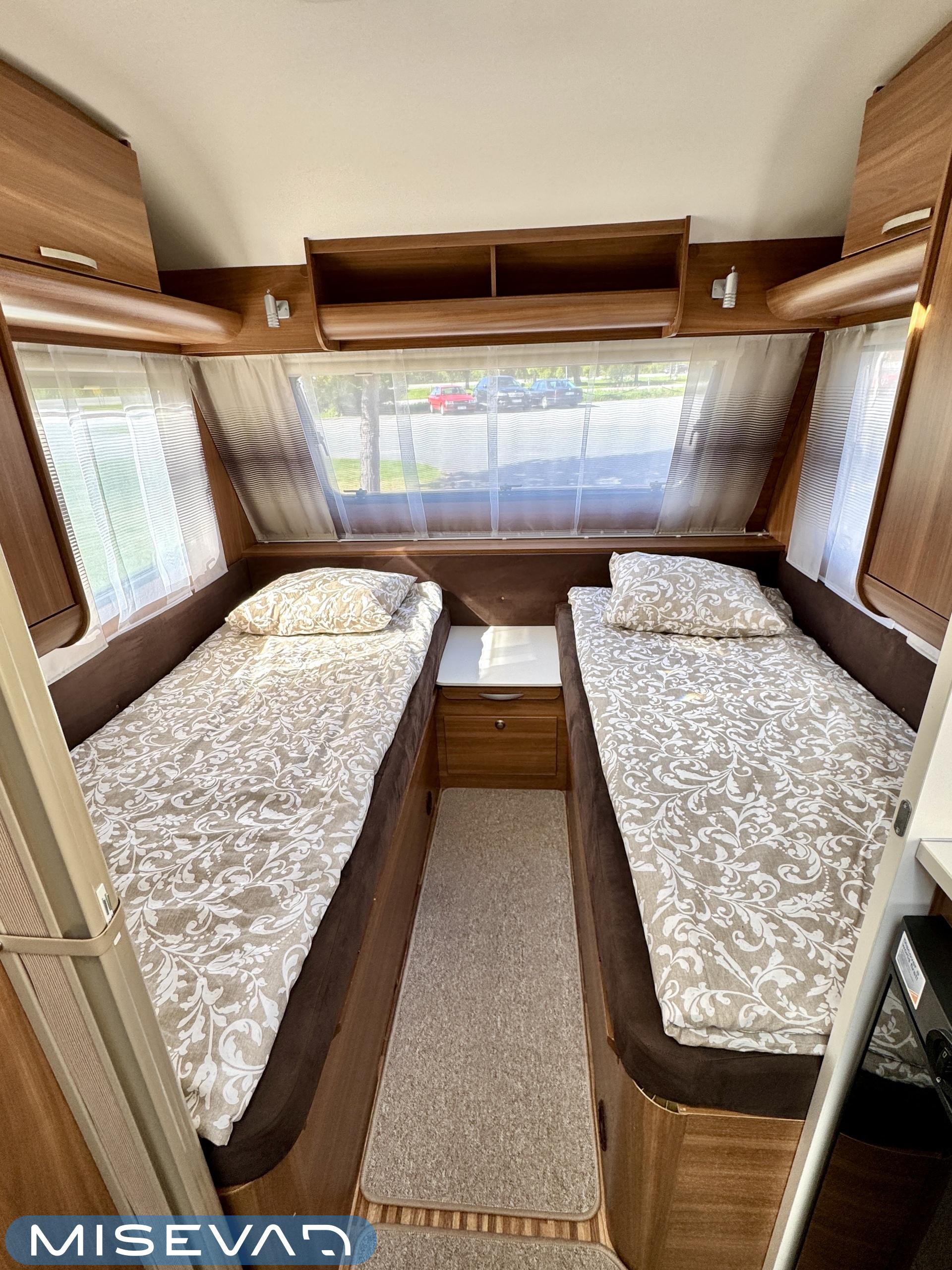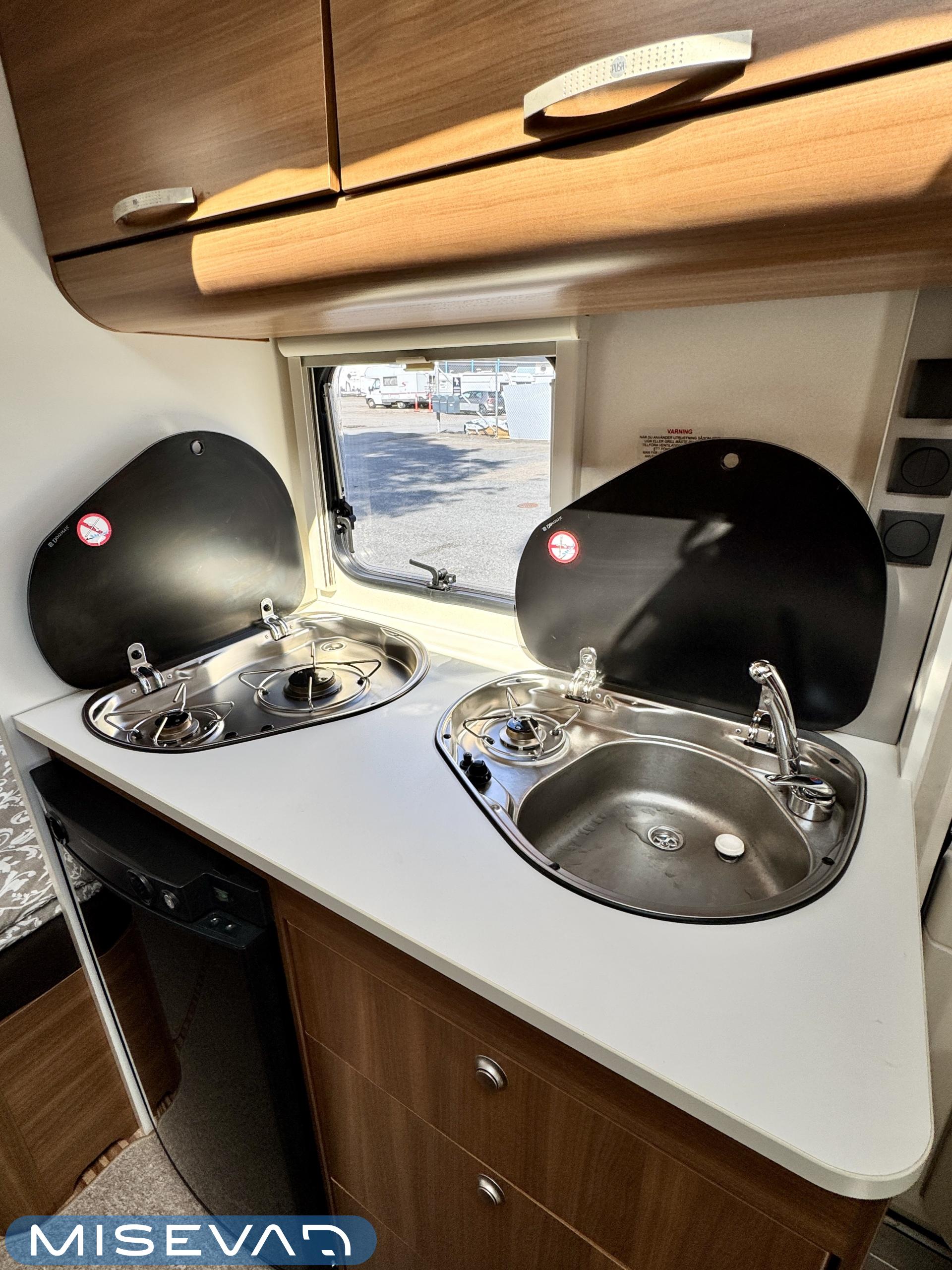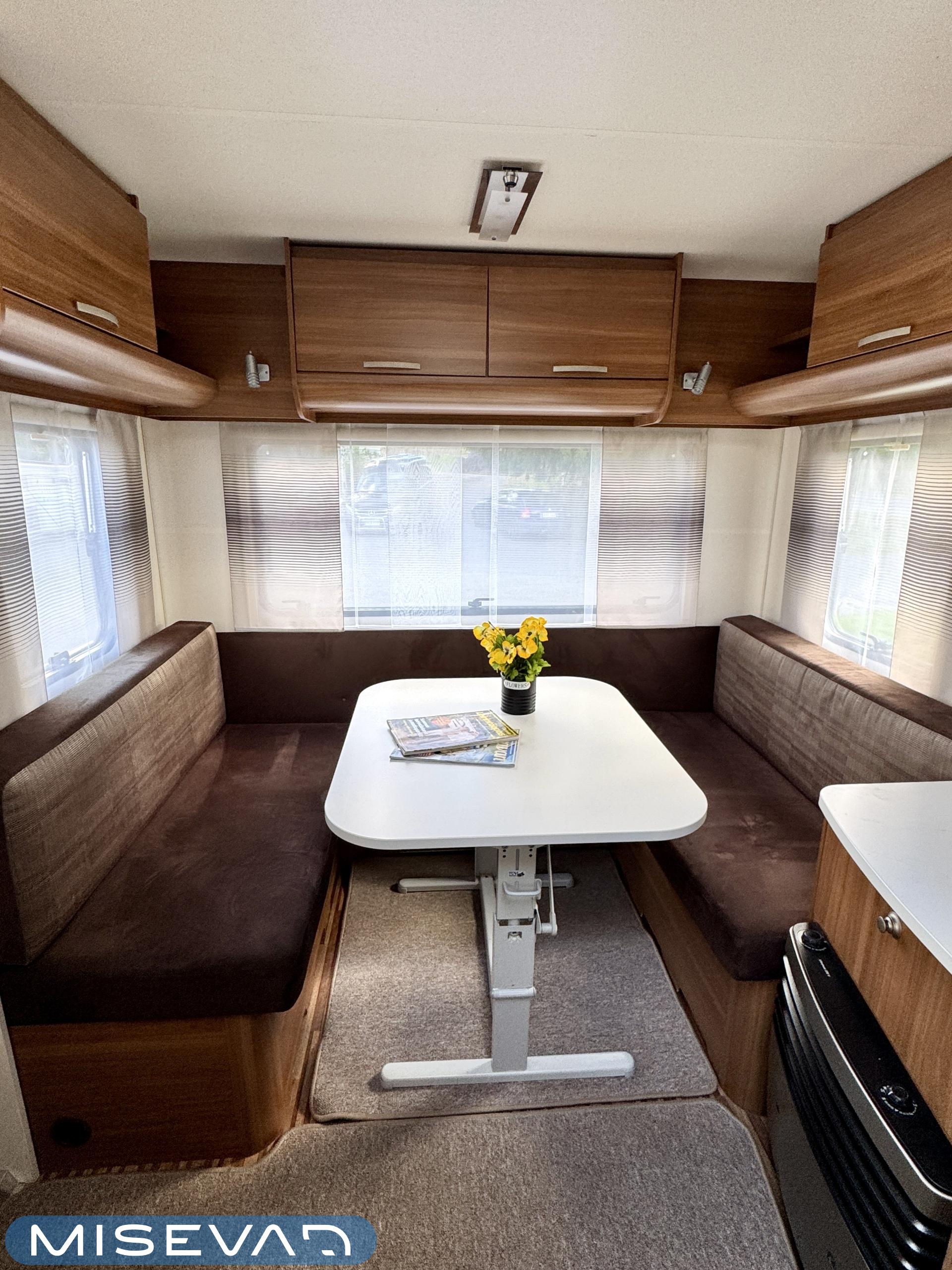 Sisätilat on verhoiltu tumman tyllikkääksi ja korostettu vaaleilla seinillä, sekä tasoilla. Yleisilme on ajattoman tyylikäs. Kaappitilaa on runsaasti läpi vaunun ja erillissänkyjen alta säilytystilaa löytyy lisää. Takana oleva ruokailuryhmä muuntuu kädenkäänteessä sängyksi ja vaunu on hetkessä nukkumapaikka neljälle. Keittiö palvelee vaunukokkia kokoisekseen loistavasti. Ei jää hernekeitot tai siskonmakkarasopat keittämättä. Vaunun keskiosasta löytyy hyvän kokoinen wc-tila. Kaksiosaisella ulko-ovella saa lämpimillä keleillä mukavan tuuletuksen vaunuun. Parasta vaunussa on sen isot ikkunat, joiden kautta aurinko saa sisätilan oikeuksiinsa.