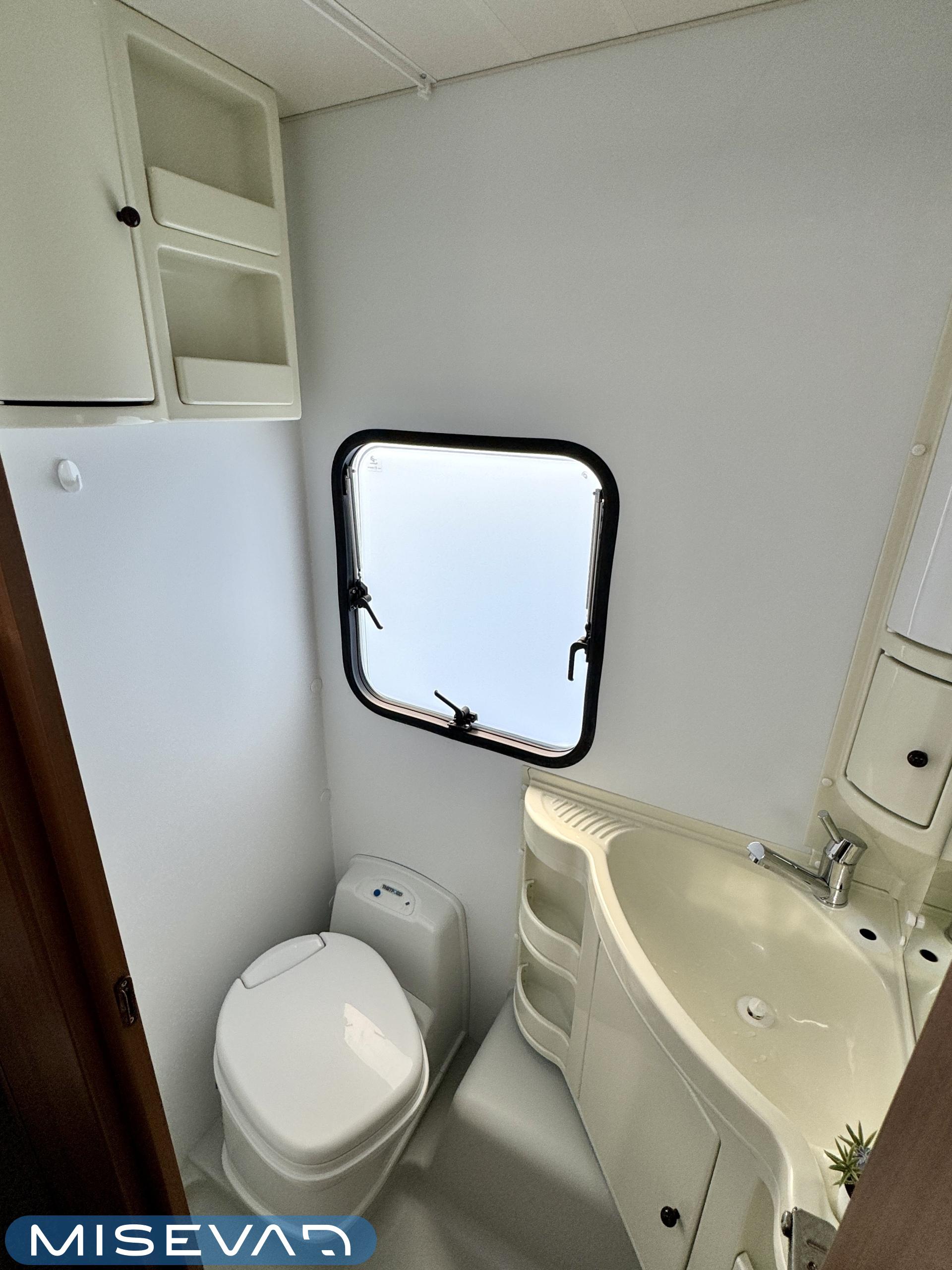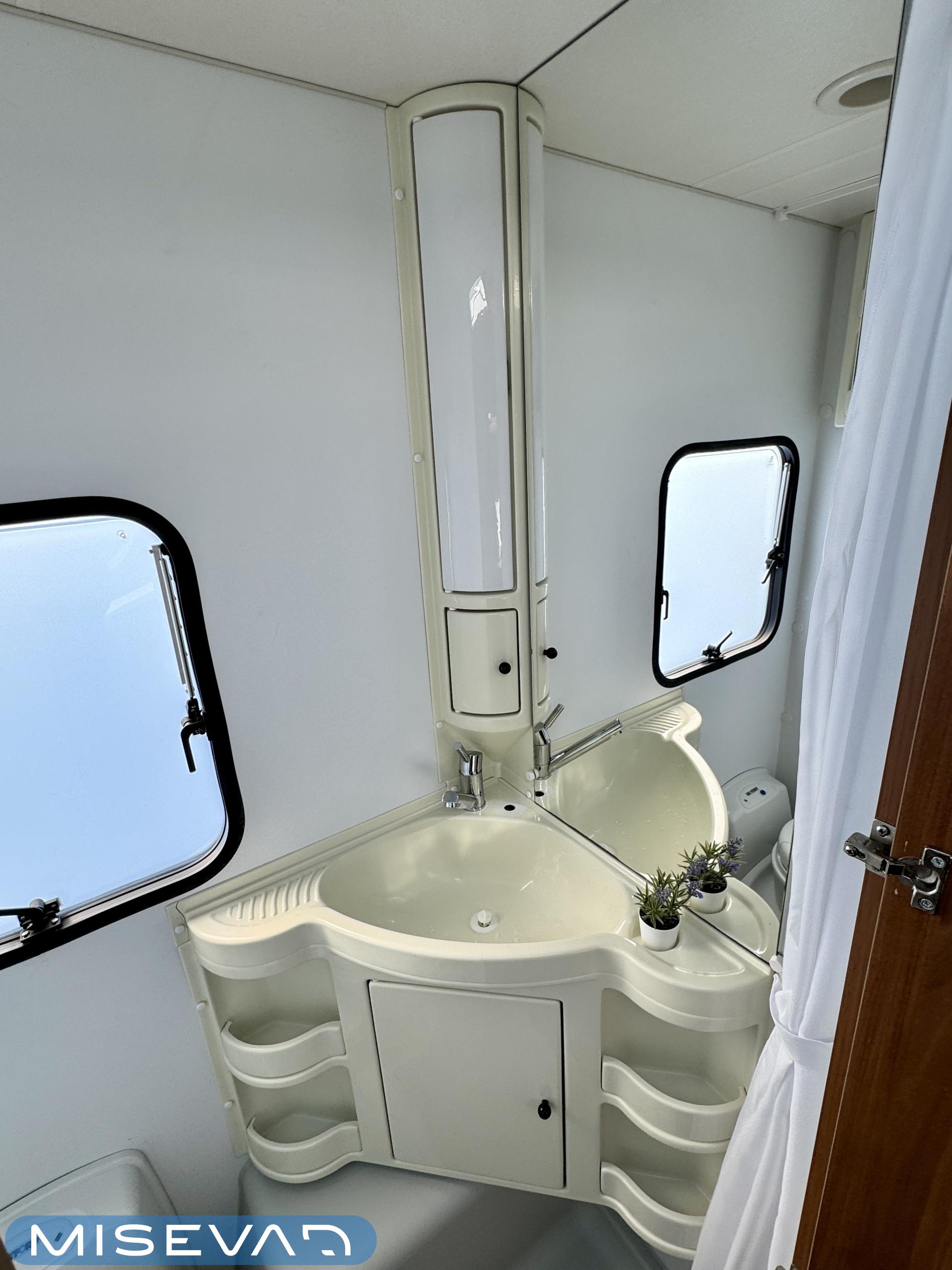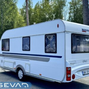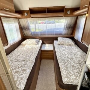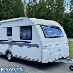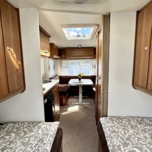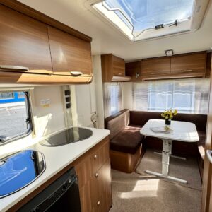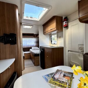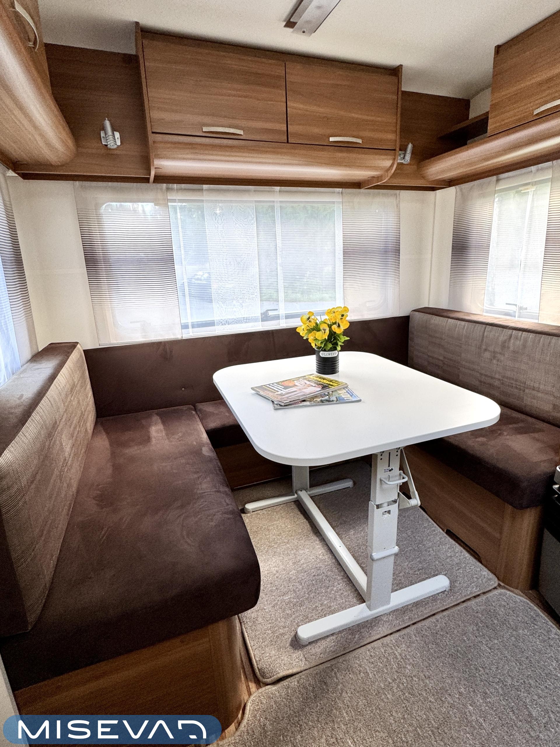 Sisätilat on verhoiltu tumman tyllikkääksi ja korostettu vaaleilla seinillä, sekä tasoilla. Yleisilme on ajattoman tyylikäs. Kaappitilaa on runsaasti läpi vaunun ja erillissänkyjen alta säilytystilaa löytyy lisää. Takana oleva ruokailuryhmä muuntuu kädenkäänteessä sängyksi ja vaunu on hetkessä nukkumapaikka neljälle. Keittiö palvelee vaunukokkia kokoisekseen loistavasti. Ei jää hernekeitot tai siskonmakkarasopat keittämättä. Vaunun keskiosasta löytyy hyvän kokoinen wc-tila. Kaksiosaisella ulko-ovella saa lämpimillä keleillä mukavan tuuletuksen vaunuun. Parasta vaunussa on sen isot ikkunat, joiden kautta aurinko saa sisätilan oikeuksiinsa.