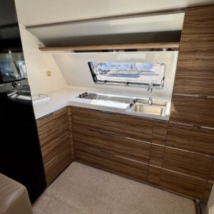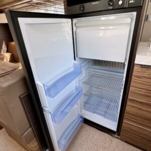 Vaunun etuosassa on L:n muotoinen keittiö, jossa on mukavasti laskutilaa. Keittiön varustukseen kuuluu kaasulieden lisäksi tilava jääkaappi- pakastin ja mikroaaltouuni.