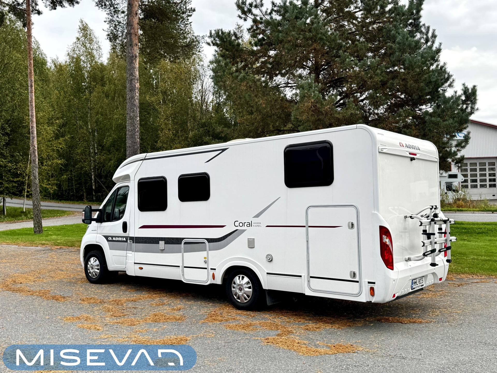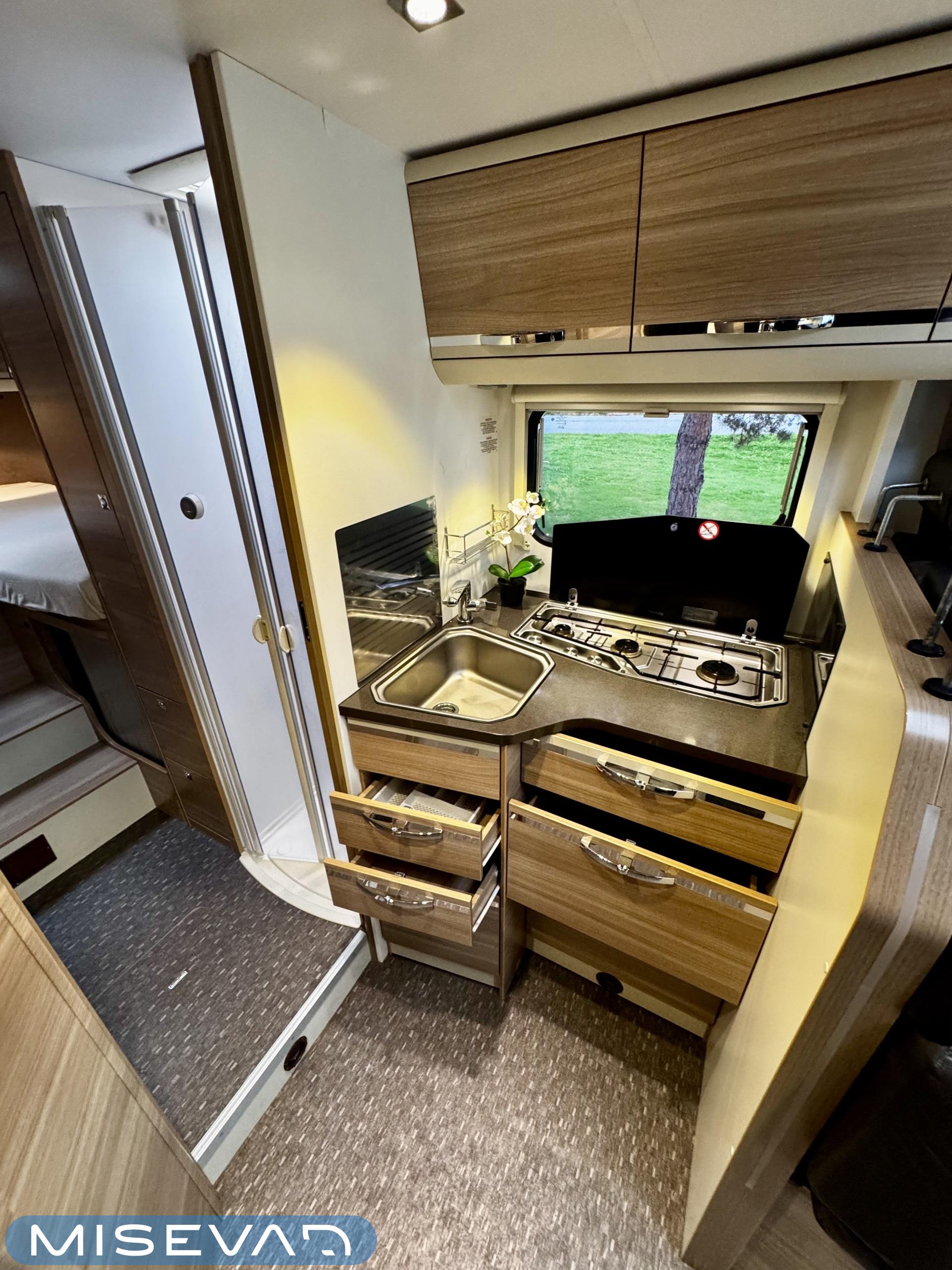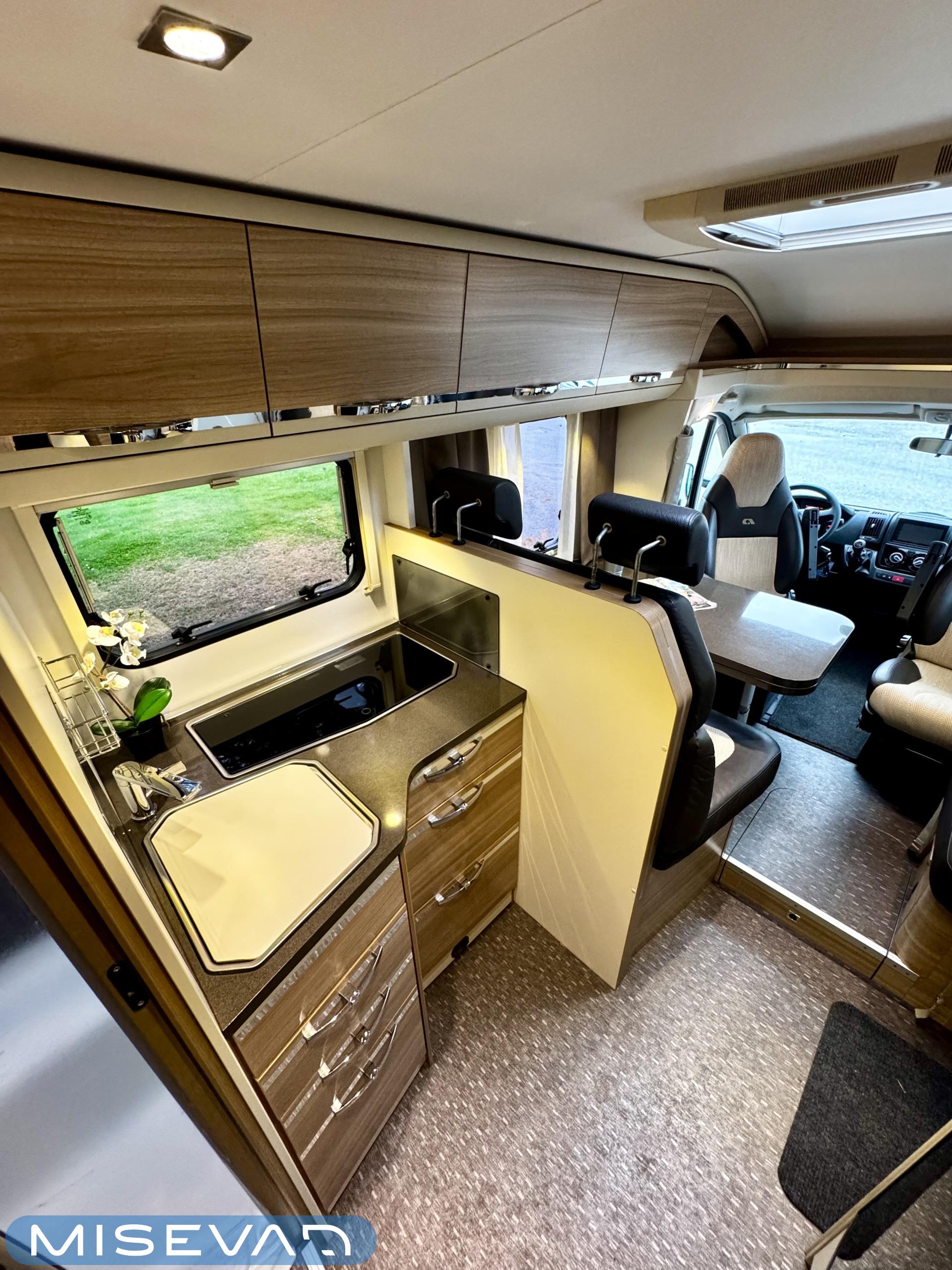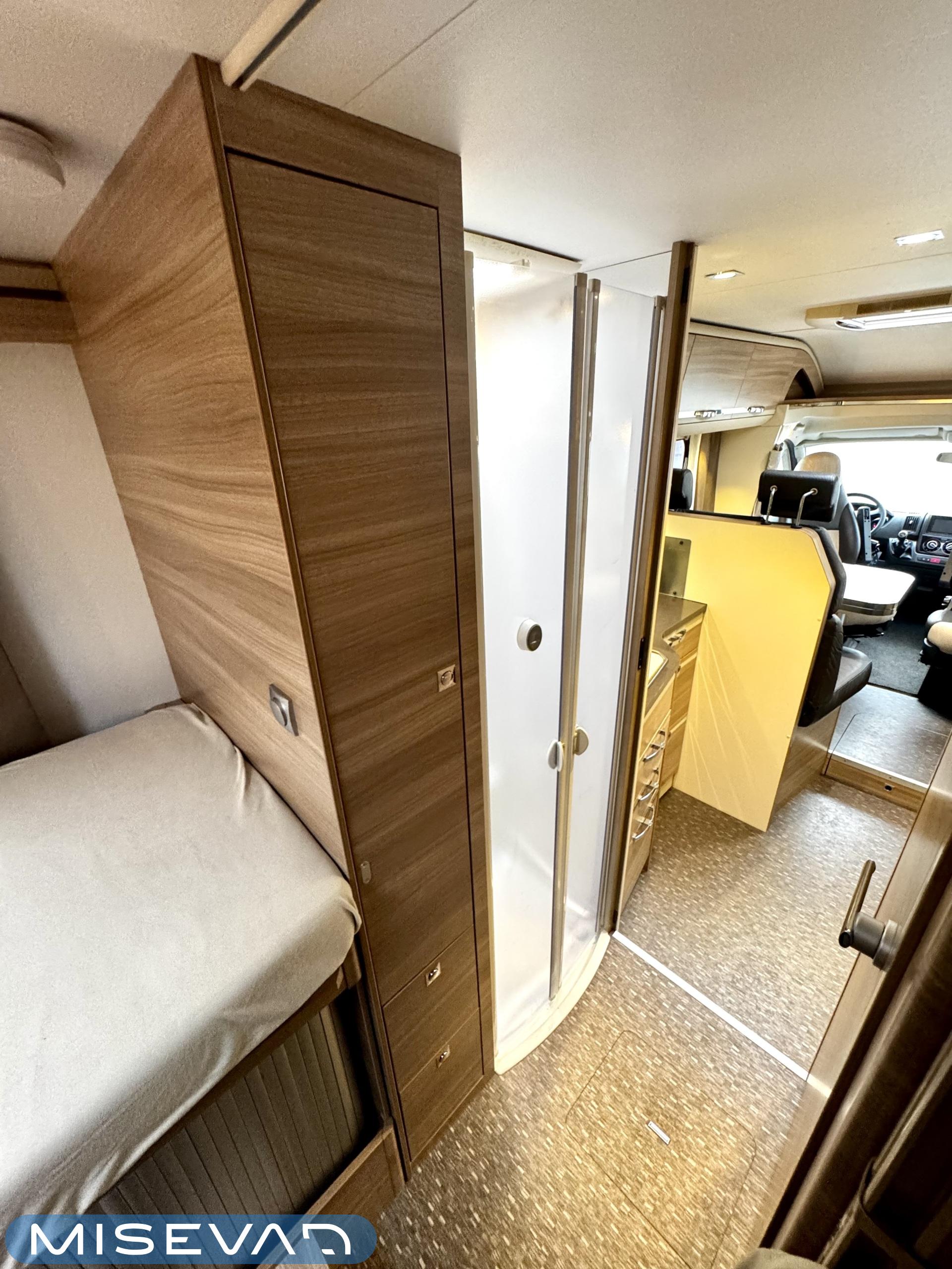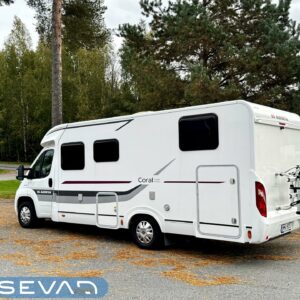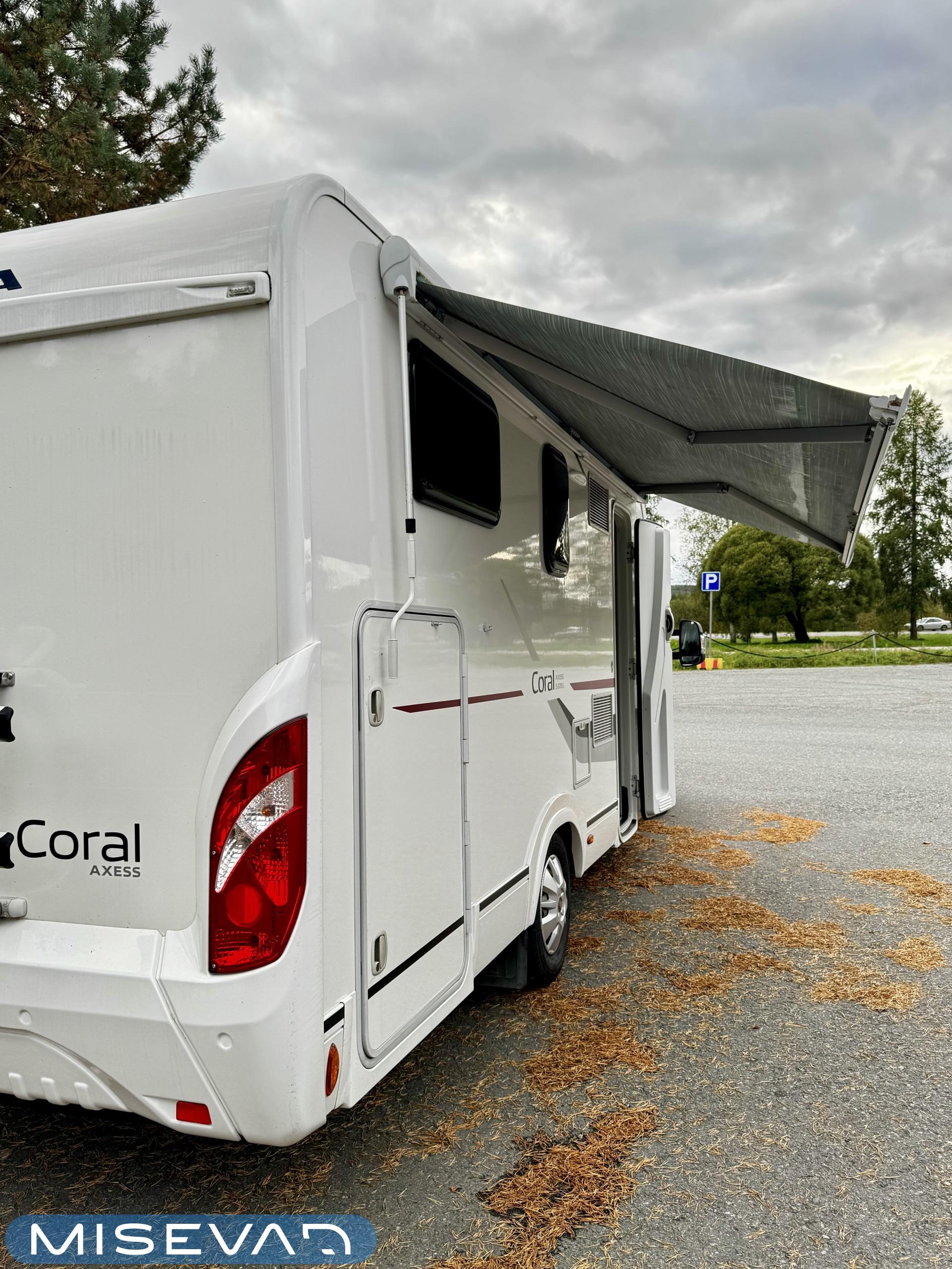 Silmä lepää Coralin sisustassa. Kaikki on niin harmoniassa keskenään. Auton takaa löytyy mukavat erillissängyt, jotka saa yhdistettyä isoksi kokonaisuudeksi. Helposti majoittaen vaikka kolmekin nukkujaa. Säilytystilaa on luotu myös sänkyjen alapuolelle, portaiden viereen. WC ja suihku ovat molemmat erikseen. WC:n ovella takaosan saa omaksi tilaksi helposti. Kaapistoja on pitkin autoa ja tilava takatalli pitää huolen, että mukana kulkee myös harrastuksiin liittyvät tamineet. Tai vaikkapa kokonainen terassikalusto. Keittiössä ei myöskään lopu tila kesken, kuusi ulos vedettävää laatikostoa kätkee sisäänsä kaikki tarvittavat kokkailuvälineet. Lisäksi varusteisiin kuuluu isojääkaappi, erillisellä pakastimella. Ruokapöytä on mitoitettu viidelle ja muuntautuu tarvittaessa sängyksi. Tule tutustumaan tähänkin ajoneuvoon Misevalle ja lähde reissuun Coralilla!