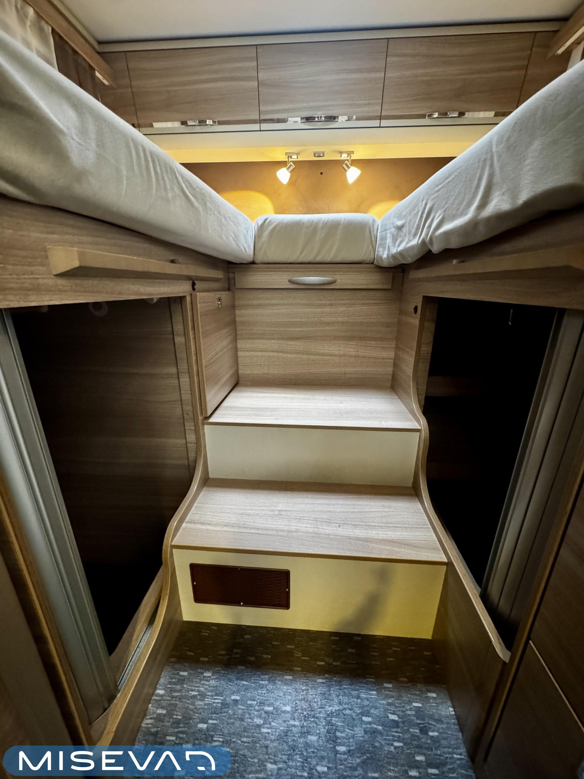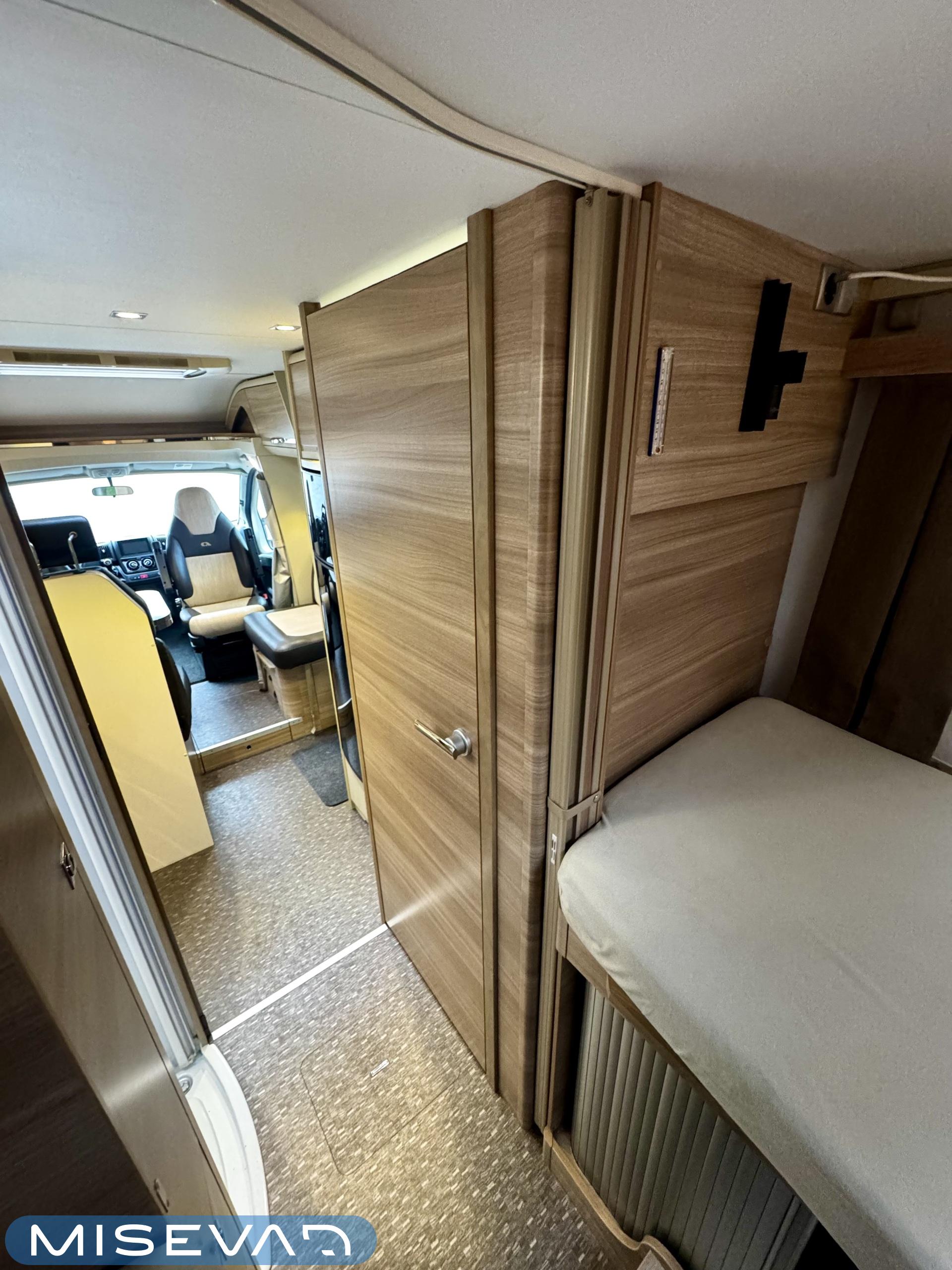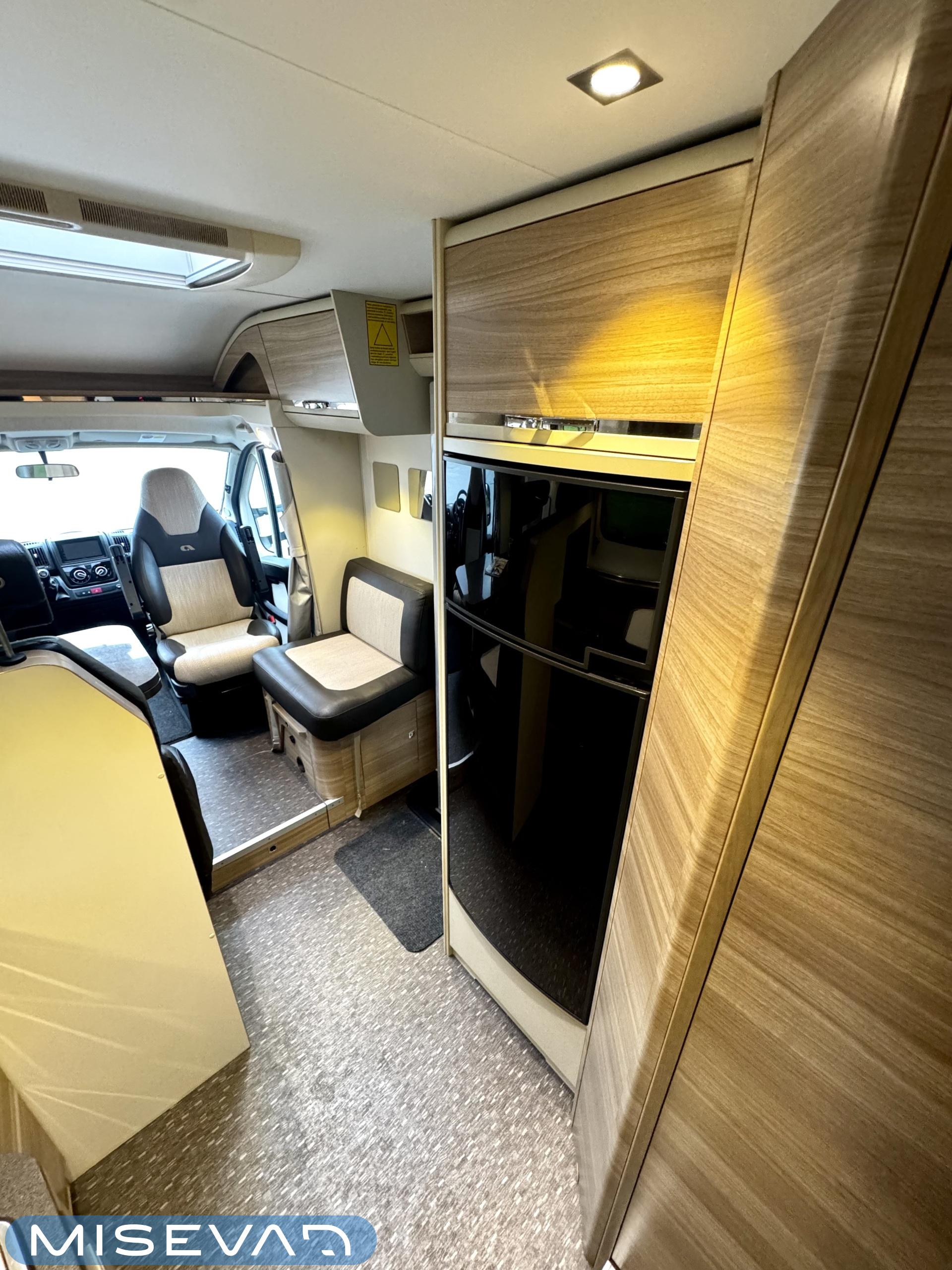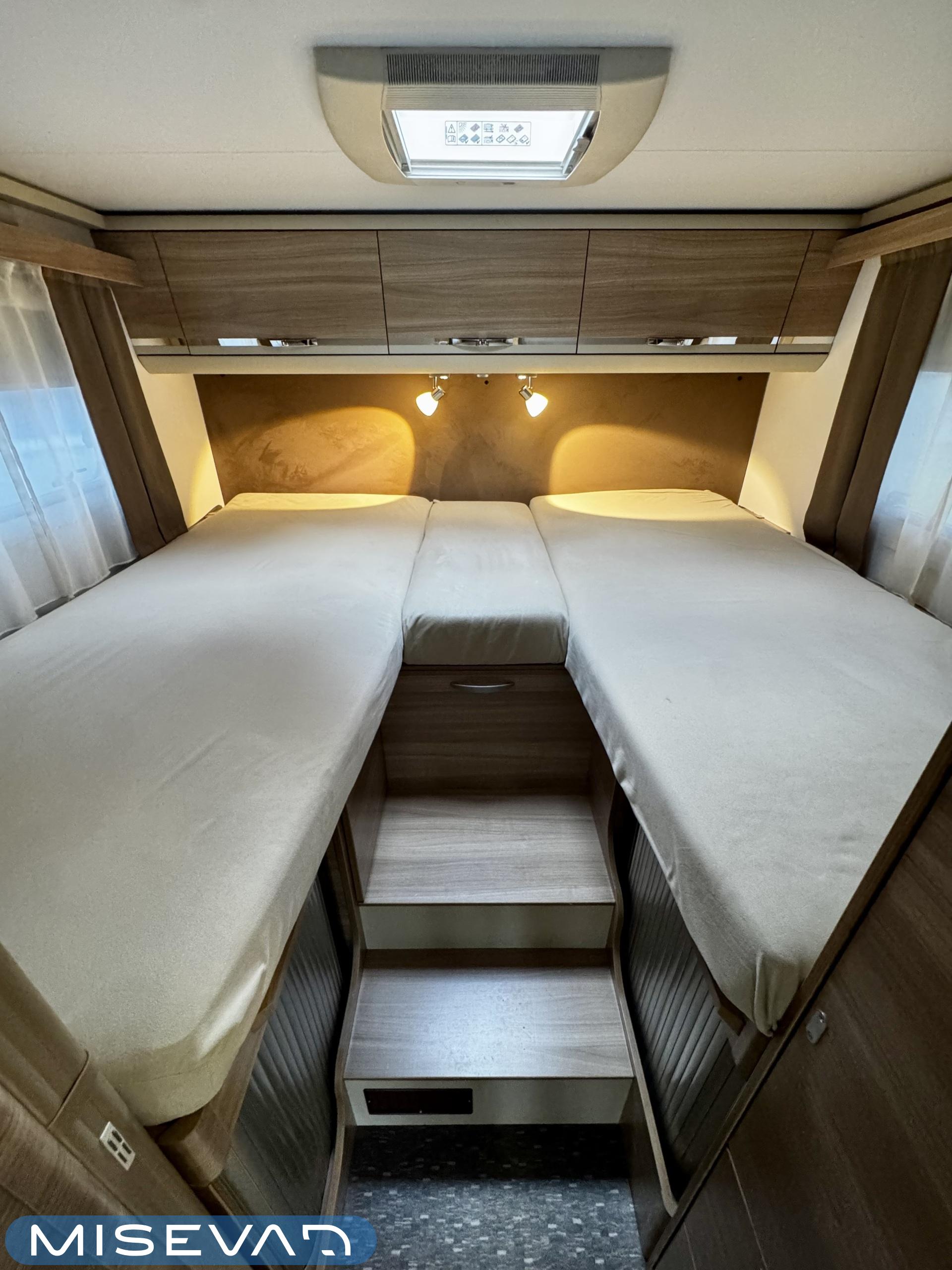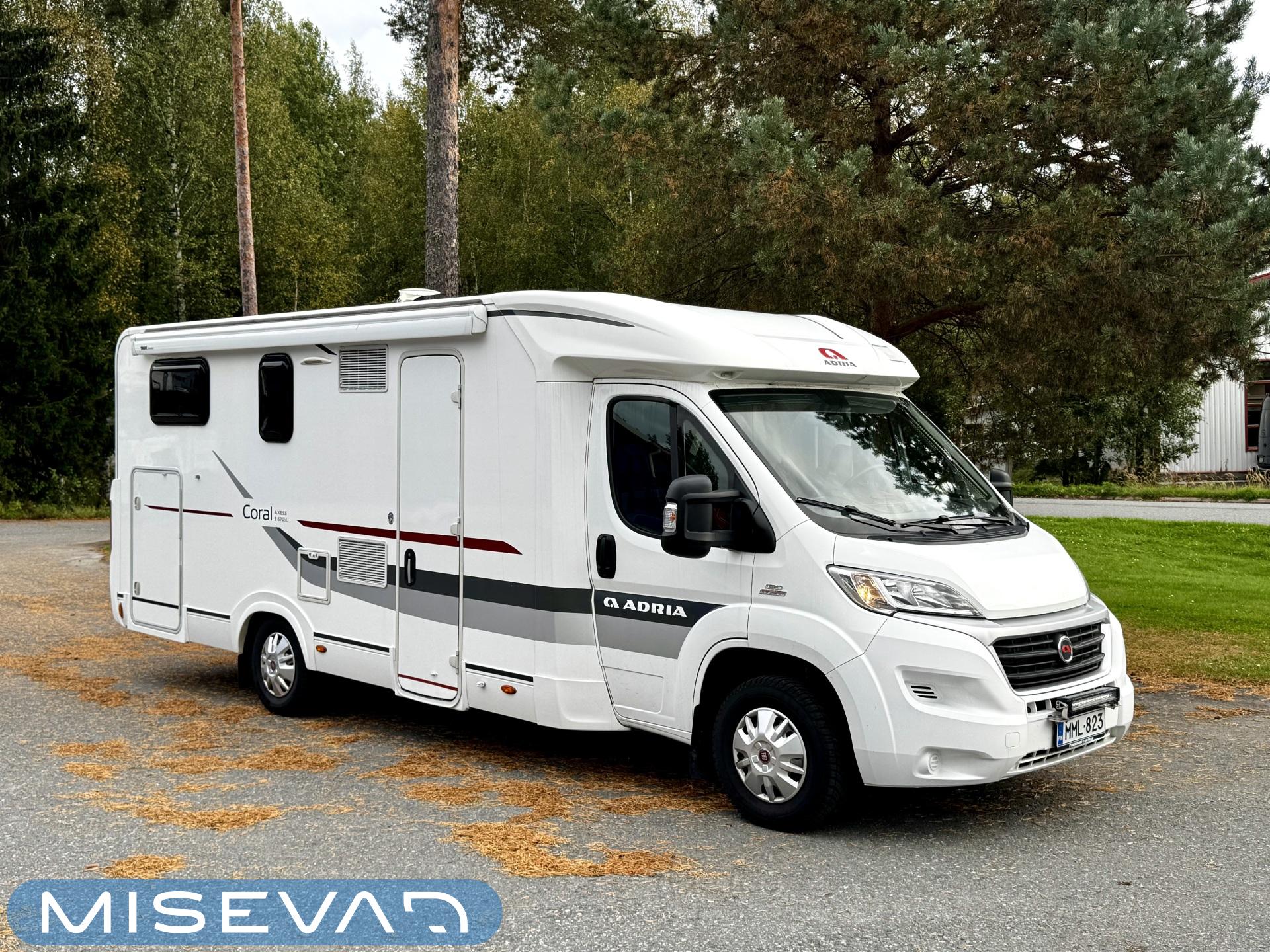 Silmä lepää Coralin sisustassa. Kaikki on niin harmoniassa keskenään. Auton takaa löytyy mukavat erillissängyt, jotka saa yhdistettyä isoksi kokonaisuudeksi. Helposti majoittaen vaikka kolmekin nukkujaa. Säilytystilaa on luotu myös sänkyjen alapuolelle, portaiden viereen. WC ja suihku ovat molemmat erikseen. WC:n ovella takaosan saa omaksi tilaksi helposti. Kaapistoja on pitkin autoa ja tilava takatalli pitää huolen, että mukana kulkee myös harrastuksiin liittyvät tamineet. Tai vaikkapa kokonainen terassikalusto. Keittiössä ei myöskään lopu tila kesken, kuusi ulos vedettävää laatikostoa kätkee sisäänsä kaikki tarvittavat kokkailuvälineet. Lisäksi varusteisiin kuuluu isojääkaappi, erillisellä pakastimella. Ruokapöytä on mitoitettu viidelle ja muuntautuu tarvittaessa sängyksi. Tule tutustumaan tähänkin ajoneuvoon Misevalle ja lähde reissuun Coralilla!