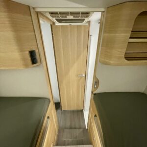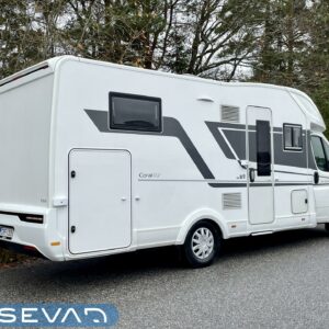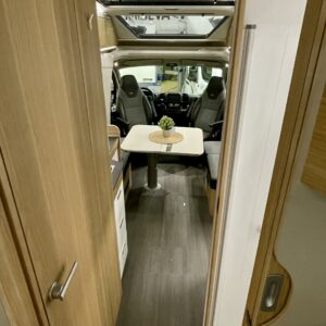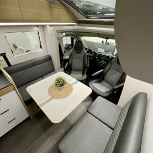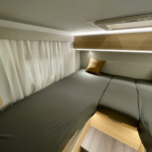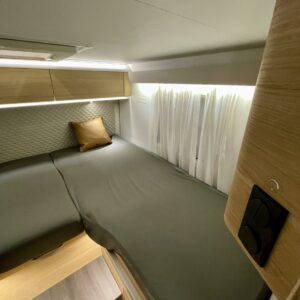 Upea kokonaisuus vaaleilla sävyillä paljon matkustavalle pariskunnalle. Selkeät erillisvuoteet, joihin saa myös koko auton levyisen pitkittäisen parivuoteen lisäpatjoilla. Tilapäisen sängyn satunnaisille vierailijoille pystytään rakentamaan viehättävästä istuinryhmästä, jossa muuten 6 henkilöä nauttii illasta. Iso jenkkijääkaappi ja liesi edesauttavat ruuan tekoa ja ei pidä unohtaa erillisiä Wc- ja suihkutiloja.