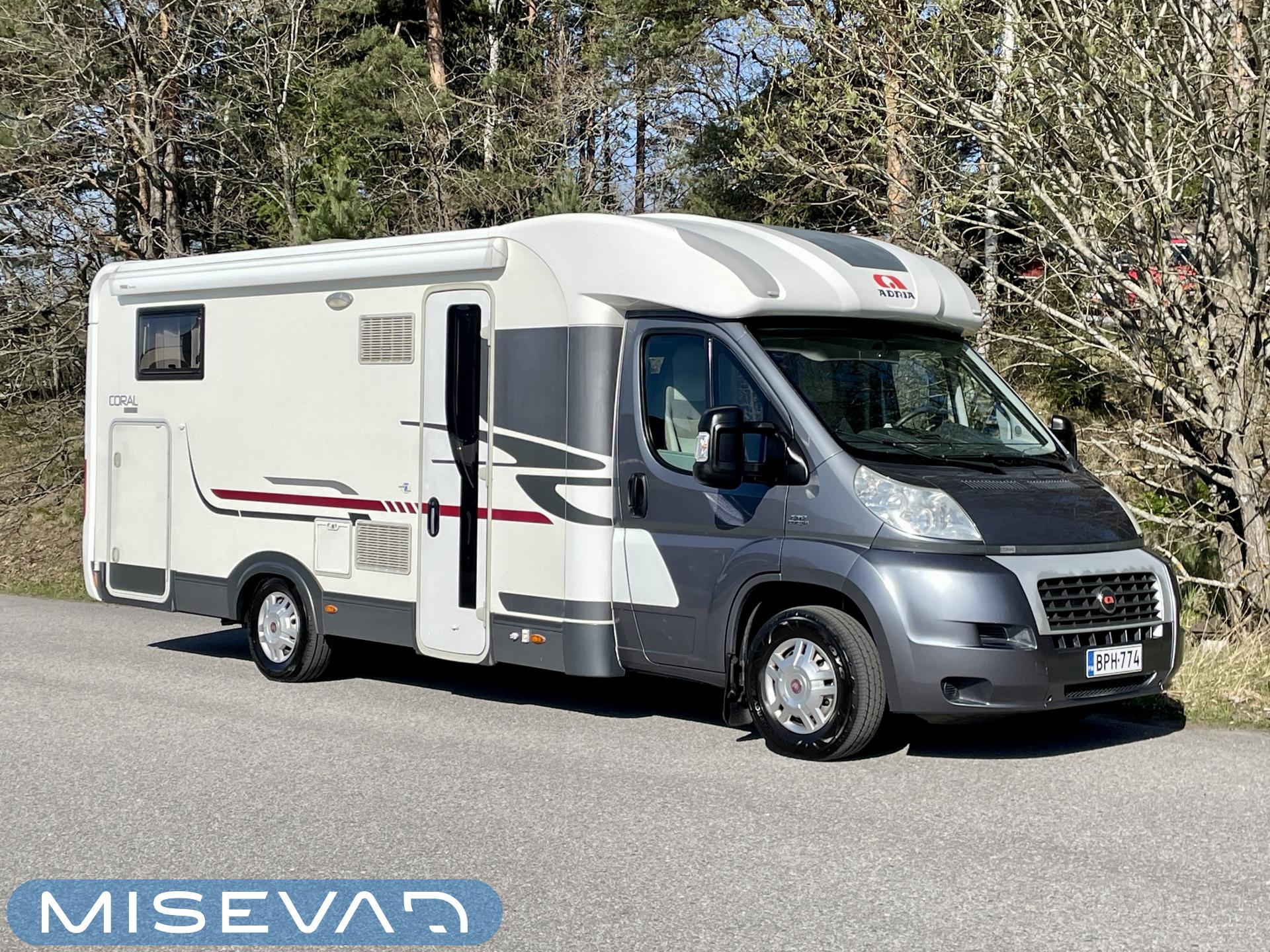Tässä varusteltu Adria erillisvuoteilla ja isolla tavaratilalla valmiina reissuun