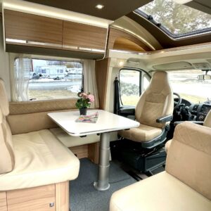 Auto on hyvin siisti niin sisältä, kuin ulkopuoleltakin. Etuosassa on tilava istuinryhmä käntyvine etuopenkkeineen ja myös istuin viidennelle matkustajalle. Keskiosassa on tilaa antavas L-muotoinen keittiö ja korkea jääkaappi.
