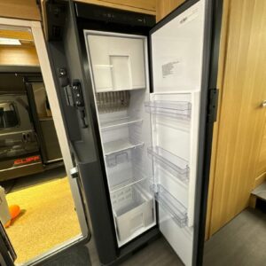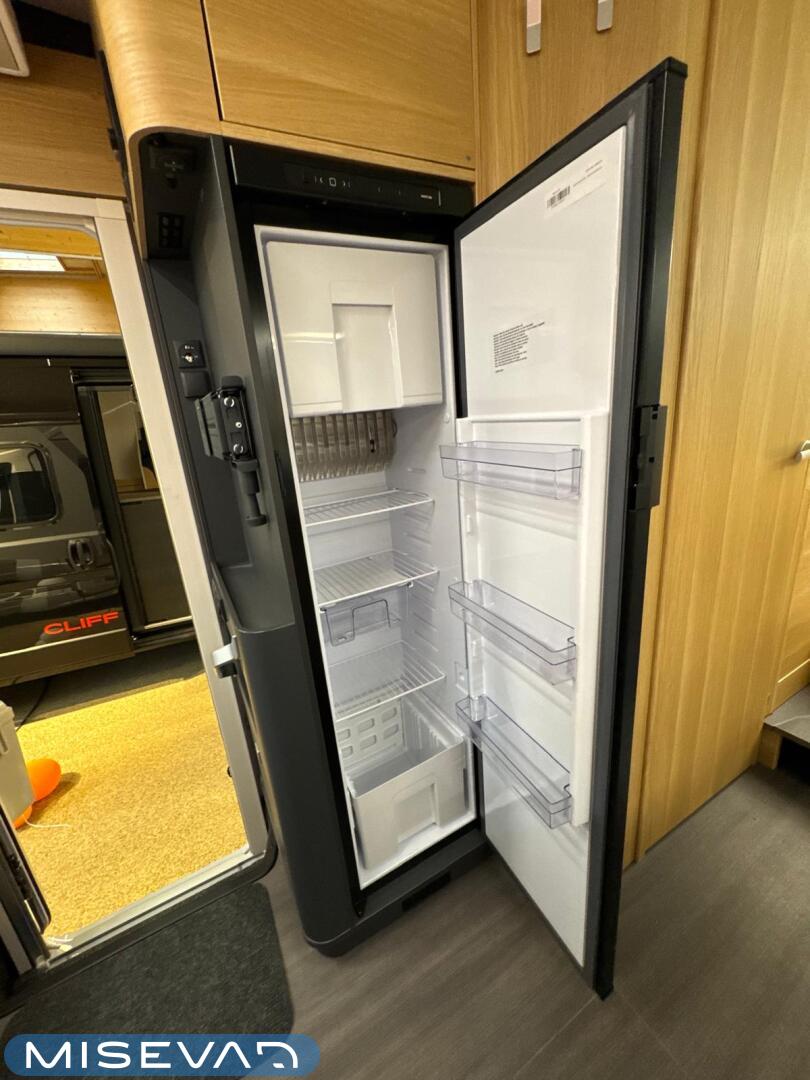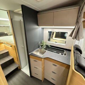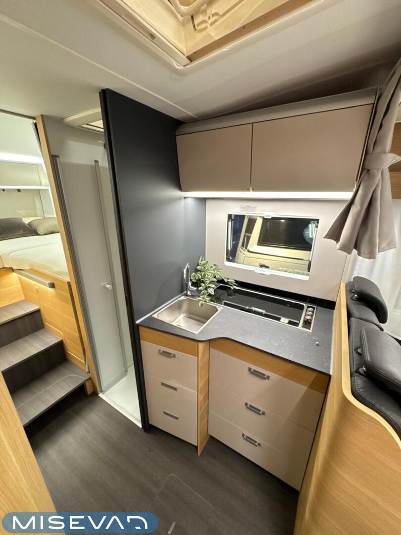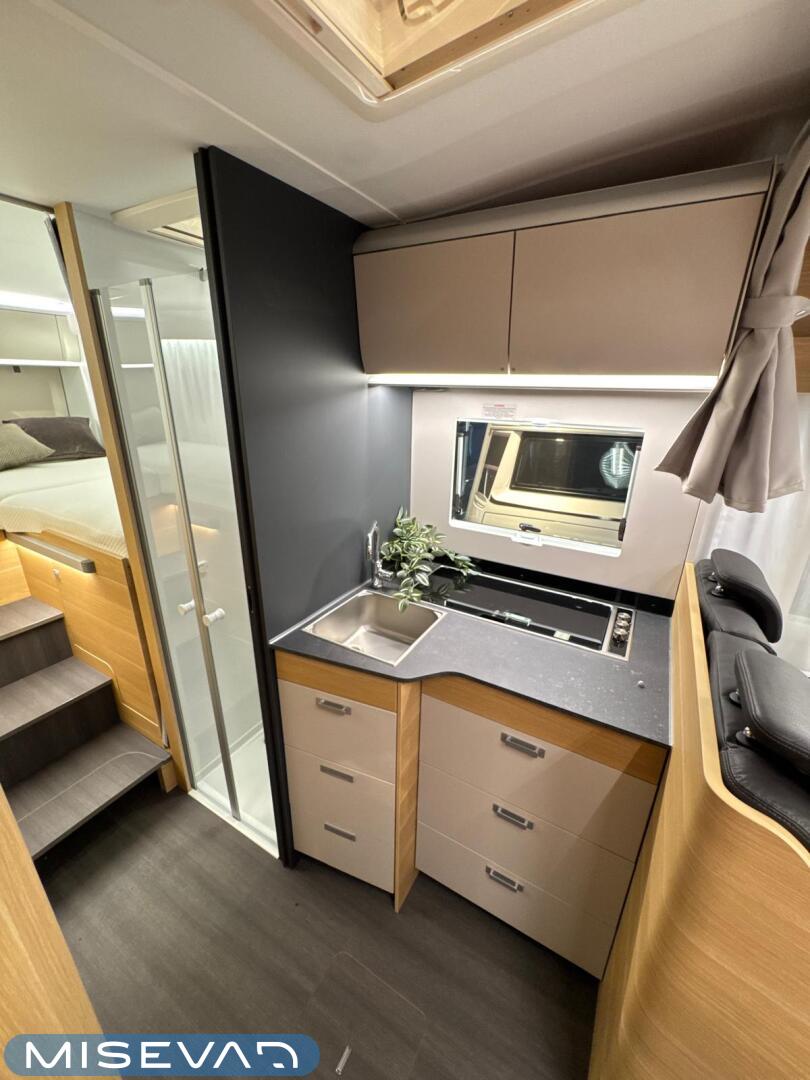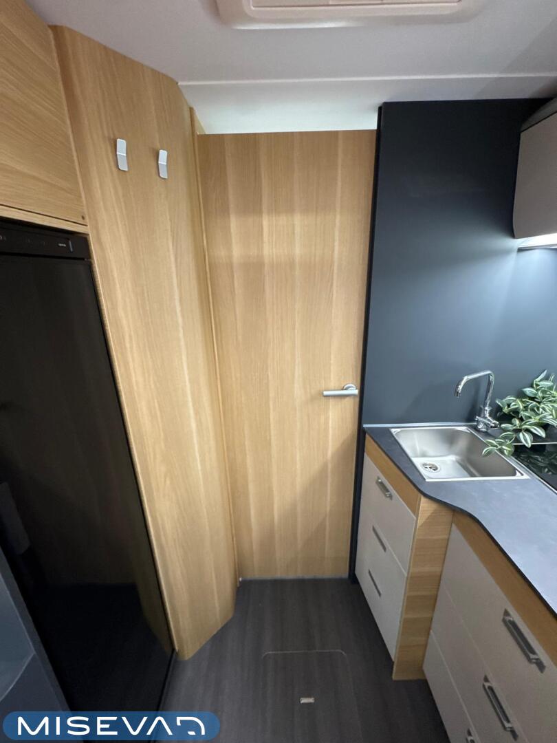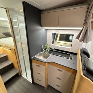 Auton keskivaiheilla on keittiö, jonka varustukseen kuuluu liesituuletin ja iso jääkaappi- pakastin.