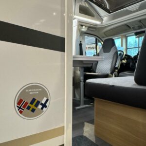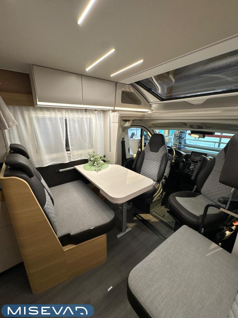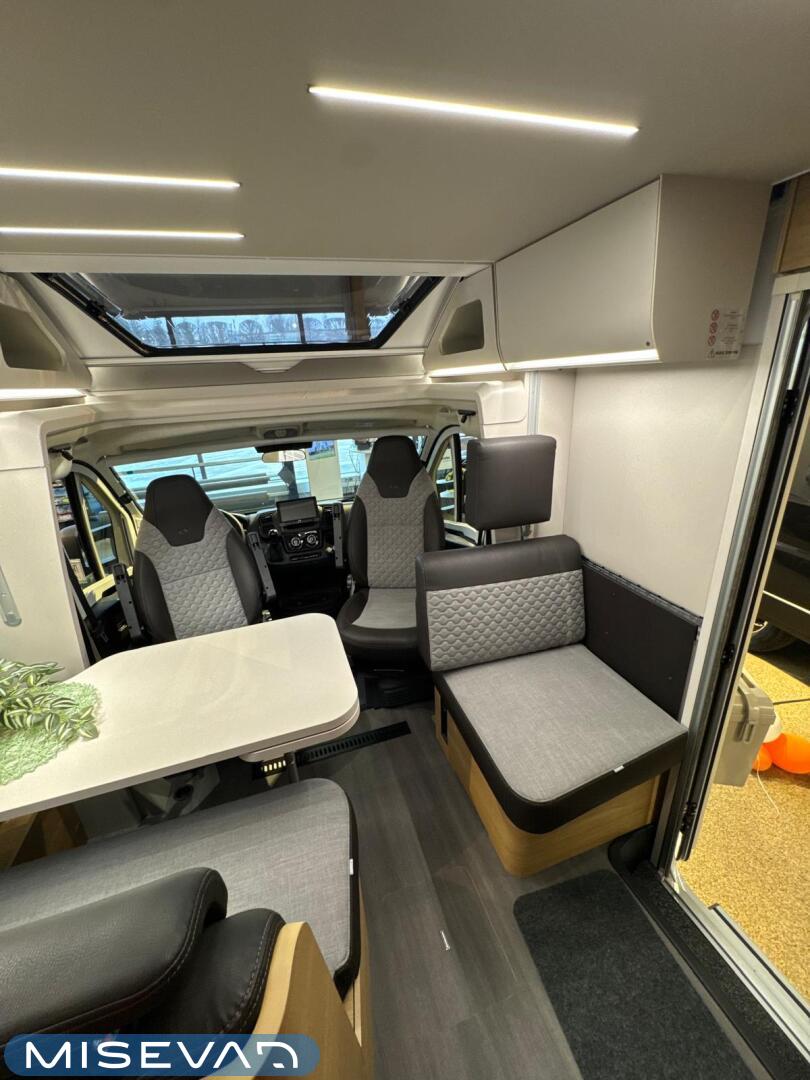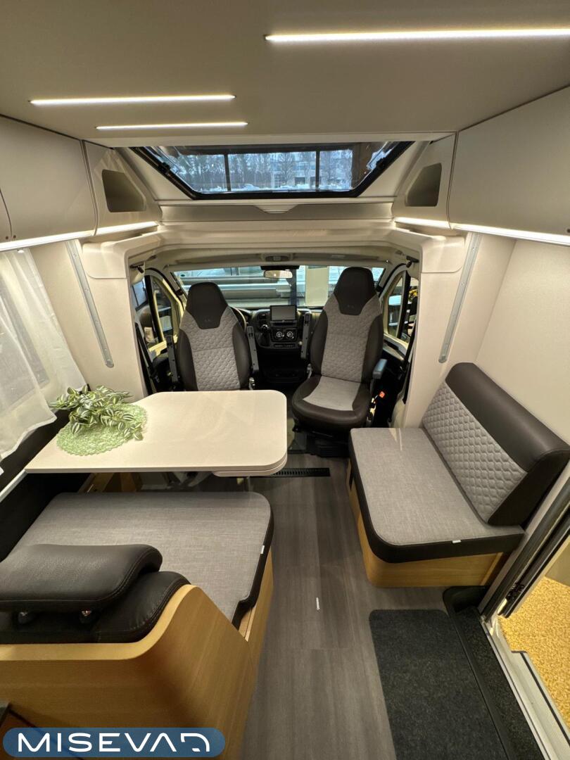 Auton etuosasta löytyy viihtyisä ja valoisa pöytäryhmä sivusohvalla. Kääntyvien etuistuinten ansiosta pöydän ympärille mahtuu mukavasti 5 henkeä menneitä muistelemaan ja tulevaisuutta suunnittelemaan. Lisää makuupaikkoja saa sähköisesti laskeutuvat vuoteen avulla.