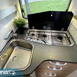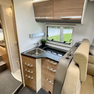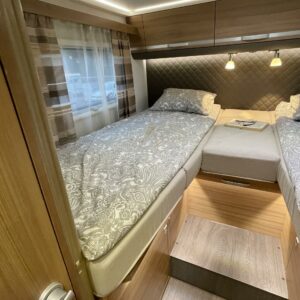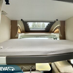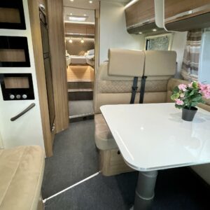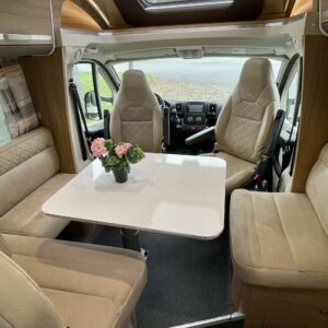 Auton etuosasta löytyy valoisa ja viihtyisä pöytäryhmä, jonka ympärille mahtuu mukavasti 6 ihmistä. Lisää makuupaikkoja saa helposti katosta sähköisesti laskeutuvan parivuoteen ansiosta.