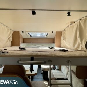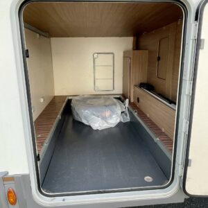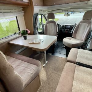 Mukavilla metreillä oleva Adria jossa takana hulppea tallitila, edessä istuinryhmän päällä alaslaskettava parivuode