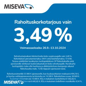 Kiinteä korko koko sopimusajalle vain 3,49 %. Perustamiskulu 349 €, käsittelykulu 15 €/kk, Sopimusaika jopa 72kk. Voimassaoloaika 26.9.2024 – 13.10.2024