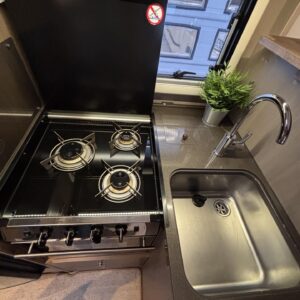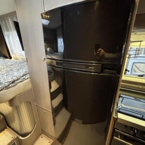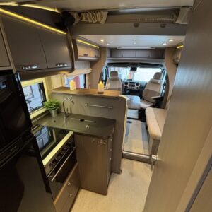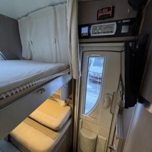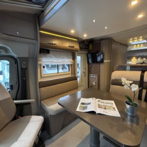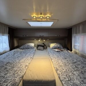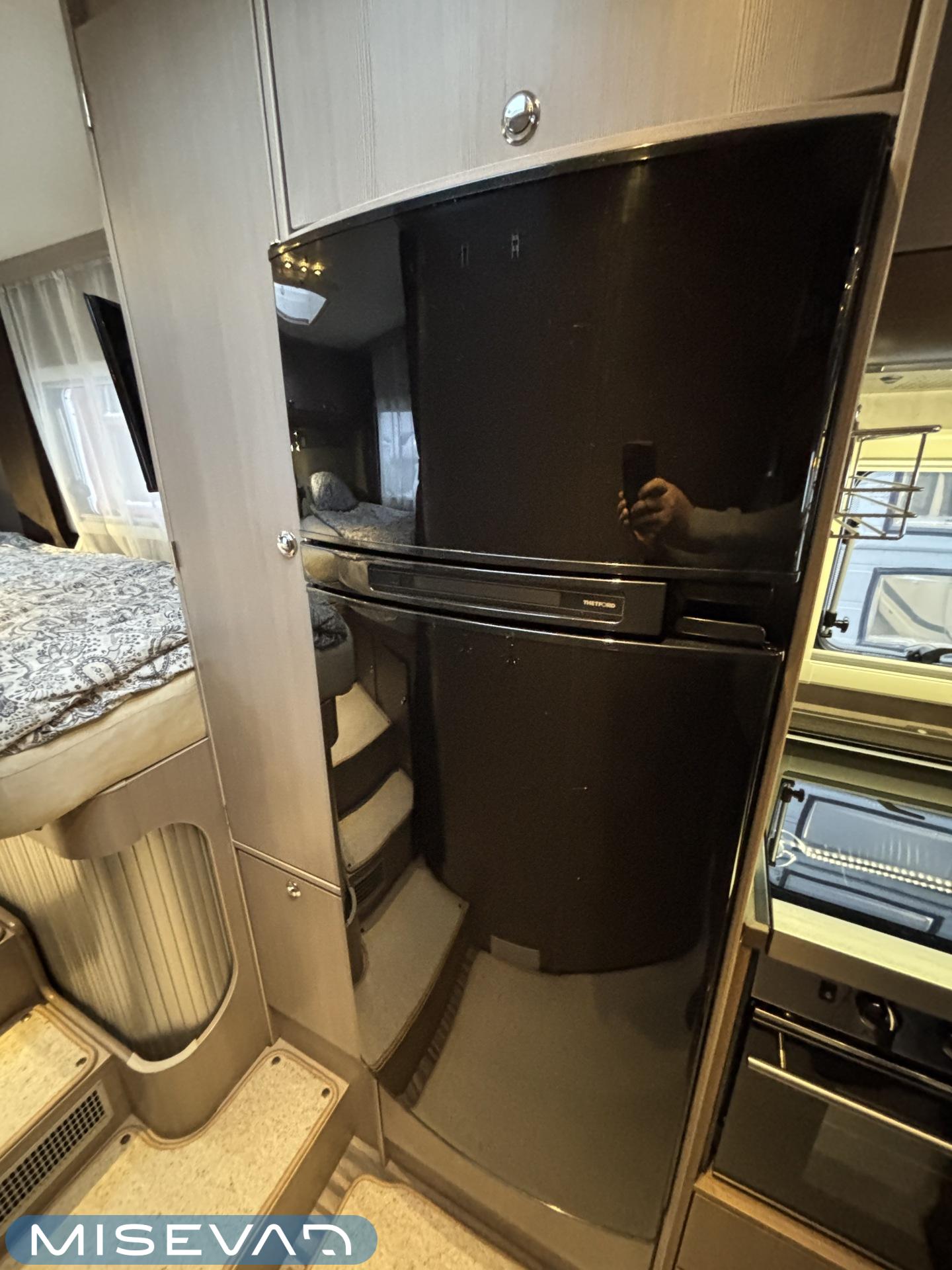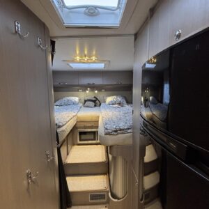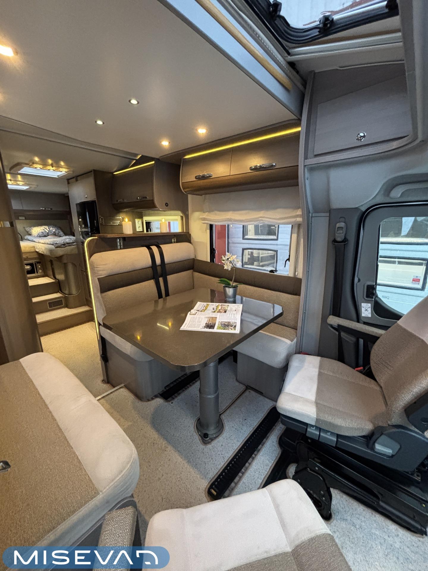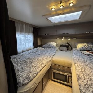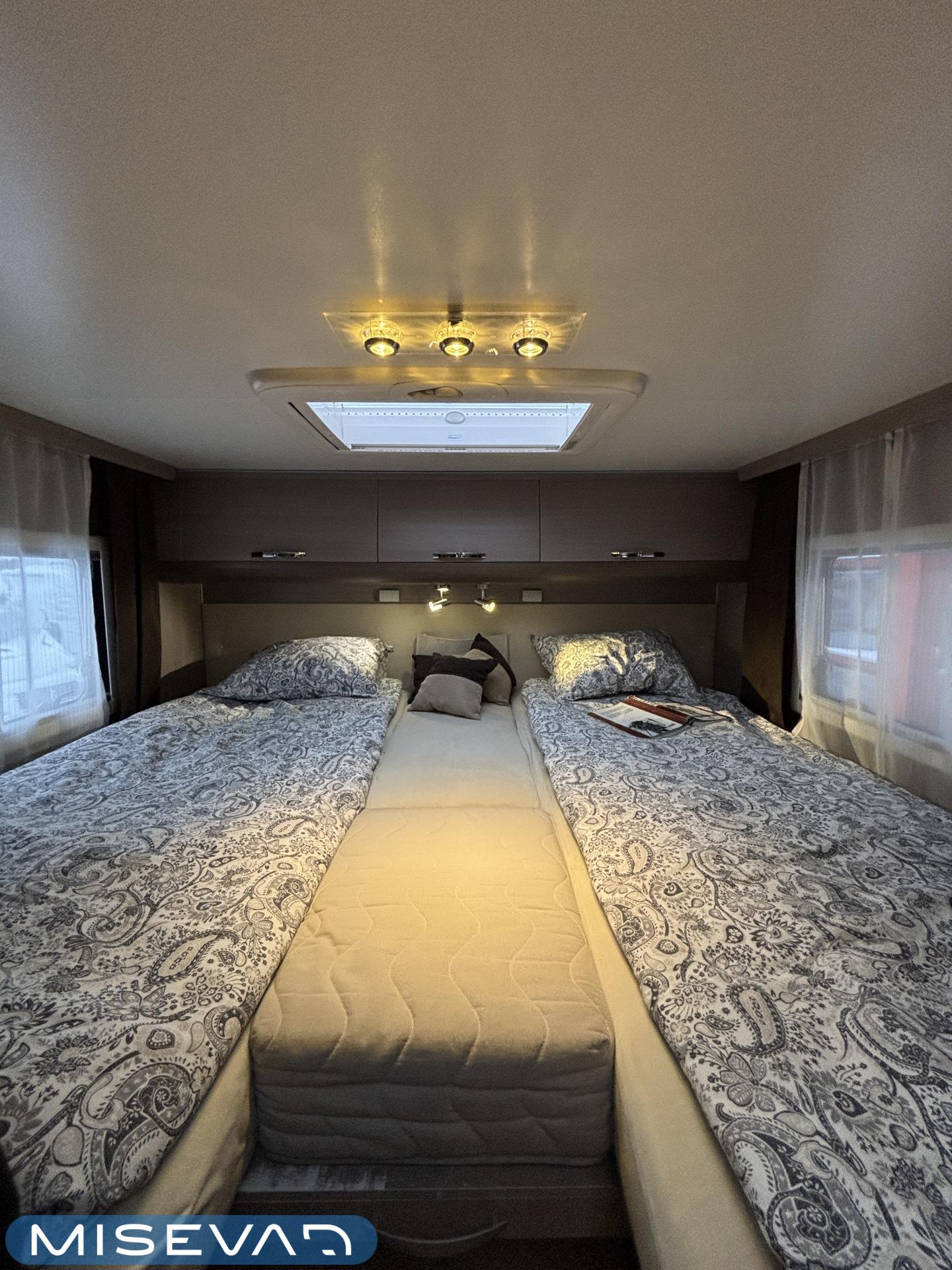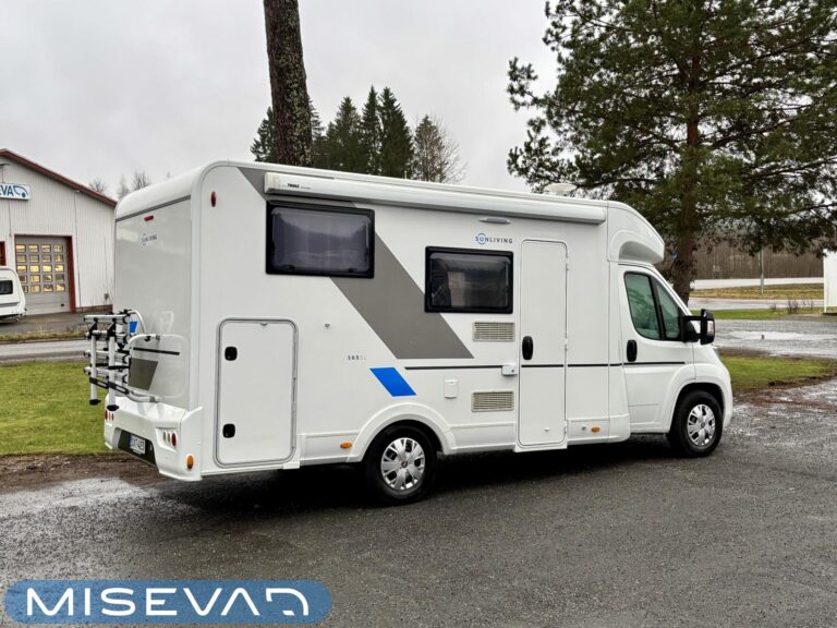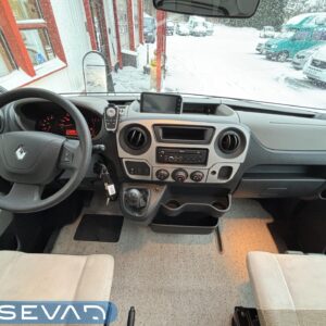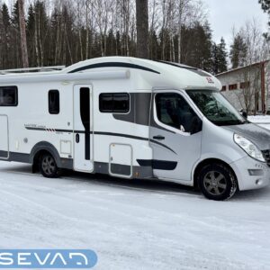 Adrian Matrix Supreme mallisarjan puoli-integroitu matka-auto hillityllä ajomäärällä hillittömällä varustelulla. Vaikka tämä ”reiluhkon” kokoinen auto tarjoaa todella hulppeat tilat reissun päälle, niin tämä on silti ohjastettavissa ihan normaalilla B-luokan (henkilöauto) ajokortilla. Takaosassa on erillisvuoteet mitkä tarvittaessa pystyy yhdistämään lisäpalan avulla yhdeksi jättivuoteeksi. Kampetta mahtuu mukaan vuoteiden alle jäävään takatalliin ja osa säilytystiloista on operoitavissa myös auton sisäpuolelta. Keskelle autoa asettuu L-keittiö isolla jääkaapilla ja kaasu-uunilla varustettuna. Toiselta sivulta löytyy kylppäritilat missä on erillinen suihkutila. Etuosaa hallitsee L-sohva minne yhdistyvät kipparinpenkit, sekä kahden istuttava sivusohva. Pöytäryhmästä saadaan myös tarpeen tullen värkättyä lisävuode. Ryhmän yläpuollella on laskuvuode minne mahtuu nukkumaan kaksi henkilöä. Huomattavaa on, että vaikka laskuvuode on alhaalla, niin se ei hankaloita sisäänkäyntiä. Koko komeus lämpenee Alden nestekeskuslämmityksen avulla ja nestekierto on myös lattiassa. Järjestelmästä löytyy tietysti myös sähkövastukset, sekä lämmönvaihdin. Sähköpuolelle on ”hifistelty” lisäpotkua 140Ah AGM akun avulla, aurinkopaneelilla, sekä etäohjattavalla invertterillä. Valmiiksi asennettuna on myös markiisi, pyöräteline ja kaasun ulosotto. Alustan virkaa toimittaa 150 hevosvoimainen Renault Master ja jämäkkyyttä menoon on lisätty taka-akselilla olevilla lisäilmajousilla. Ohjaamossa tietysti ilmastointi, sähköllä lasit ja peilit, vakkari, navigaattori ja peruutuskamera. Varsin mallikkaan kunnon omaava auto. Tulehan tutustumaan ja ihastumaan.