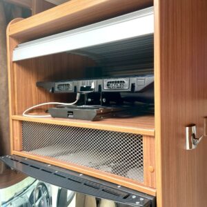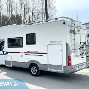 Suuri takatalli on käytettävissä molemmin puolin autoa, lisäksi kotelomarkiisi ja pyöräteline ovat valmiiksi asennettuina.