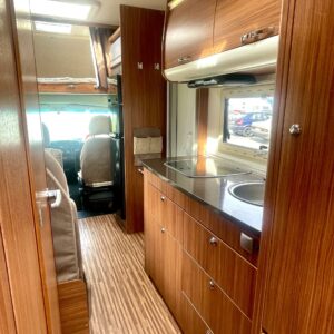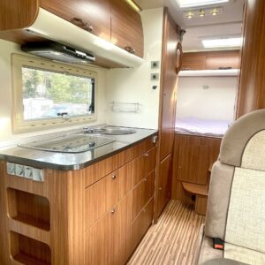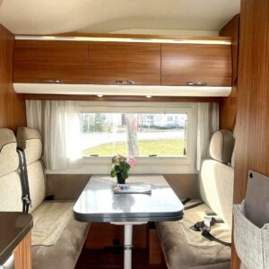 Etuosassa on istuinryhmä neljälle ja toisella puolella käytävää suuri jääkaappi sekä kaasu-uuni. Keskiosassa on tilava keittiö ja runsaasti kaappi- sekä laskutilaa. Perää kohti mentäessä tulee vastaan tilava kylpyhuone, missä erillinen suihkukaappi. Aivan taka-osassa omassa rauhassaan sijaitsee poikittainen parivuode.