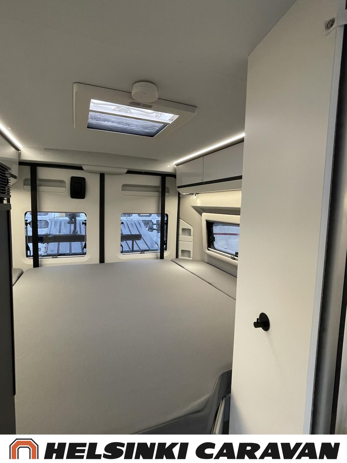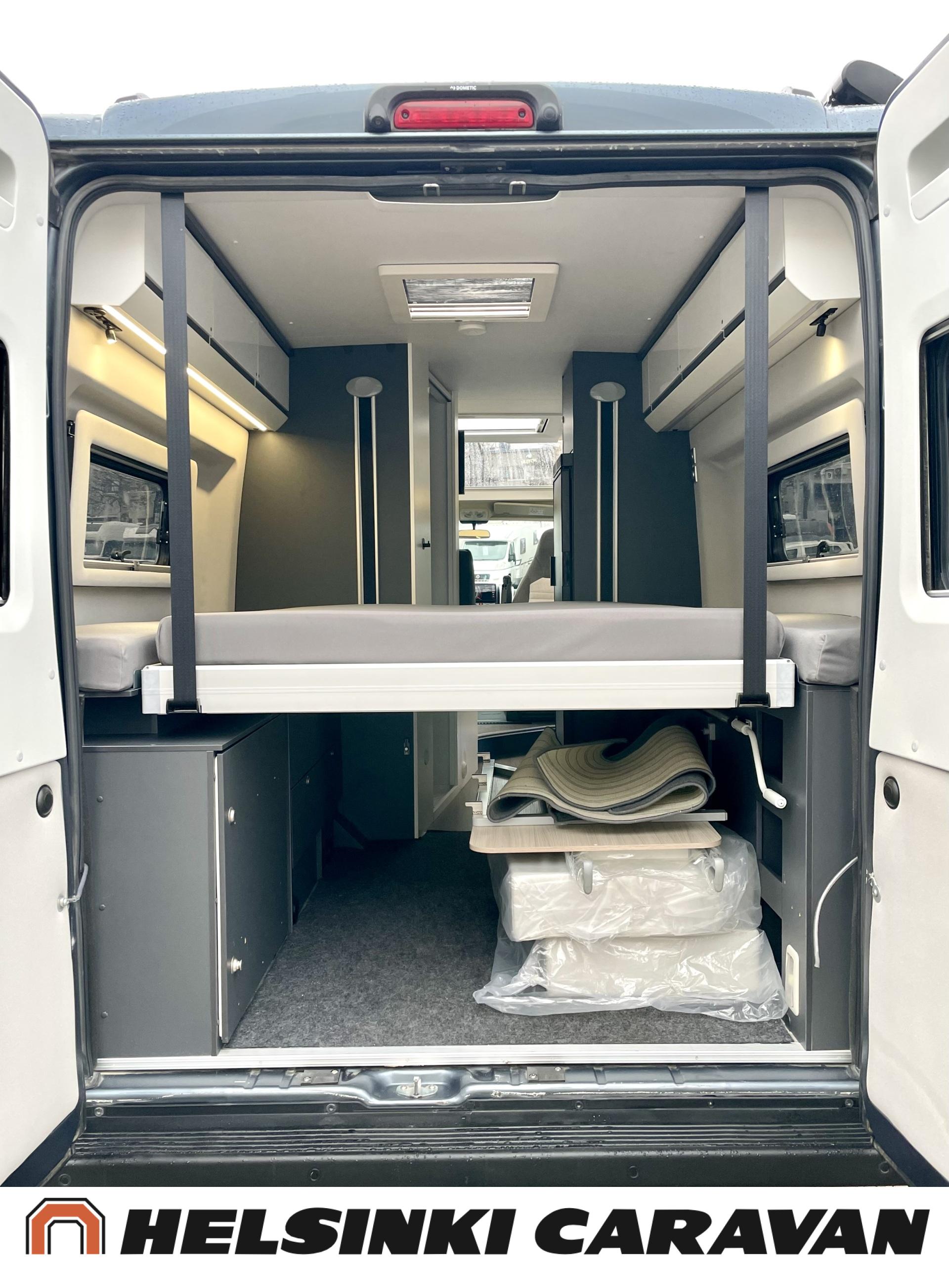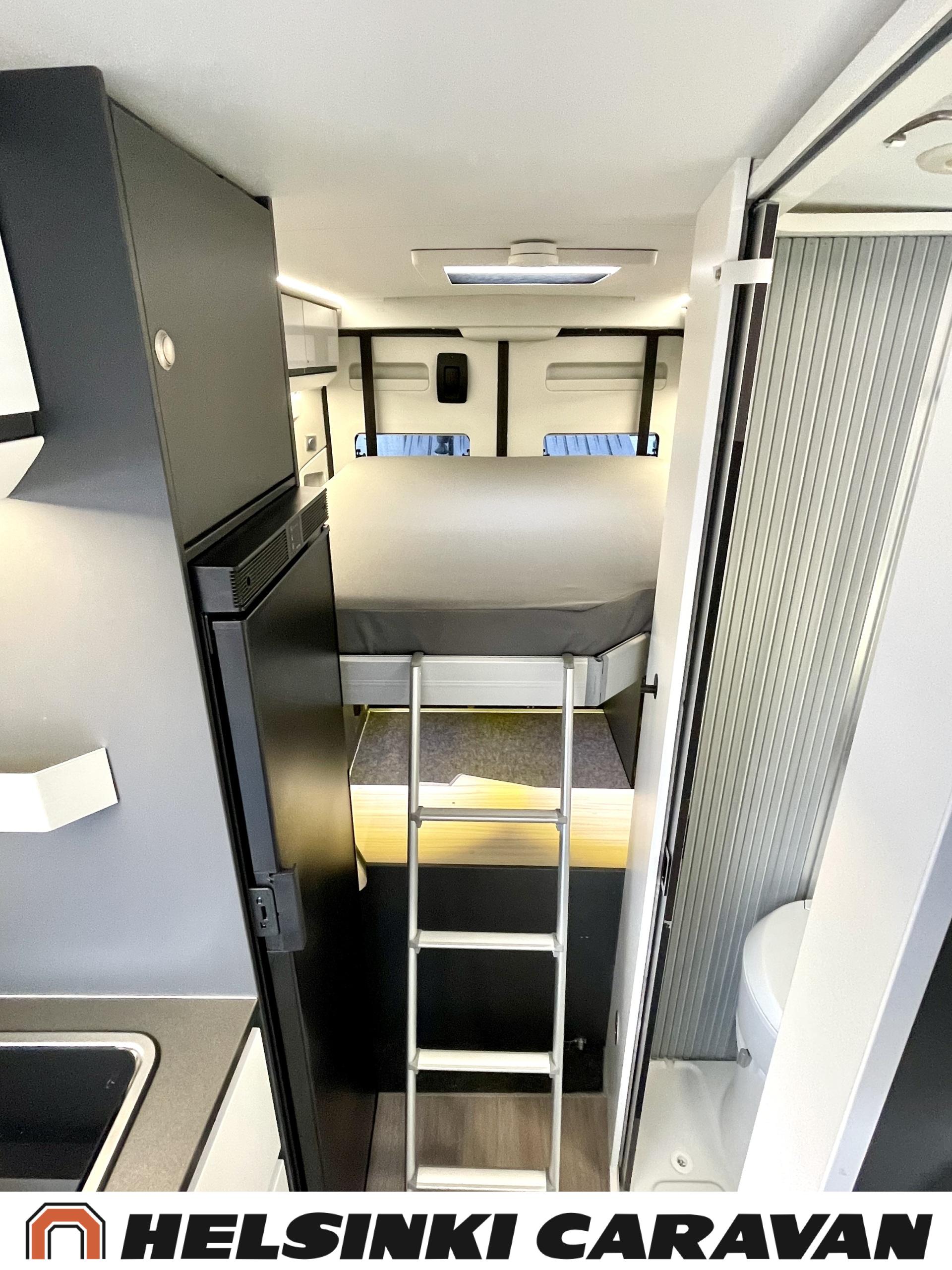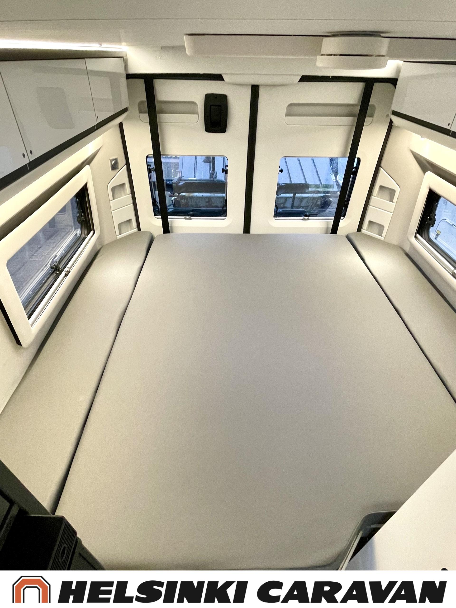 Nyt tarjolla retkeilyautojen Supreme-luokan aatelia harvinaisella nostovuodepohjaratkaisulla. Autosta löytyvät kaikki huippuluokan mukavuudet multimediajärjestelmästä vetokoukkuun, väkevä 160-hevosvoimainen moottori ja moderni 9-vaihteinen automaattivaihteisto. Loft-tyyppiset, tyylikkäät ja avarat sisätilat epäsuoralla LED-valaistuksella ja panoraama-kattoikkunalla tekevät autosta kokoistaan suuremman. Auton perässä on nerokas sähkövoimalla ylös nostettava parivuode, jonka ansiosta tavaratilassa kulkee seikkailuihin mukaan mitä vain krossipyörästä tai kumiveneeseen. Keittiön varustukseen kuuluu kaasulieden lisäksi tehokas kompressorijääkaappi. Kylpyhuoneesta löytyy muun varustelun ohella kätevä käännettävä sermi, jonka ansiosta retkeilyautoon on saatu mahtumaan täysikokoinen suihku.