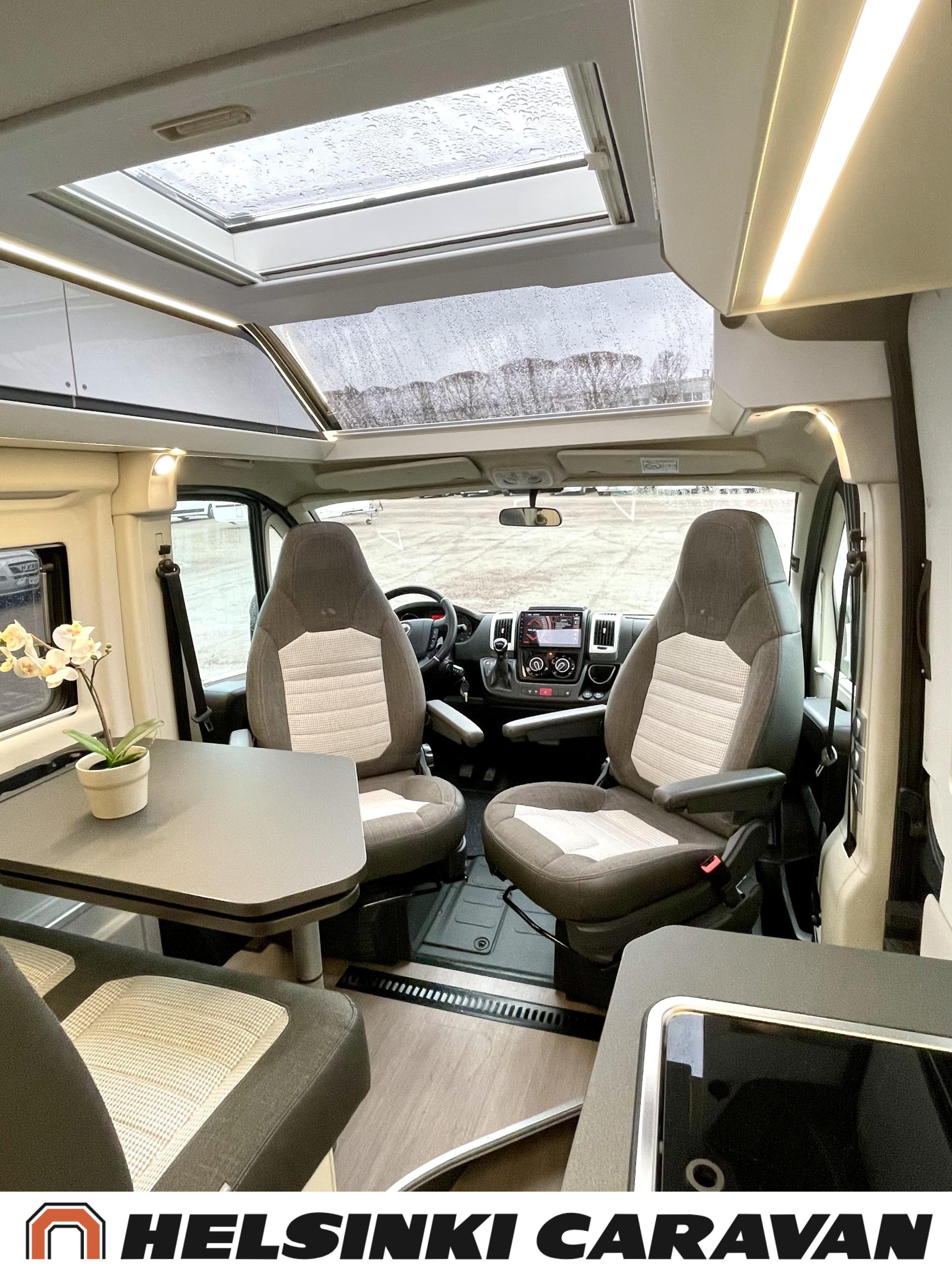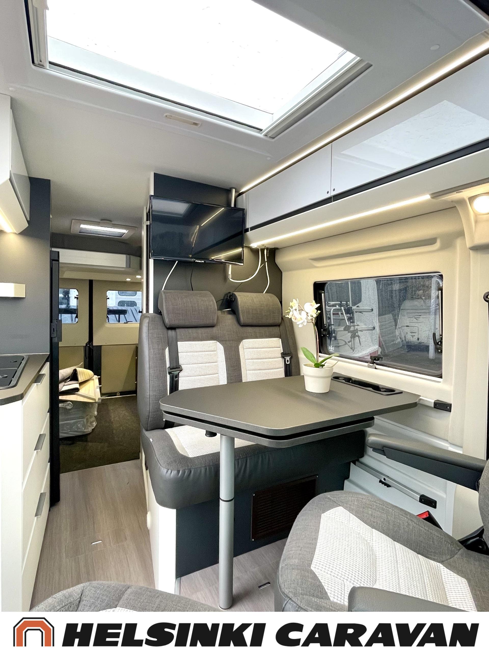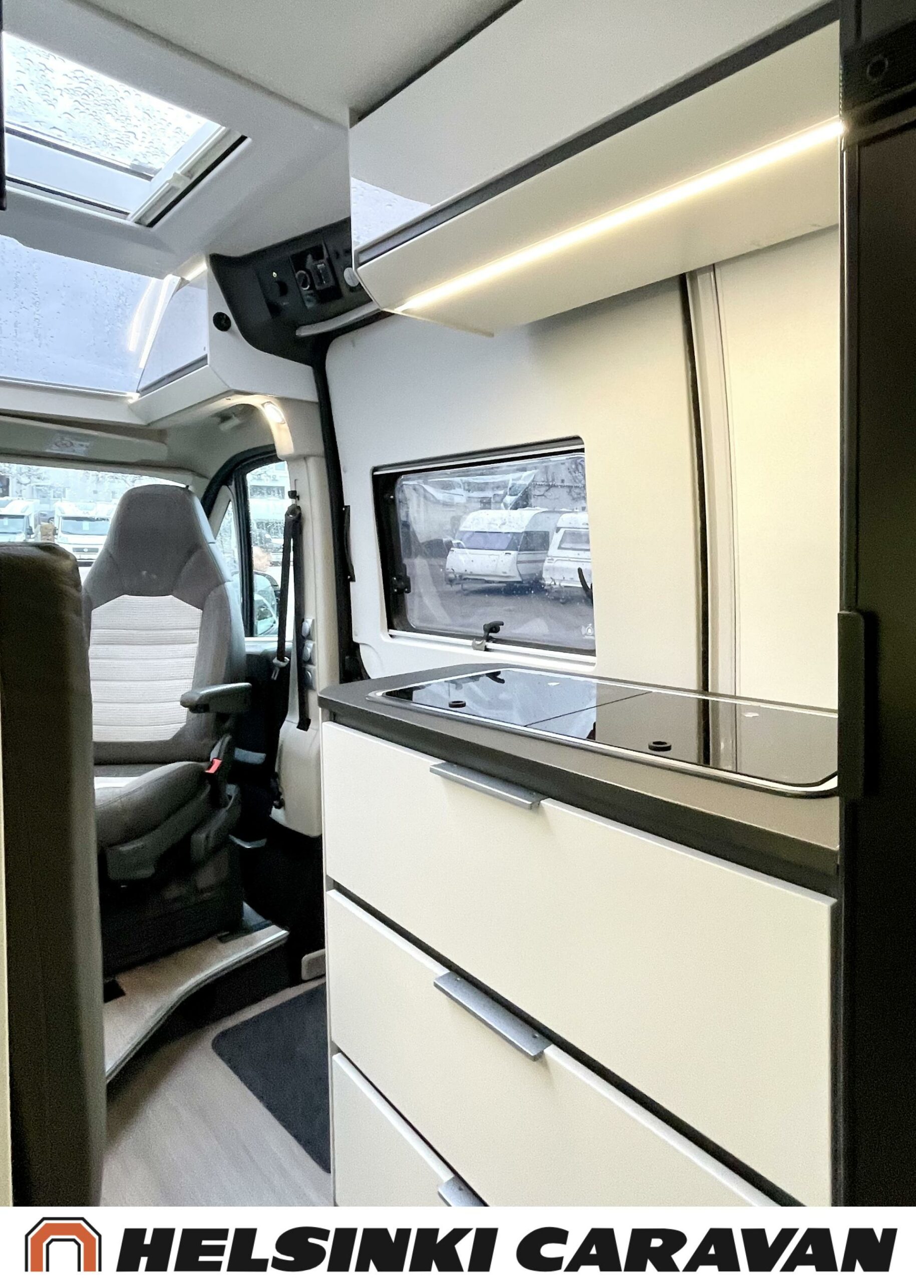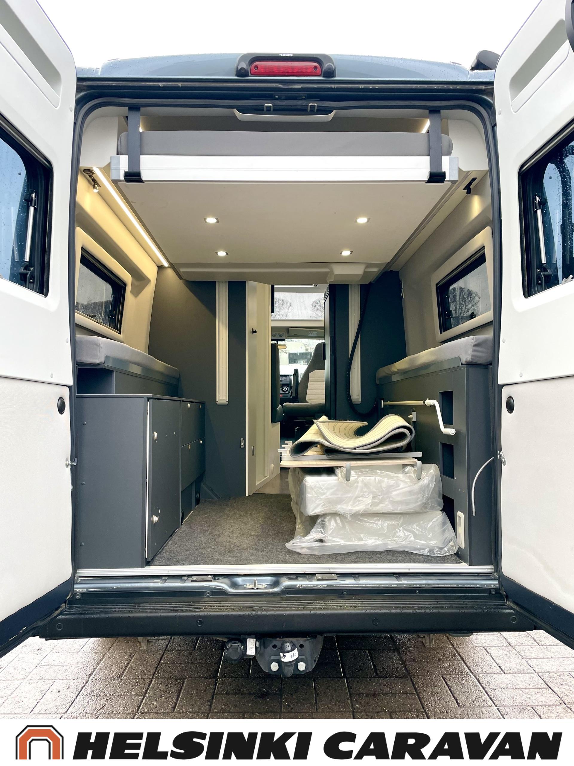 Nyt tarjolla retkeilyautojen Supreme-luokan aatelia harvinaisella nostovuodepohjaratkaisulla. Autosta löytyvät kaikki huippuluokan mukavuudet multimediajärjestelmästä vetokoukkuun, väkevä 160-hevosvoimainen moottori ja moderni 9-vaihteinen automaattivaihteisto. Loft-tyyppiset, tyylikkäät ja avarat sisätilat epäsuoralla LED-valaistuksella ja panoraama-kattoikkunalla tekevät autosta kokoistaan suuremman. Auton perässä on nerokas sähkövoimalla ylös nostettava parivuode, jonka ansiosta tavaratilassa kulkee seikkailuihin mukaan mitä vain krossipyörästä tai kumiveneeseen. Keittiön varustukseen kuuluu kaasulieden lisäksi tehokas kompressorijääkaappi. Kylpyhuoneesta löytyy muun varustelun ohella kätevä käännettävä sermi, jonka ansiosta retkeilyautoon on saatu mahtumaan täysikokoinen suihku.