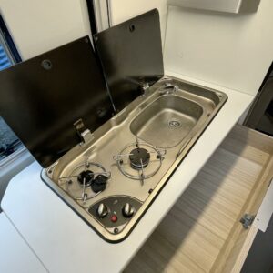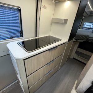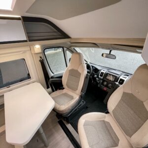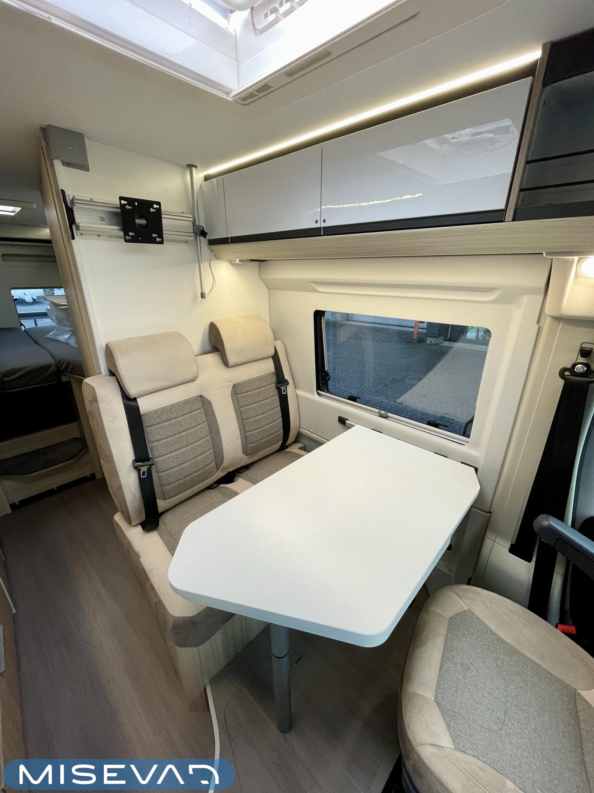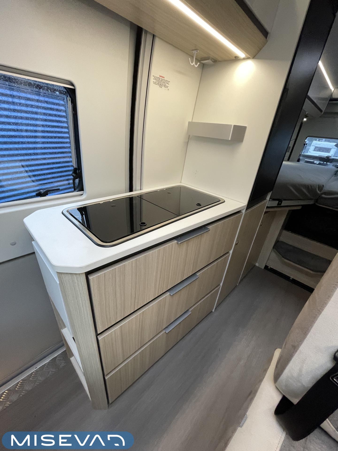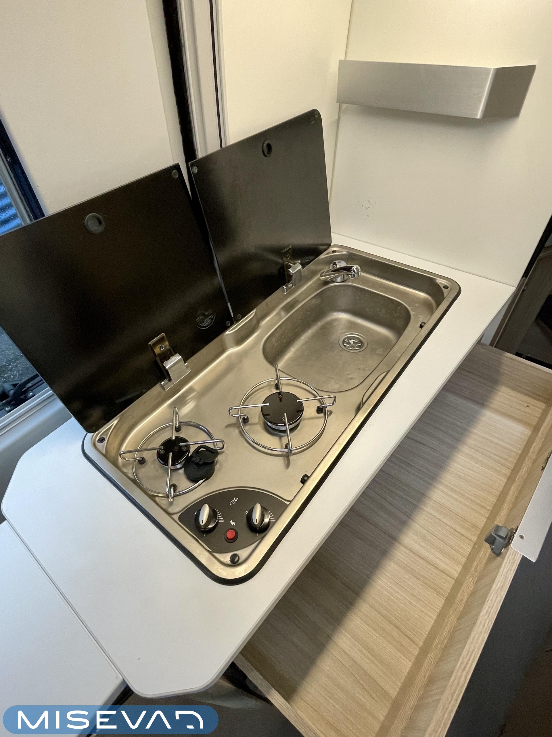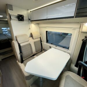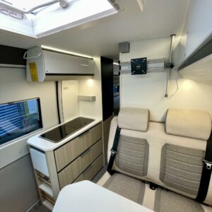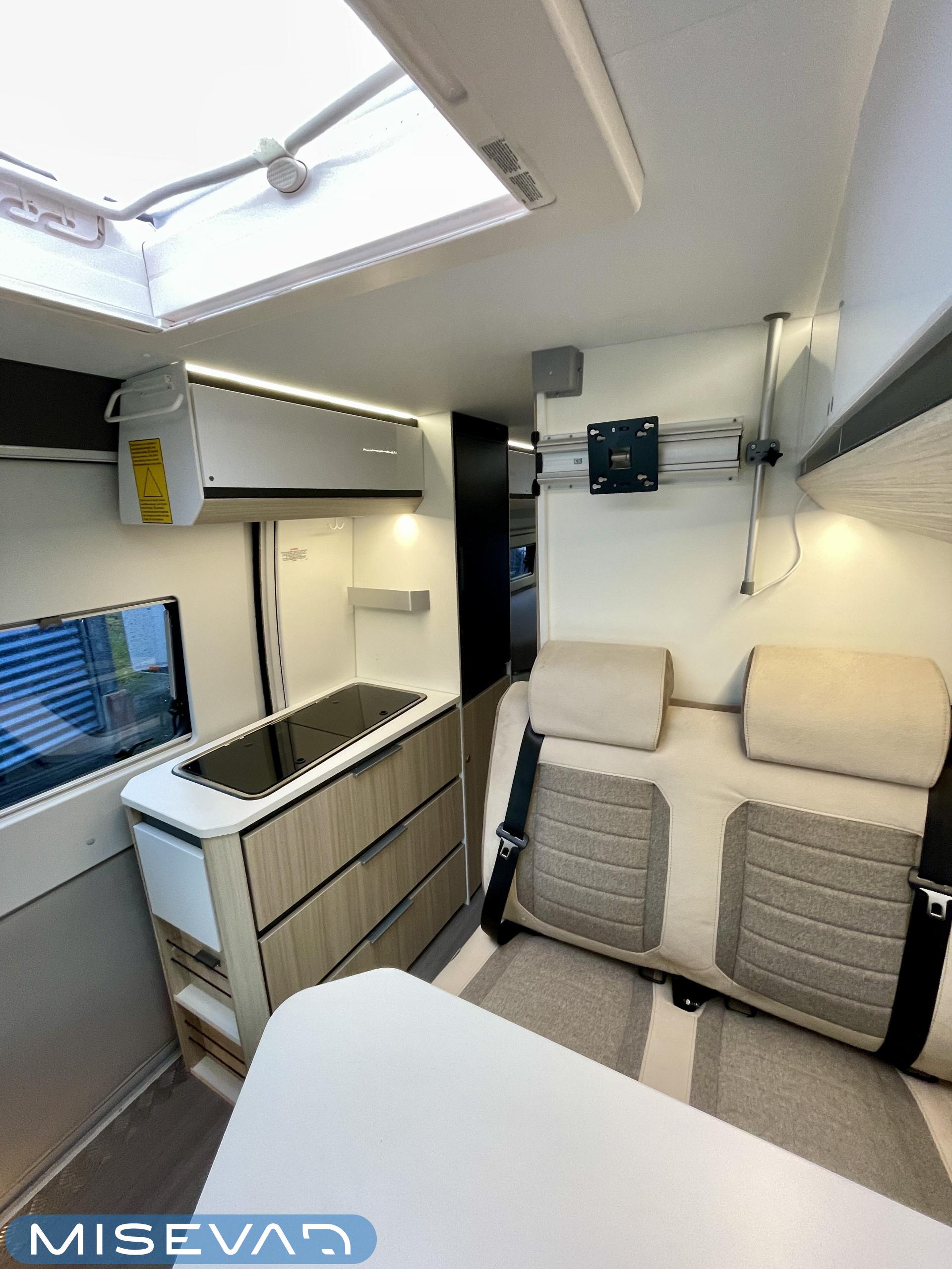 Korkealle sijoitettu jääkaappi ja käytännöllinen liesi tarjoavat hyvät puitteet ruoanlaittoon myös tien päällä. Mukava istuinryhmä kutsuu rentoutumaan pitkän päivän päätteeksi.