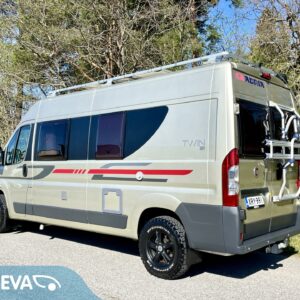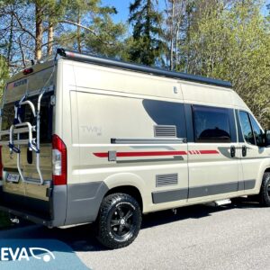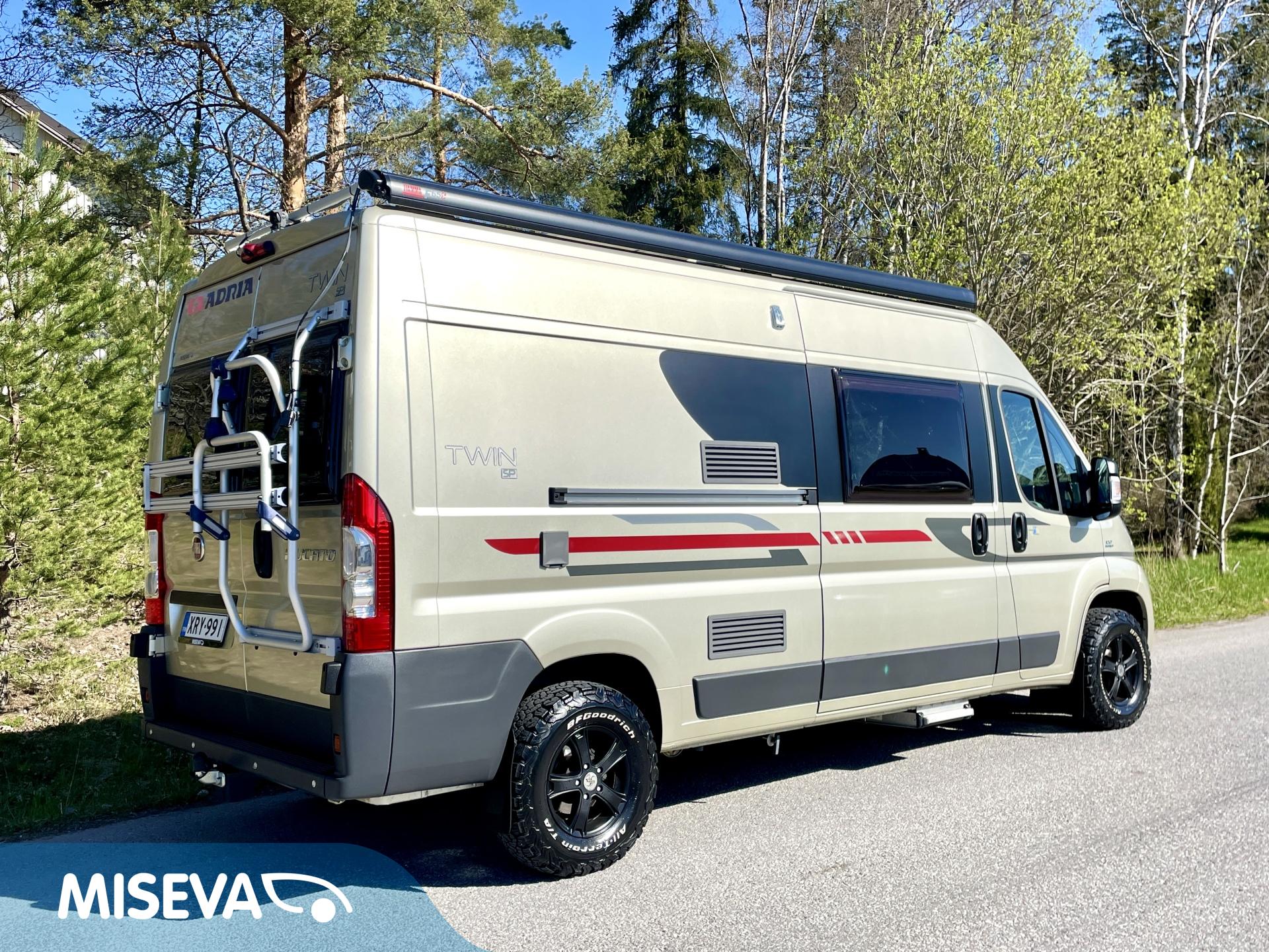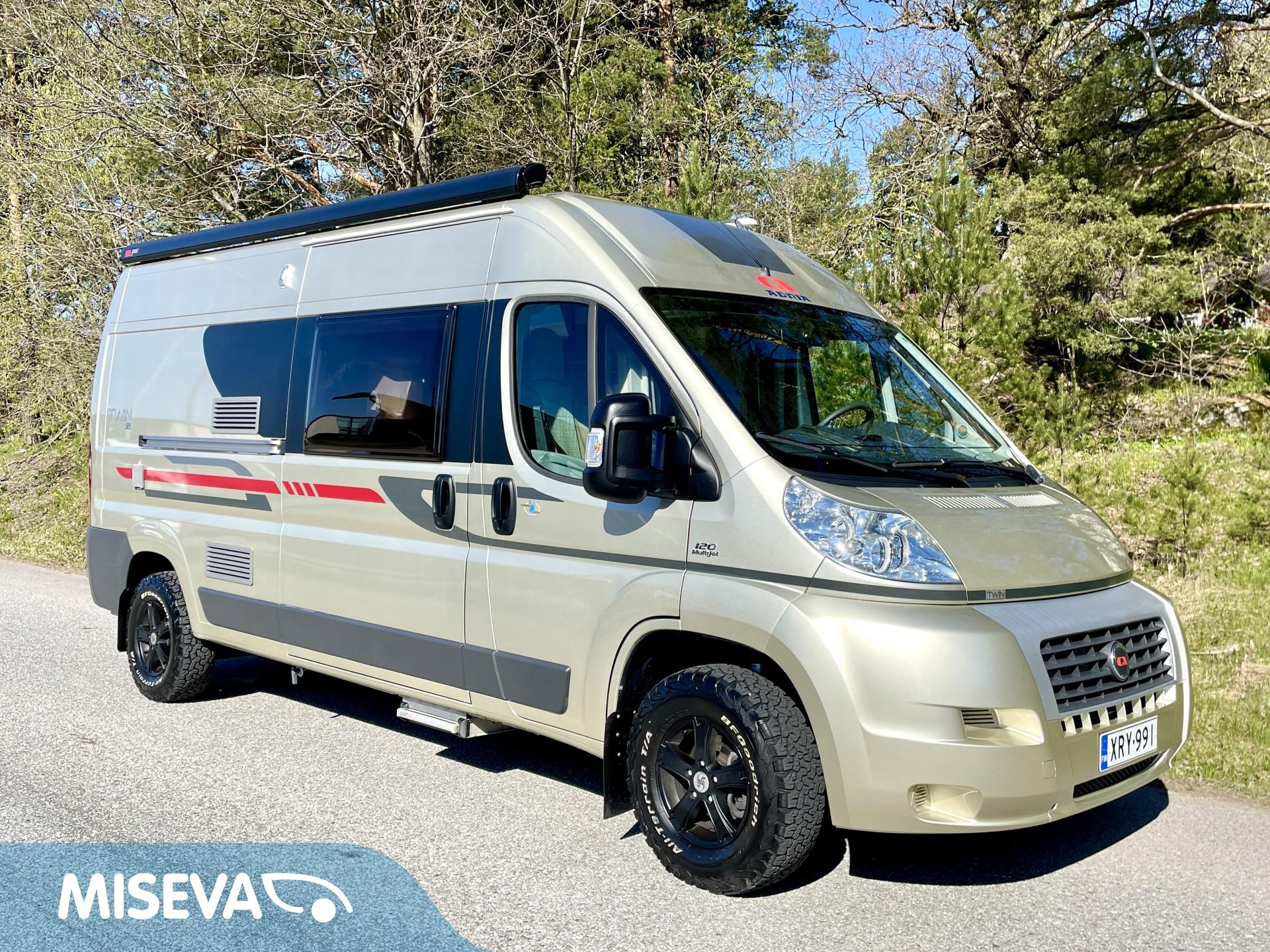 Vähän ajettu suosikki Adria Twin. Omien polkujensa kulkijalle maastoon kuin maastoon ja omavaraisuuden takaa aurinkopaneeli.
