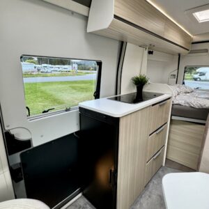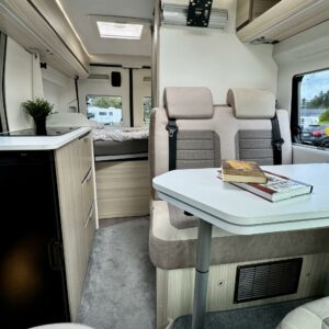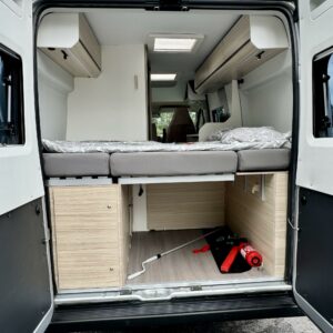 Takapäässä on poikittainen parivuode ja tavaratila johon on pääsy sekä auton sisä- että ulkopuolelta.